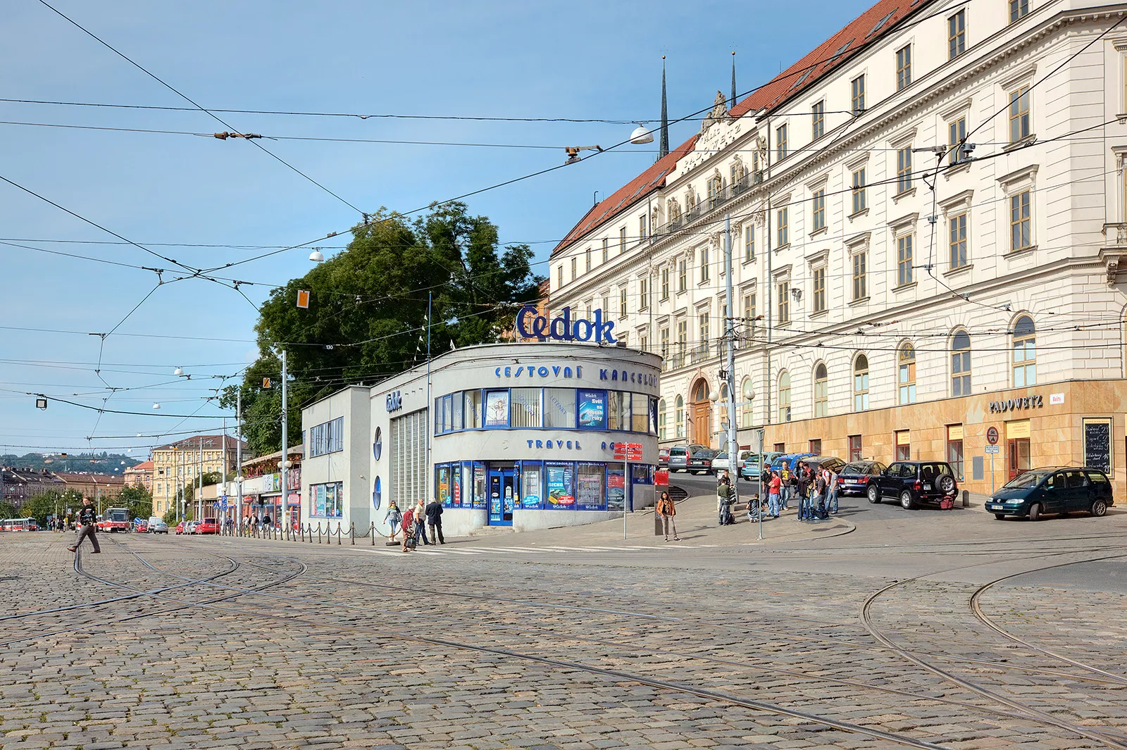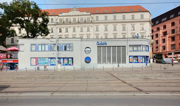 In 1928 the newly built exhibition grounds in Brno hosted the Exhibition of Contemporary Culture, which was a part of the celebrations of the tenth anniversary of the formation of the Republic. The exhibition halls designed by influential Czech architects were accompanied by a number of structures more or less related to the exhibition, but built outside the exhibition center. The City's Accommodation and Information Office designed by Oskar Poříska was built at the site of former town walls near the Brno railway station and offered visitors to fairs the first basic information and basic services such as an exchange office and finding accommodations in the city. Oskar Poříska had devoted some of his earlier designs to this plot opposite the Padowetz Palace in Ba ty Street. In 1926, this former fortification wall was converted into a single-level building featuring shops and public restrooms, the roof of which was used as a terrace widening the street. The two-story building of the City's Accommodation Office adjoins the commercial areas and its rounded corner resembles the bow of a ship. The front part of the building with its separate entrance and ribbon window upstairs housed the exchange office; the entrance to the accommodation office (later a travel agency) was situated on the side next to the then largest glass block window in Brno providing light to the elevated hall of the office and the gallery. The present appearance of the building, which reflects the nautical inspirations of the international style, is the result of many modifications and reconstructions. The main entrance was moved to the right and replaced one of the glass block fields as early as the 1940s; an extension was later built on top of the ground-floor commercial part. Reconstruction in the 1990s renewed the glass block wall as well as the corner ribbon windows and added round windows in the side facade and in the interior as an "enhancement" of the functionalistic esthetics. The building continues to serve as a travel agency to this day.