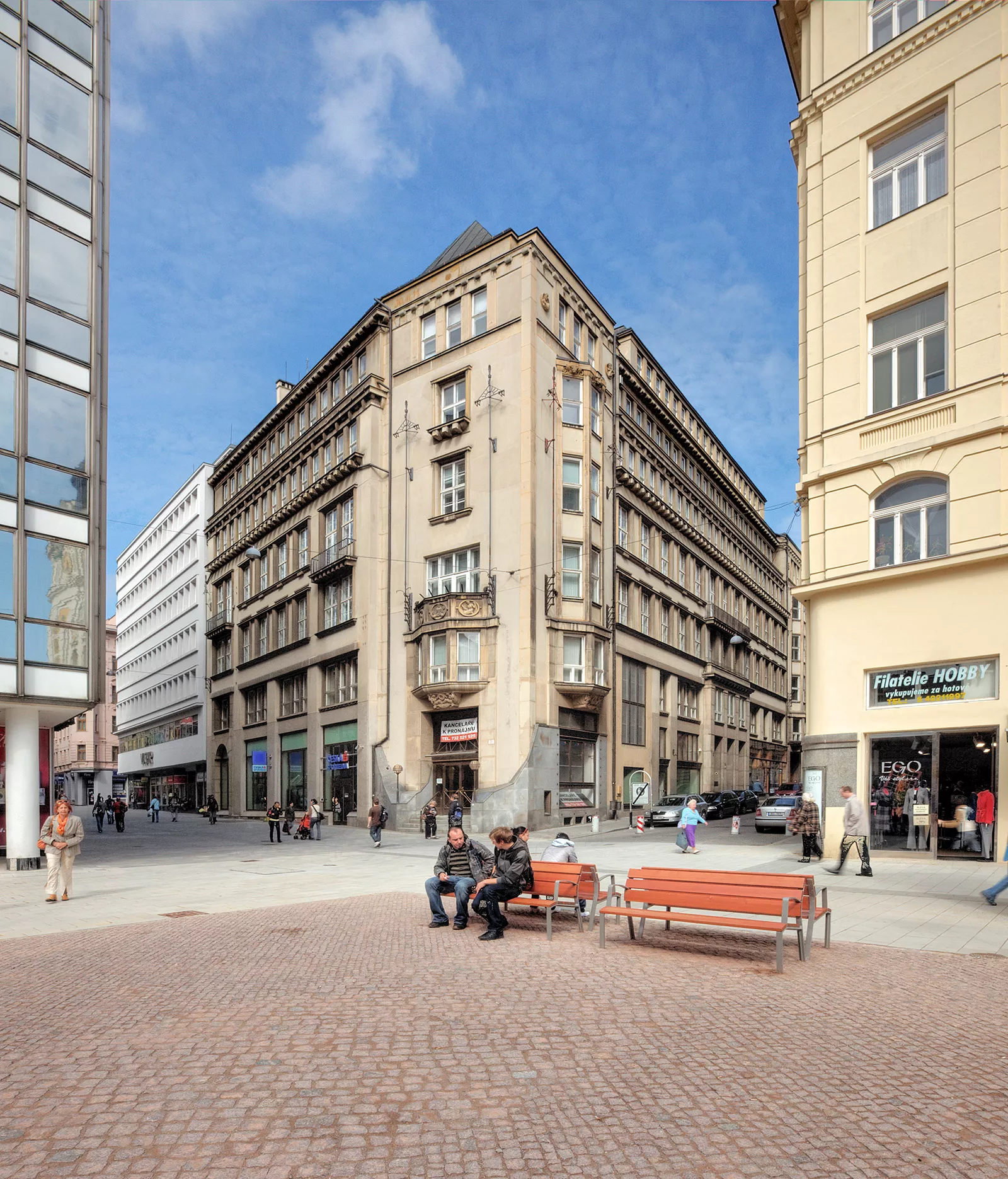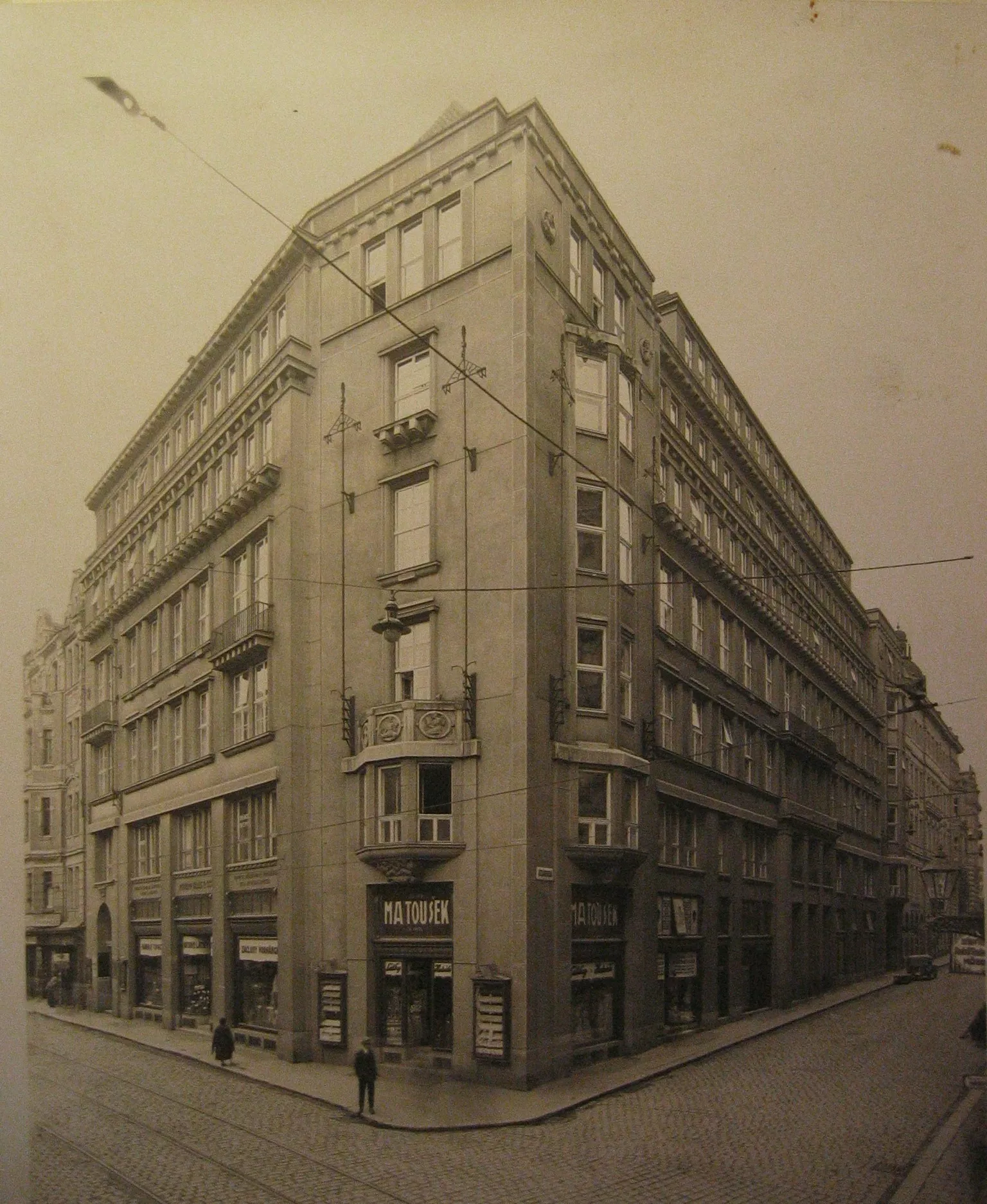 After the dissolution of Austria-Hungary, the management of the Mining and Metallurgic Company decided to move its headquarters from Vienna to newly formed Czechoslovakia in order to retain control over its mines in northern Moravia. They chose Brno as their new seat due to its proximity to Vienna, and had the buildings of the directorate general, two villas for the managers and an apartment building for the staff designed by Vienna-based architect Karl Lehrmann built in the city. The corner building of the directorate at the intersection of Kobližná and Sukova streets was designed as a multi-purpose facility serving both the company and the general public. The requirement for the representative nature of the building was satisfied by a Classicist monumental design in the spirit of Vienna modernism and late historicism; the advanced ferro-concrete skeleton enabled the erection of the tallest building in Brno at the time. The facades are segmented by prominent cornices with dentil and decorated with polygonal arches with special relief ornamentation. It also features stylized Antique-style figures bearing the company's logo of two crossed hammers and other mining instruments. The corner entrance led to a café on the ground floor, which also housed shops and a marketplace in Sukova Street. It also featured a separate entrance to the company's office areas; the entrance is enhanced by portals with relief decoration of miners' heads wearing helmets. The company's offices located on the floors were accessible from the spacious lobby decorated with pilasters and leading to a spiral staircase, paternoster and elevator. One of the pillars of the staircase features a relief of working miners wearing waist braces by the Viennese sculptor Winkler . .The multi-purpose nature of the building was enhanced by the apartments in the loft.The Mining and Metallurgy Company decided to move its headquarters from Brno to Prague in 1927 and its Brno building was purchased by the Brno Country Capitals Savings Company, whose headquarters designed by Jindřich Kumpošt and situated in Brno – Královo pole were no longer sufficient. Vladimír Fischer designed the modifications necessary for the needs of the savings company and involving moving the main entrance and foyer with a statue of T. G. Masaryk to the corner, from where the main lobby on the mezzanine was accessed. The offices, registry and conference room were situated on the first floor. The current appearance is the result of several later adjustments removing the ground-floor commercial areas with steel display windows and relocating the counters to the ground floor. The RAW studio implemented the successful adaptation of the former marketplace in Sukova Street and the adjustment of the ground floor to suit the needs of the HaDivadlo Brno in 1991.