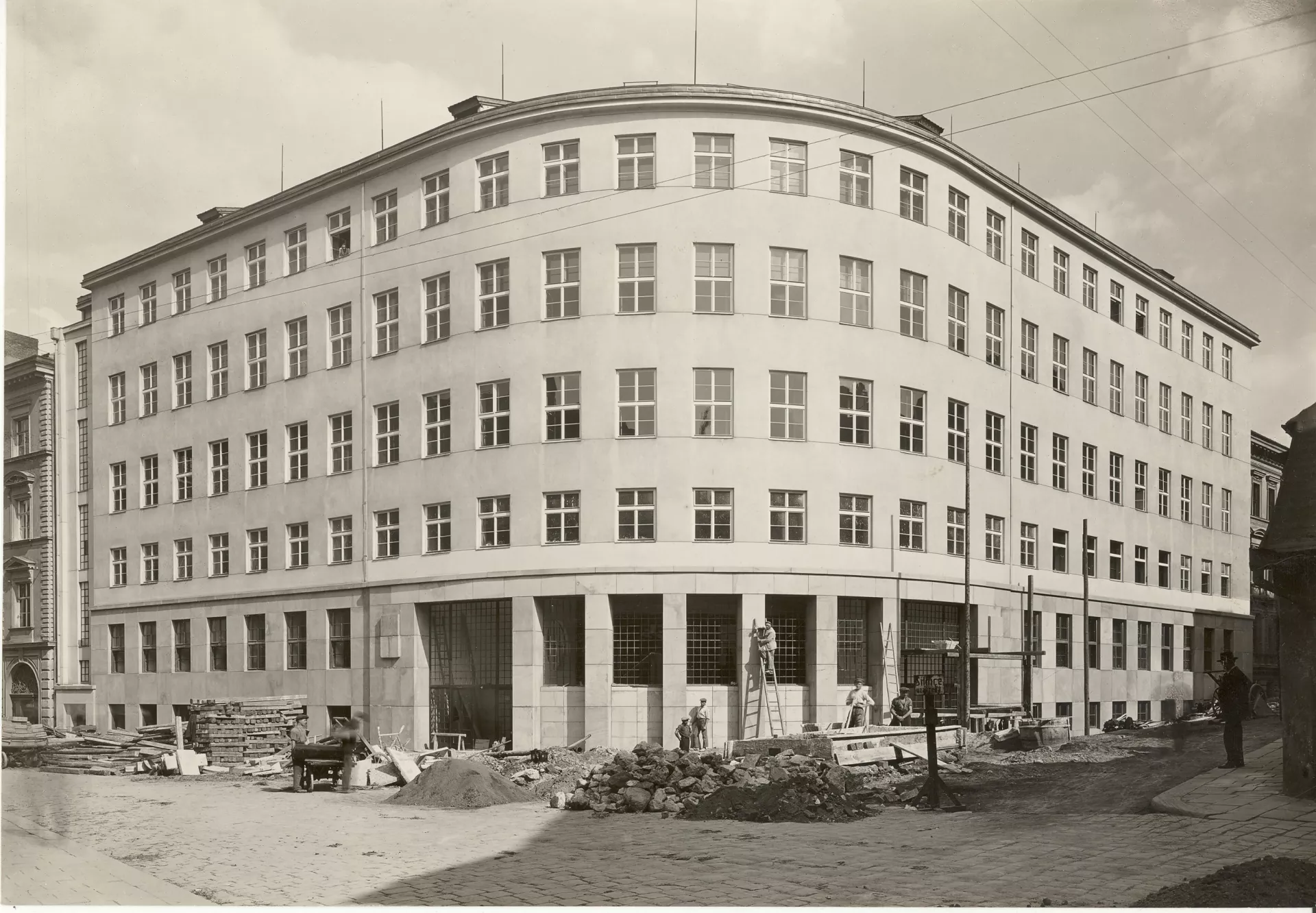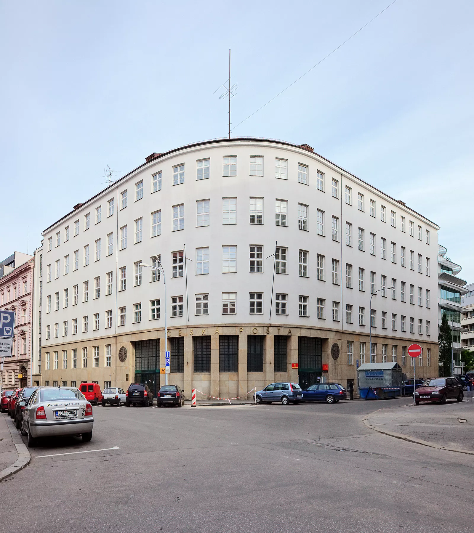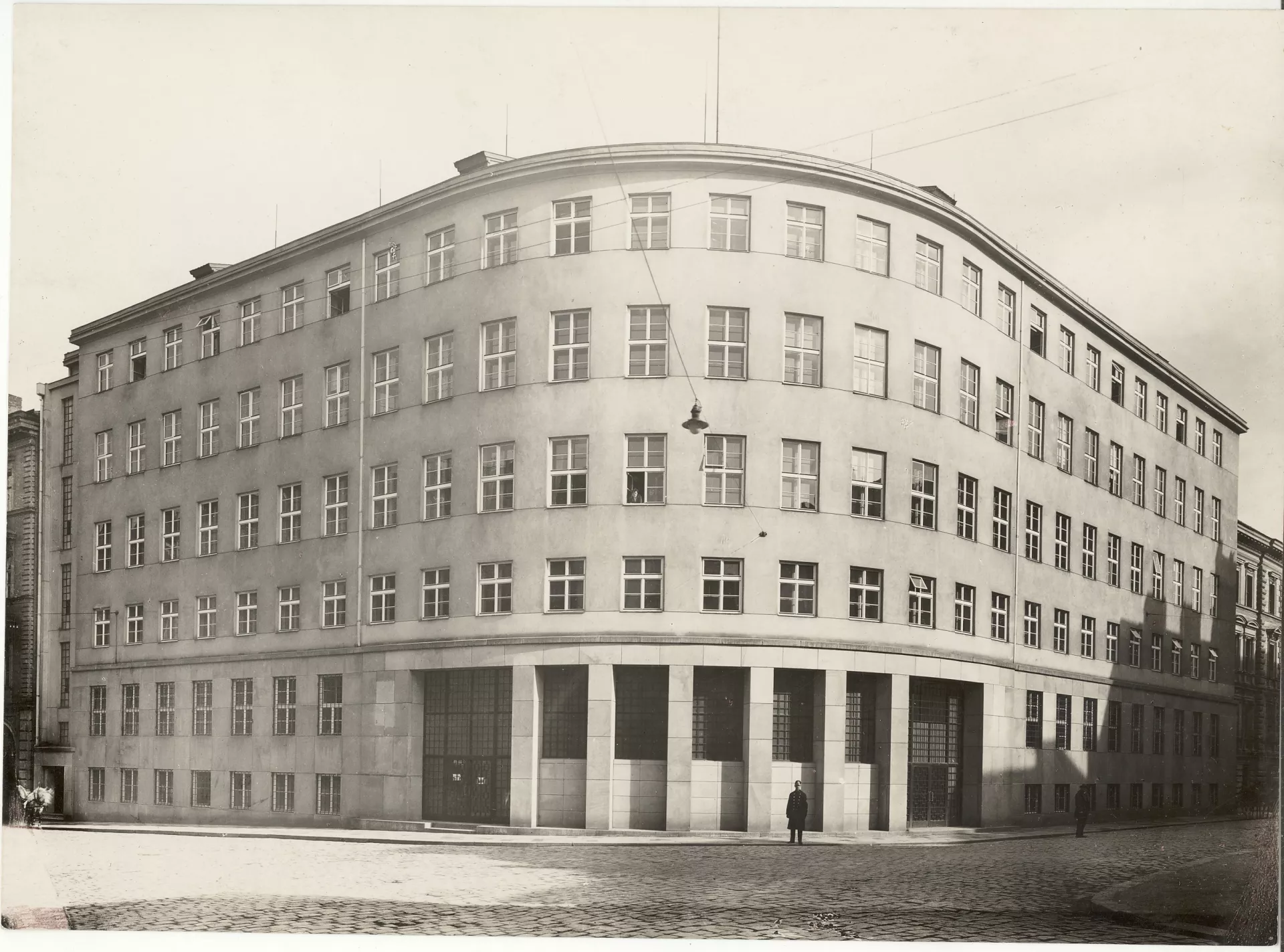 It was necessary to find or build the seats of many newly formed or modernized institutions in the young Czechoslovakia in the first half of the nineteen twenties. The construction and adaptation of buildings was arranged by the Regional Political Administration, which also oversaw the building of the new police headquarters in Orlí Street. The design of the building, whose facade conceals rather complicated operations, was produced by development office staff - architects Jaroslav Grunt and Josef Adolf álek - who were forced to deal with a difficult commission. Older buildings forming a block were demolished on the corner of the present-day Orlí and Bene ova streets; only the Ripka department store by architects Prokop and Augener from 1887 looking out on Bene ova street was preserved. The new six-level police headquarters were linked to the older building, closing the entire block facing Novobranská Street with a curved facade. The smooth, already purist facade conceals three two-tract wings on an A-shaped ground plan with two inner courts. The two main entrances situated symmetrically in the corner lead to a foyer with a staircase and pillars faced with marble; the foyer provides access to the adjoining wings. The wings contained police offices, the passport department, temporary detention cells, the public relations department, document archives, clerk offices, barracks, the deputy's offices and other police offices. The facade of the building is traditionally divided by the tall stone base whose corner pillars balance the horizontal rows of windows. The only relief element in the facade involved two lengthwise Czechoslovak coats of arms by sculptor Josef Kubíček installed at the entrances; unfortunately, these have not been preserved.