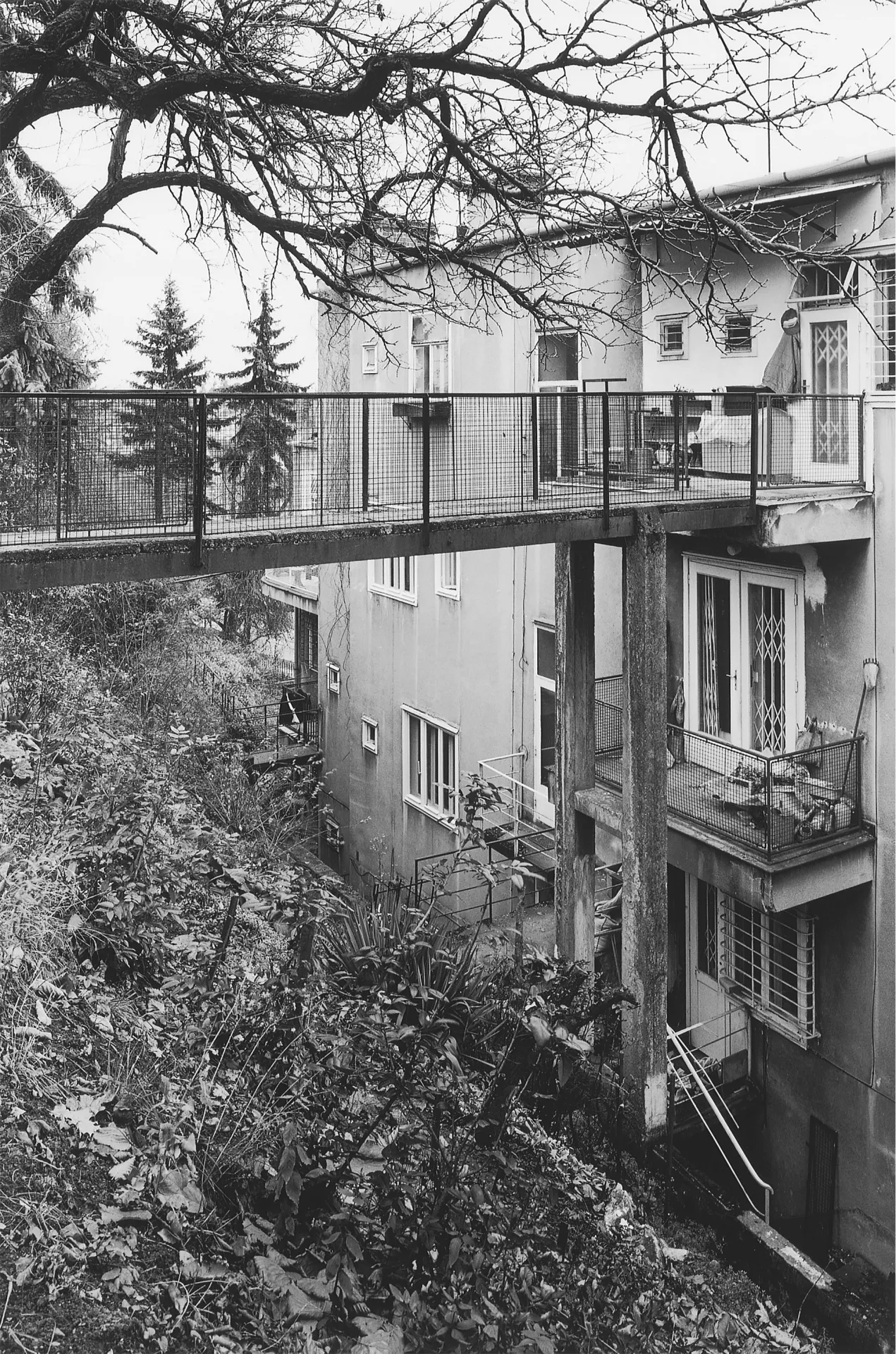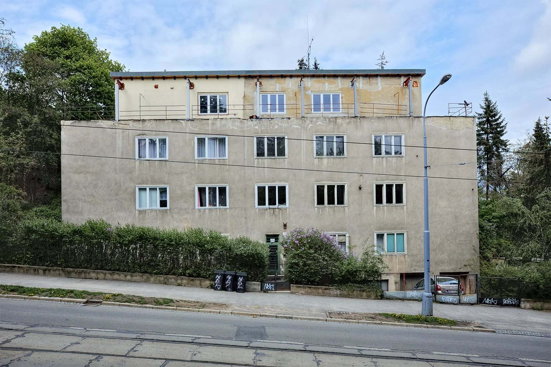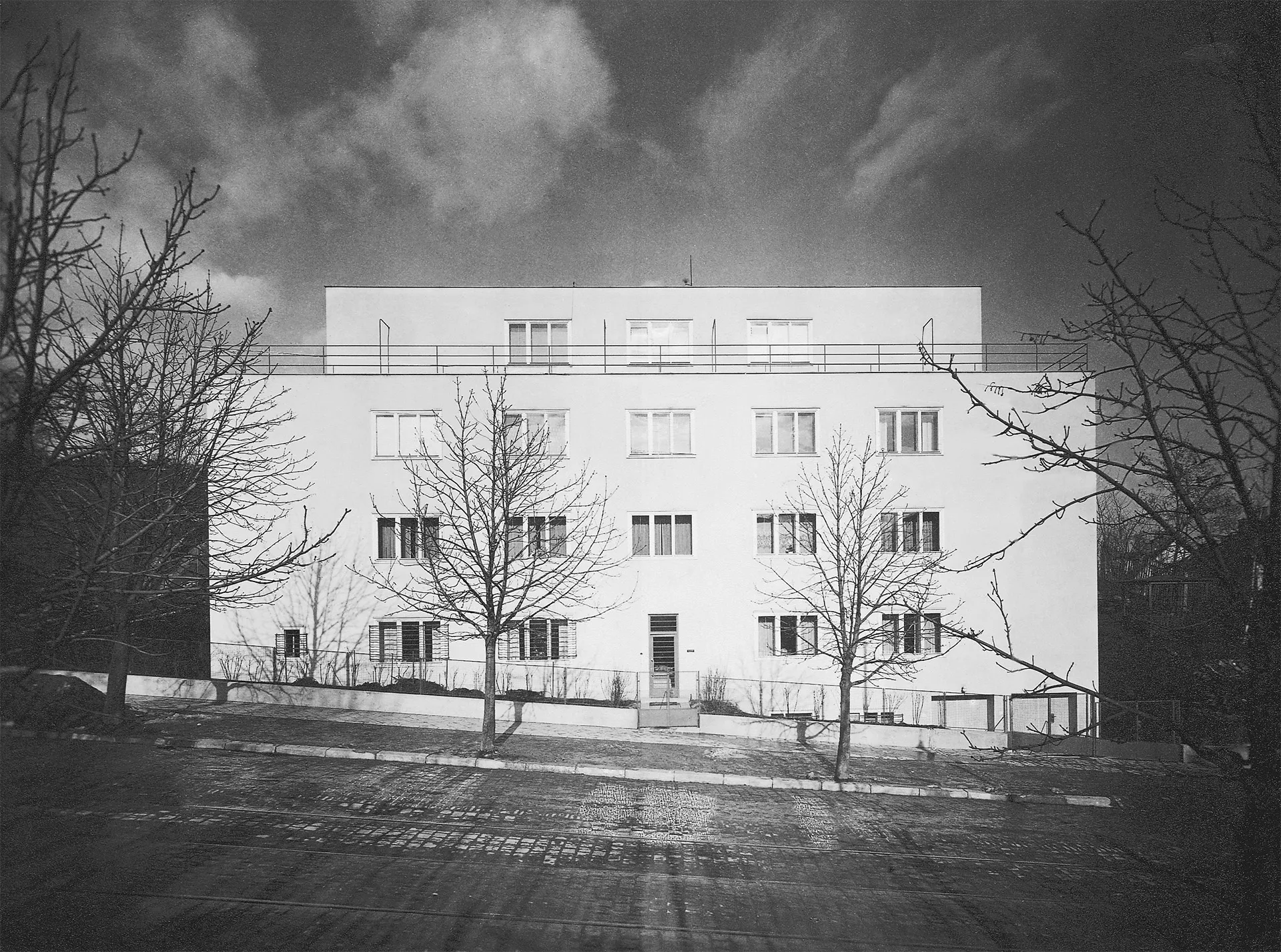 A residential house designed by Otto Eisler representing another building meeting the requirements for the new "international style", was built in Údolní Street ascending the slope of Kraví hora in 1932. The new style is best manifested in the reduction of the role played by the facade down to a mere element encircling an area and providing protection against adverse weather, as well as by the horizontal layout of the mass of the house without seeking esthetic symmetry. The only decoration is found in functional elements and details like railings, window frames, entrances, doors or handles, the quality design and manufacture of which is closely observed. The four-story building on an oblong ground plan was built near the new park. It features three- and four-room apartments; the top story originally housed a single large six-room apartment with a rectangular terrace. In order to connect the interior to the surrounding landscape, Eisler designed subtle footbridges (still existing today) situated on the garden facade and connecting the individual apartments to the adjacent slope. Plans to plant an orchard in the garden were never fully completed. Recently the roof, whose structure was made of bauxite cement, has suffered serious damage. Although this material makes it possible to accelerate construction even in the winter months, its strength degrades in the course of time, which is why some functionalist structures have had to be demolished for stability reasons. In this case, instead of receiving a desirable overall reconstruction, the top floor of the house has undergone some insensitive structural adjustments, mainly due to a lack of cultural heritage protection.