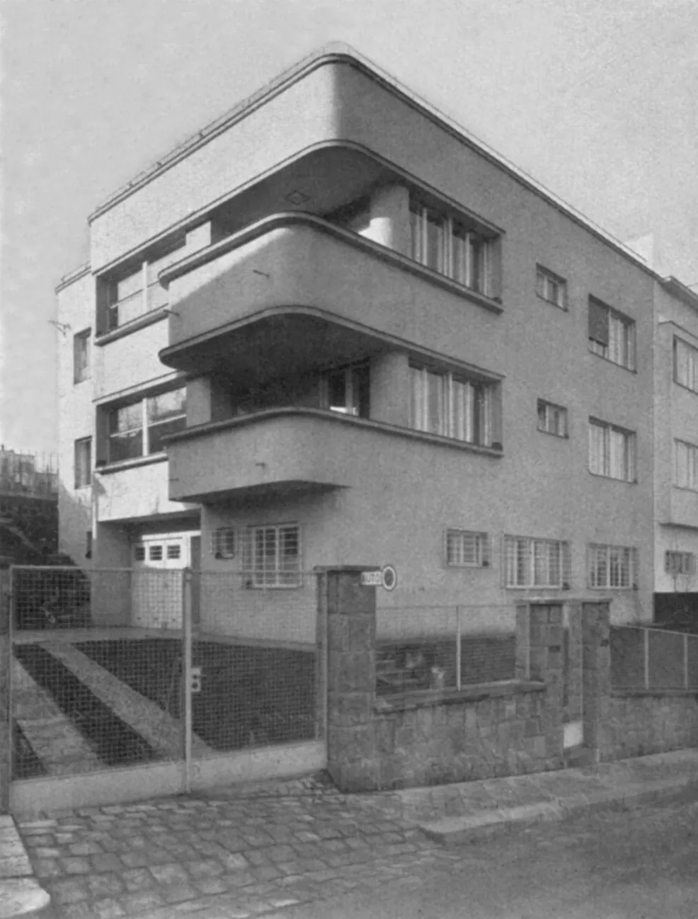 The house at 7 Krondlova Street is one of the few buildings by Emerich Spitzer, a Hungarian architect, in Brno. It is a two-storey apartment building on a square ground plan, the street facade of which is dominated by deep notches in the inventive corner balconies. Their graceful curves merge into the windowsills and copy the crown molding with the roof terrace railing.