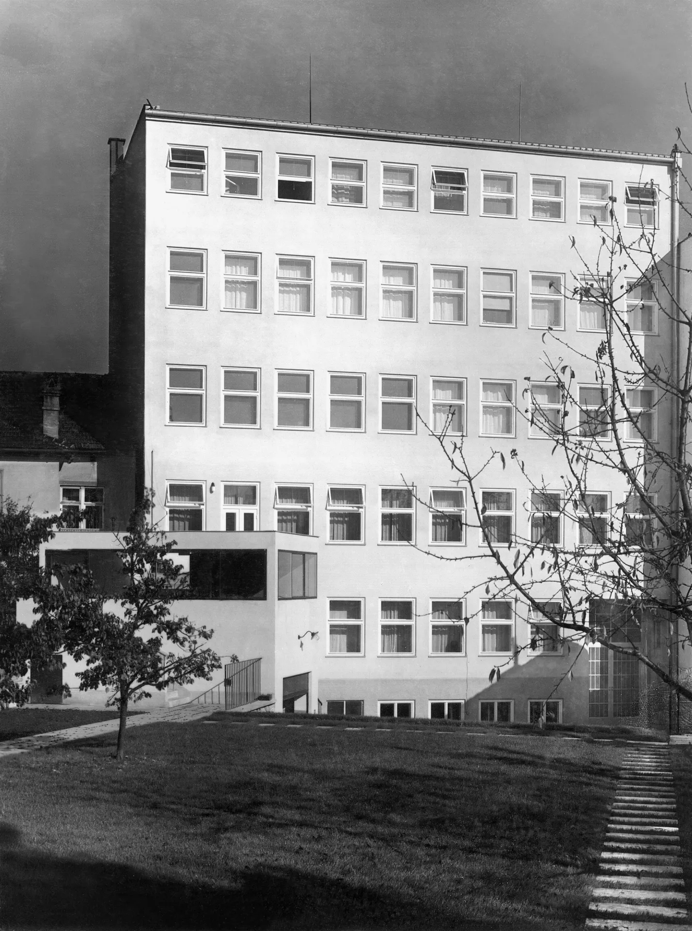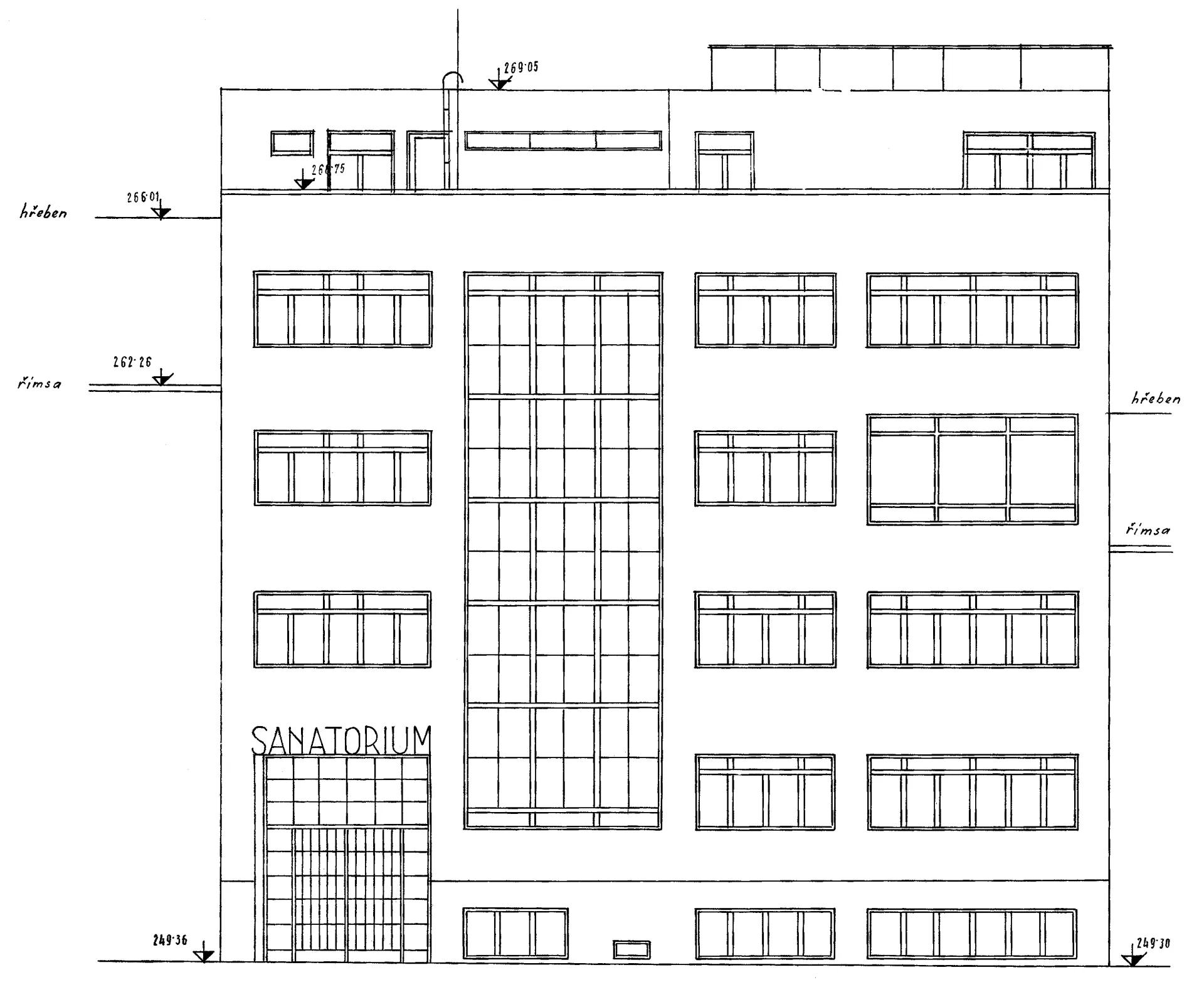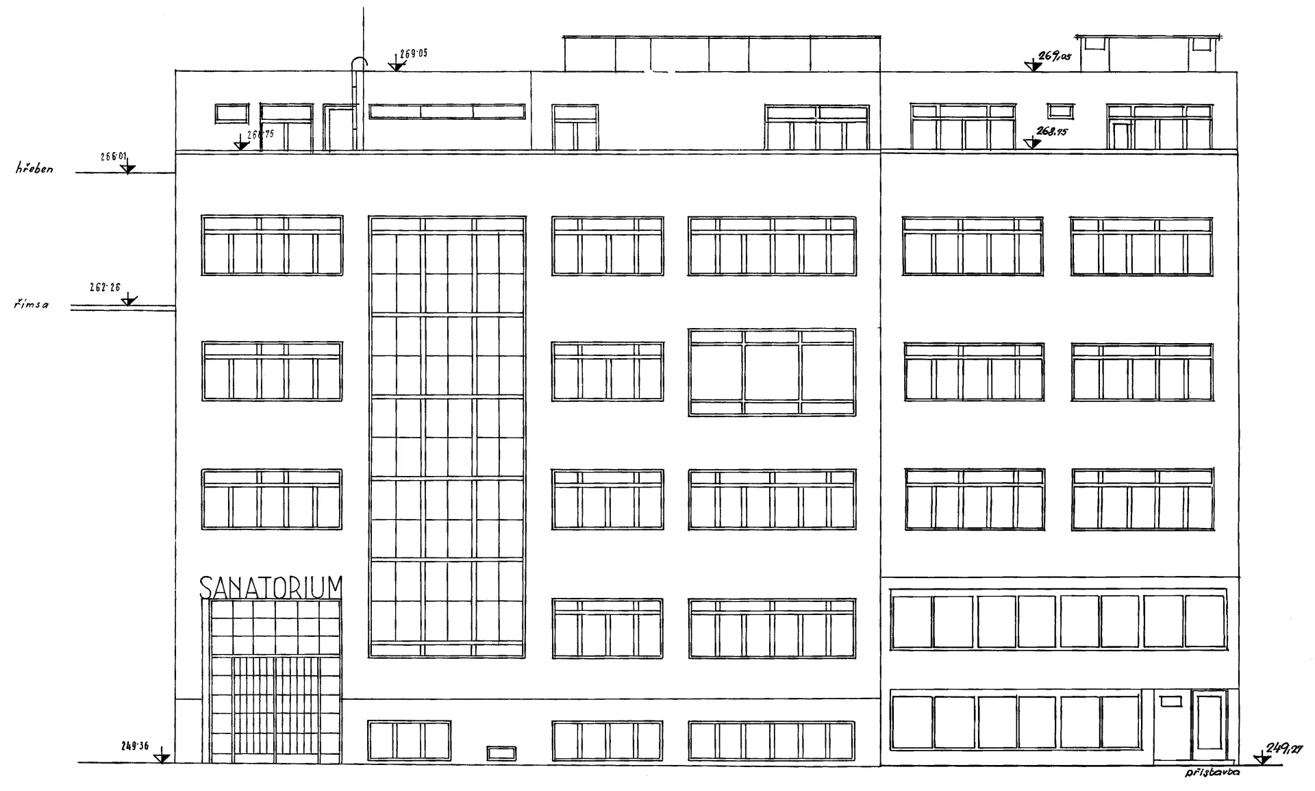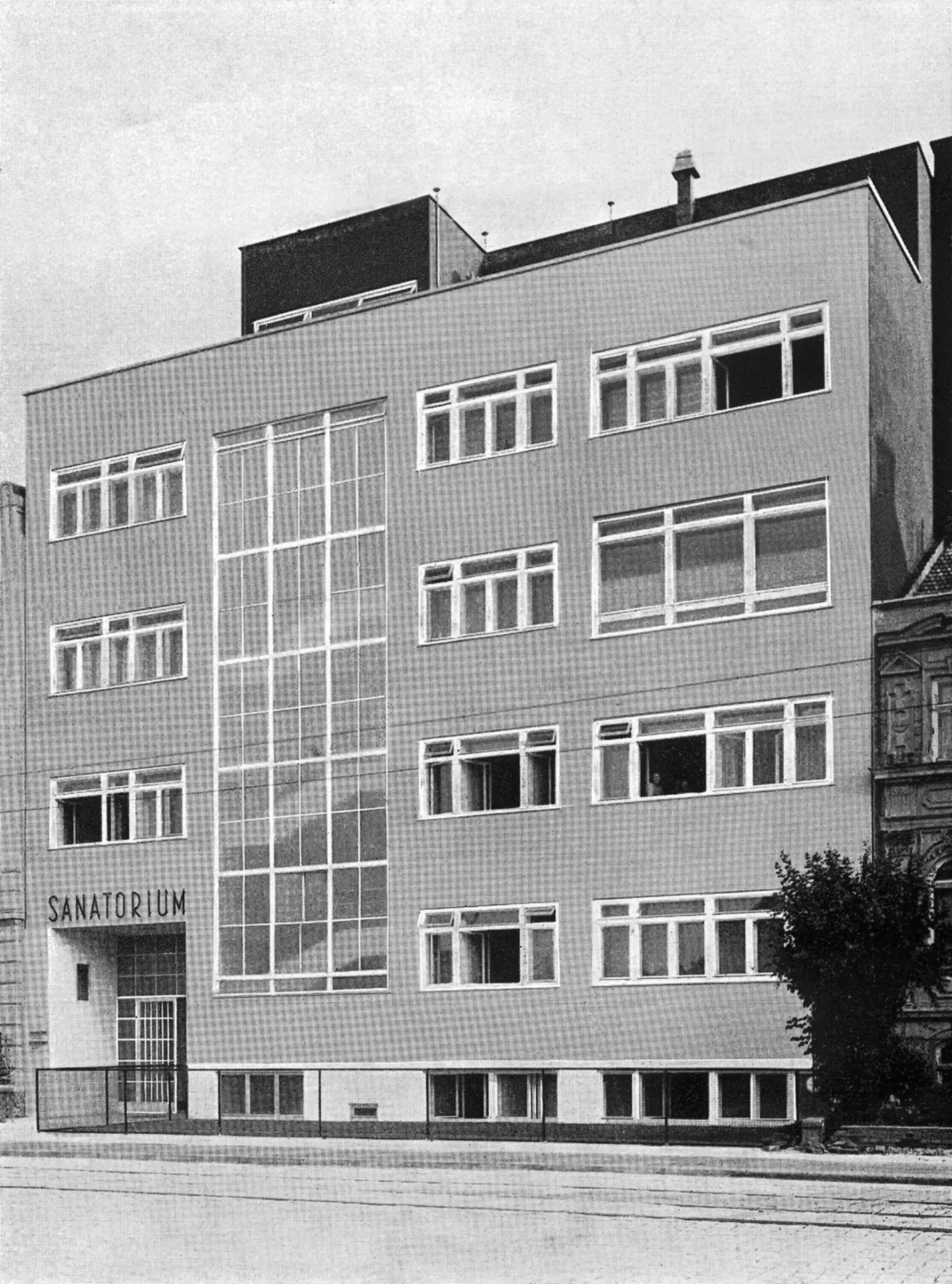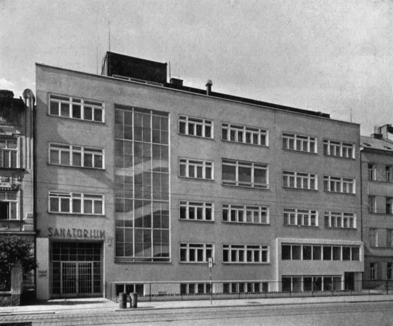In the early 1930s, MUDr. Václav Šilhan, who had worked at the Clinic of Gynecology and Obstetrics since 1924, decided to open his own gynecological sanatorium. The task to design the clinic in Veveří Street was assigned to Jan Víšek, who managed to create a modern building whose minimalistic esthetics corresponded to the clinic's cutting-edge technological furnishings. The architect also cooperated with his customer at stage two of the development, which involved the adjoining house owned by the Šilhan family on the neghboring plot. The layout of the six-storey sanatorium building was ingeniously arranged so that the individual areas were functionally linked and offered maximum comfort to the patients. The entrance was situated in the gateway on the left, which led to the check-in hall and waiting room. The patients were admitted to the consulting room and then to the surgery adjoined by an X-ray room and laboratory. After the examination, the patients could rest in the day room with sanitary facilities, which led back to the entrance hall. The first floor housed single and double bedrooms, a kitchen and a consulting room leading to the garden veranda; the second floor also featured a spacious operating theater. Rooms, together with service rooms and a terrace, were also located on the third and fourth floors. The plain street front segmented by rectangular windows is accentuated by the vertical glass wall of the staircase. The gateway entrance on the left-hand side is balanced by the large window of the operating theater on the second floor. Shortly after the completion of the sanatorium, Václav Šilhan decided to build his own house on the neighboring plot. Its facade is formally linked to the older building; only the basement and ground floor are emphasized by light ceramic cladding. The basement housed a large hall with a piano, open toward the garden, and the dining room facing the street. The dining room was adjoined by the preparation room and kitchen situated in the basement of the sanatorium together with the larder, cellars and the caretaker's apartment. A staircase ascended from the common room to the ground floor, which was interconnected with the neighboring building and housed laboratories and rehabilitation rooms. The first floor with the raised hall was occupied by the children's rooms as well as the owner's room connected to the admission room of the sanatorium. The second floor featured the family's bedrooms, the third floor was an extension of the inpatient ward of the sanatorium and the fourth housed staff rooms and a terrace. The interiors of both buildings with bathrooms paneled with opaxite, inpatient and common areas equipped with modern furniture made of bent steel and the marble paneling of the common entrance hall were also exquisite. During World War II Václav Šilhan joined the Protection of the Nation resistance movement and donated 100,000 Czechoslovak crowns for the procurement of medical materials. He was arrested by the Gestapo in 1942 and transported to the Mauthausen concentration camp, where he presumably died. In 1954 his private sanatorium became part of the Gynecology and Obstetrics Clinic of Brno Faculty Hospital and continued to serve its original purpose. However, the conditions considerably deteriorated during the period of Communist rule. After the Velvet Revolution the clinic was restituted and its private owner reconstructed the building completely after a vast fire in 2003.
