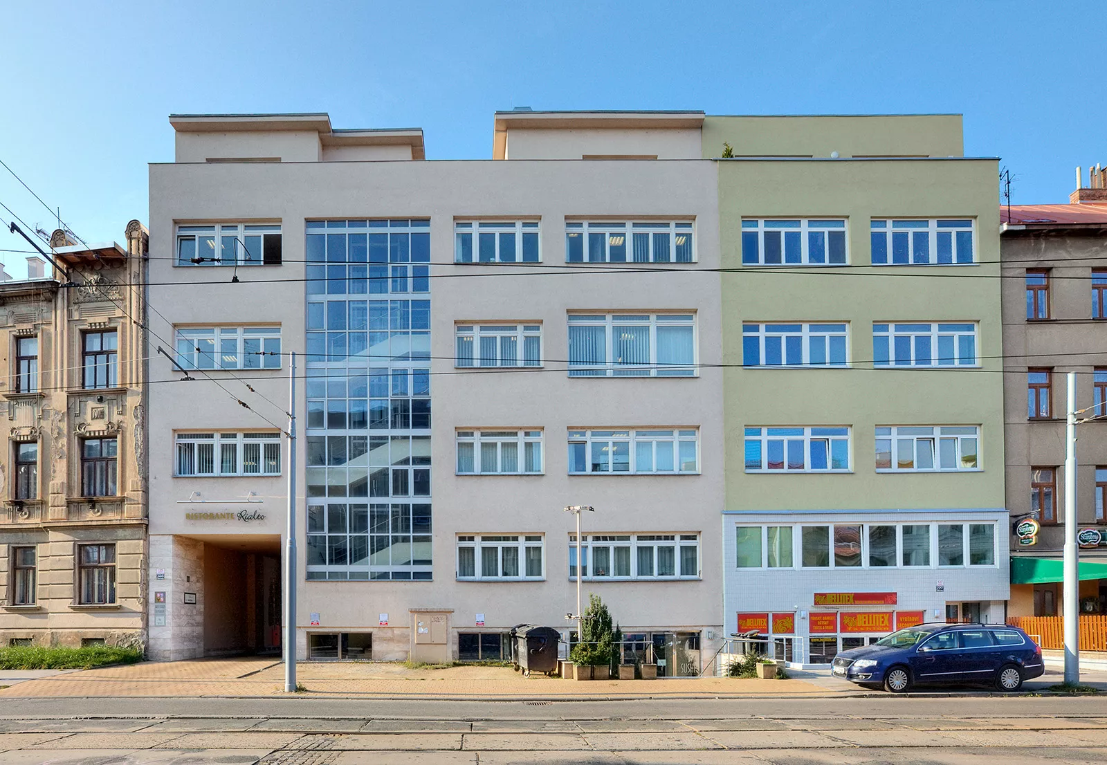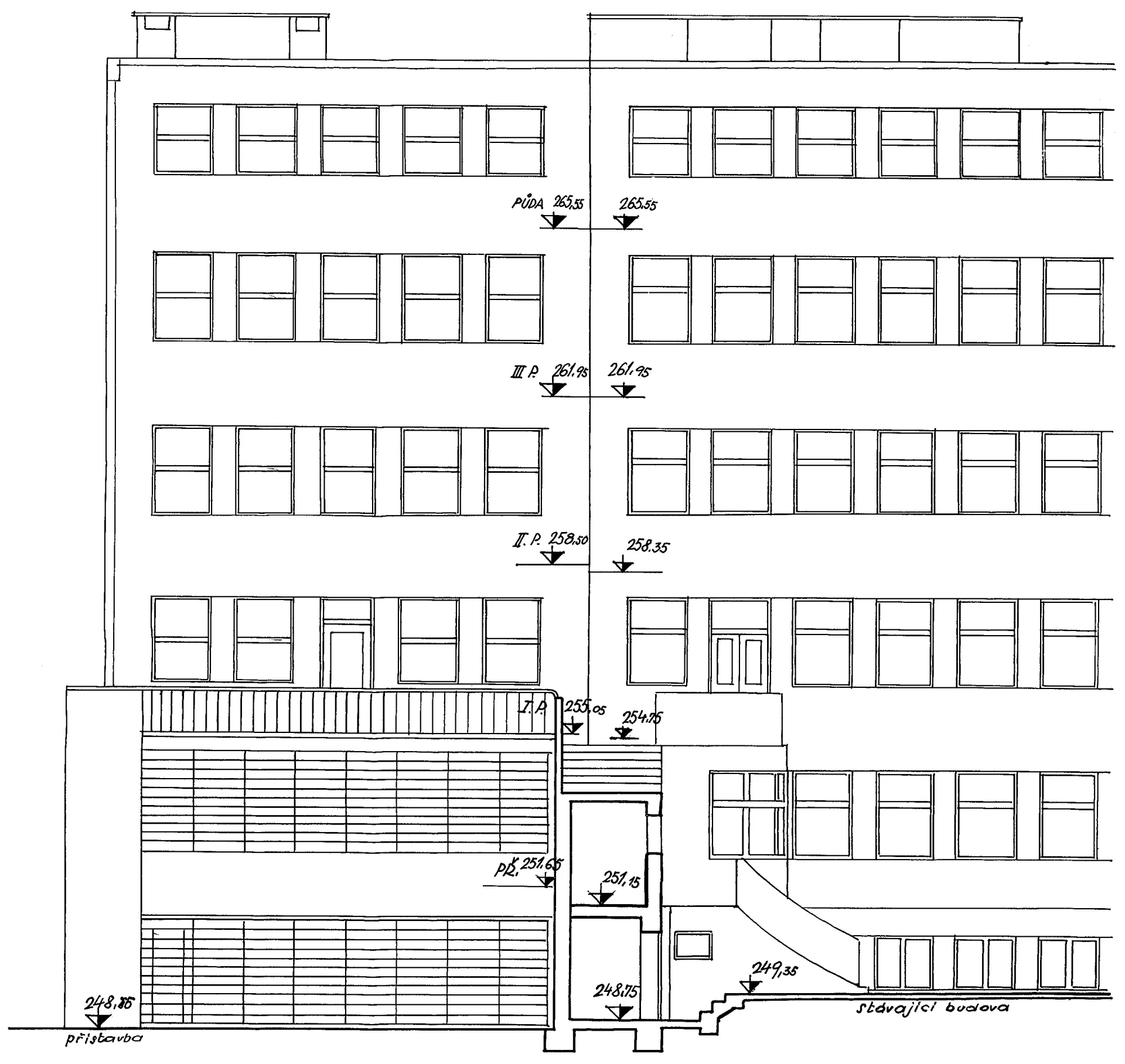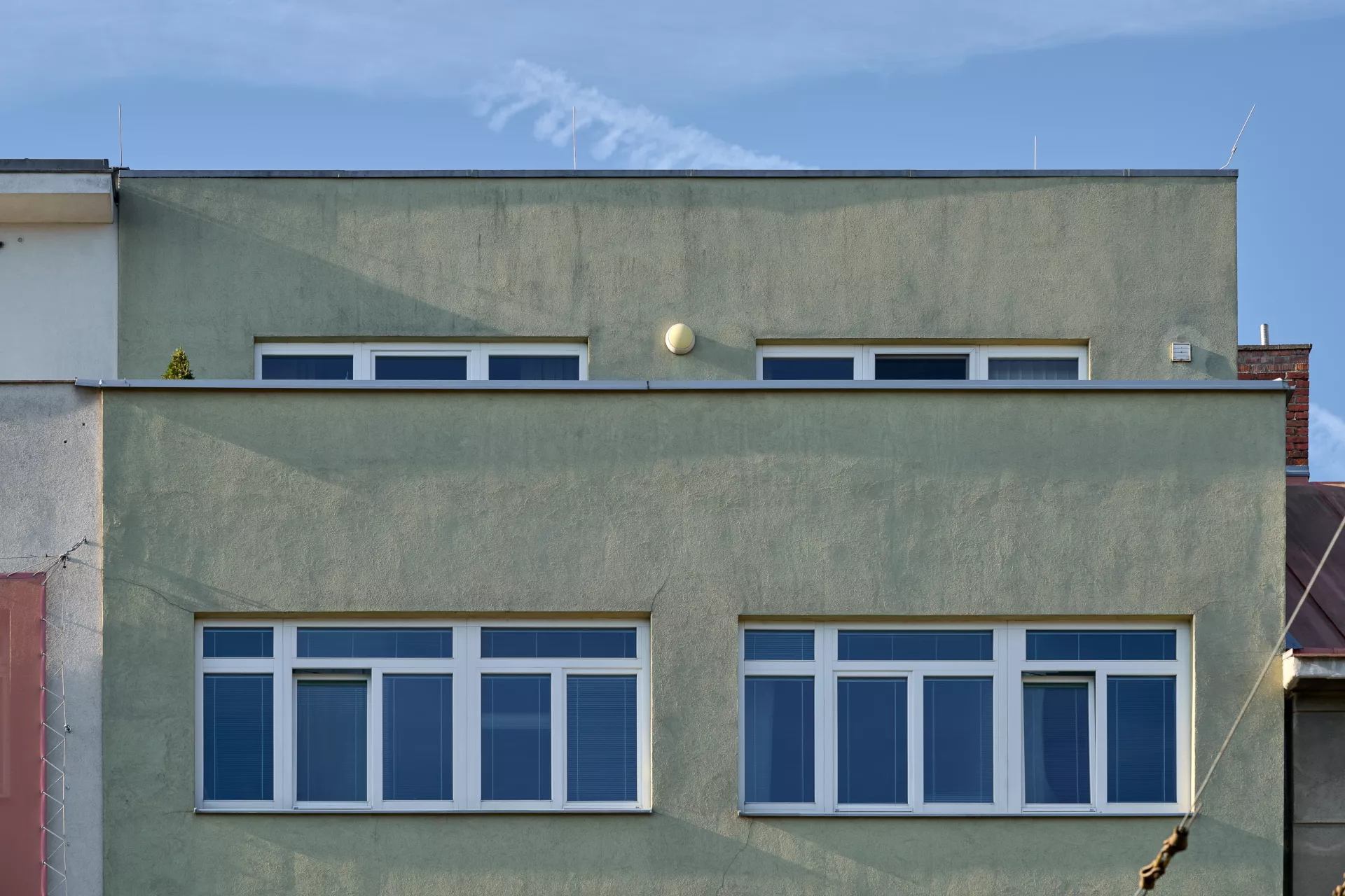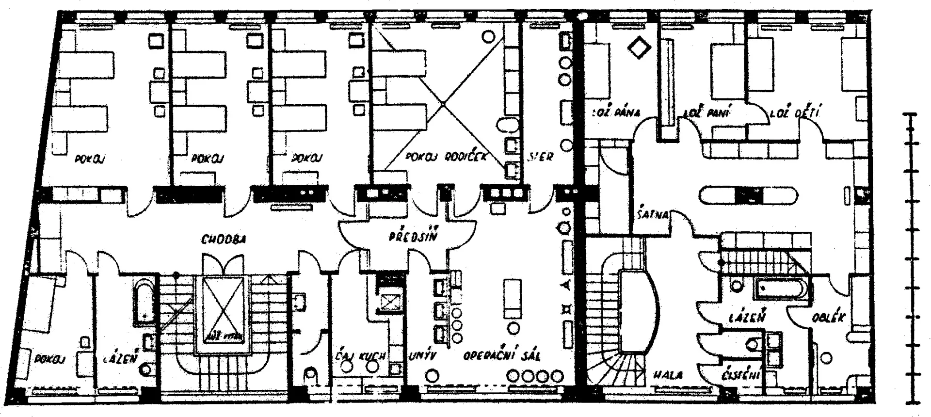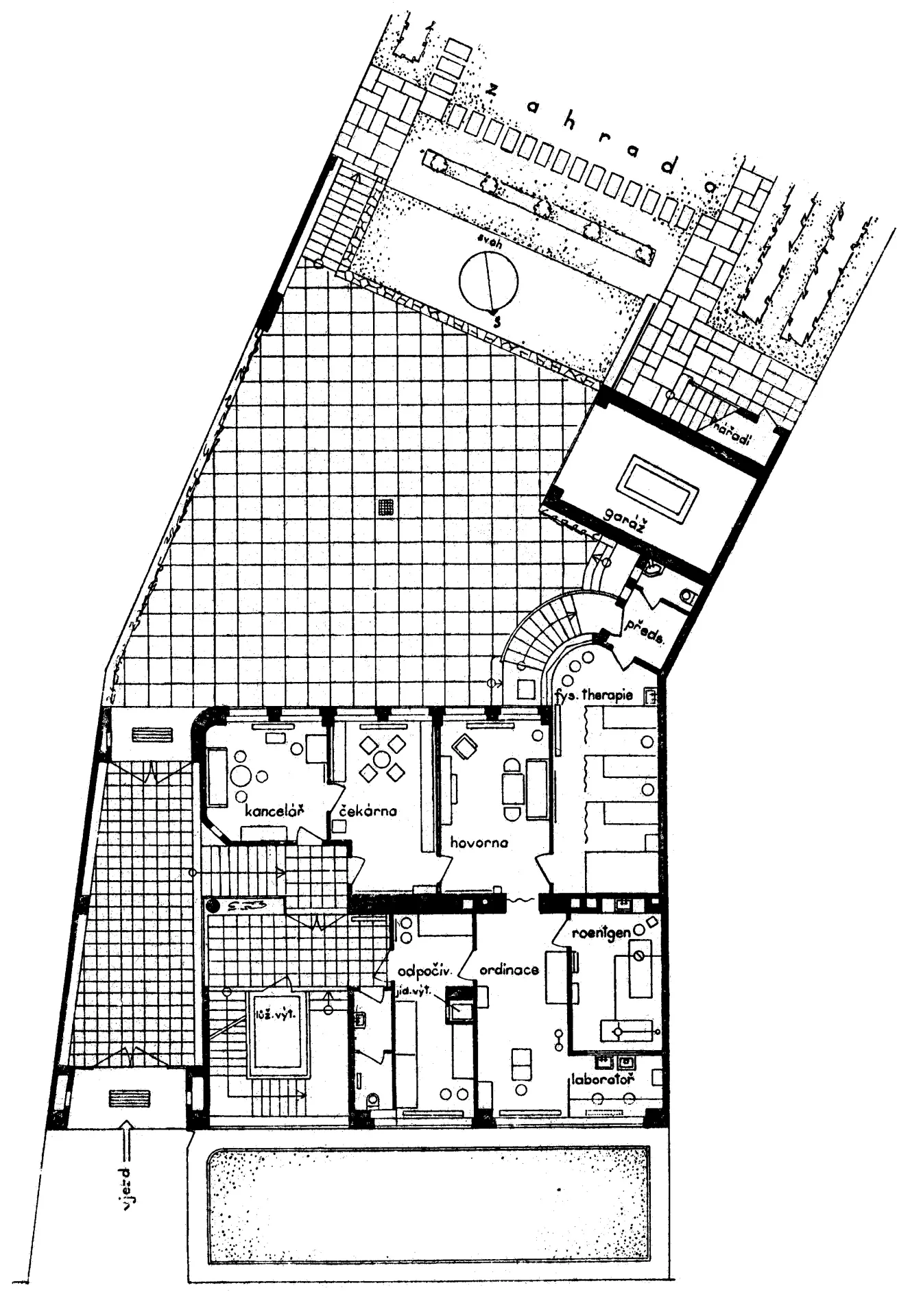 In the early 1930s, MUDr. Václav Šilhan, who had worked at the Clinic of Gynecology and Obstetrics since 1924, decided to open his own gynecological sanatorium. The task to design the clinic in Veveří Street was assigned to Jan Víšek, who managed to create a modern building whose minimalistic esthetics corresponded to the clinic's cutting-edge technological furnishings. The architect also cooperated with his customer at stage two of the development, which involved the adjoining house owned by the Šilhan family on the neghboring plot. The layout of the six-storey sanatorium building was ingeniously arranged so that the individual areas were functionally linked and offered maximum comfort to the patients. The entrance was situated in the gateway on the left, which led to the check-in hall and waiting room. The patients were admitted to the consulting room and then to the surgery adjoined by an X-ray room and laboratory. After the examination, the patients could rest in the day room with sanitary facilities, which led back to the entrance hall. The first floor housed single and double bedrooms, a kitchen and a consulting room leading to the garden veranda; the second floor also featured a spacious operating theater. Rooms, together with service rooms and a terrace, were also located on the third and fourth floors. The plain street front segmented by rectangular windows is accentuated by the vertical glass wall of the staircase. The gateway entrance on the left-hand side is balanced by the large window of the operating theater on the second floor. Shortly after the completion of the sanatorium, Václav Šilhan decided to build his own house on the neighboring plot. Its facade is formally linked to the older building; only the basement and ground floor are emphasized by light ceramic cladding. The basement housed a large hall with a piano, open toward the garden, and the dining room facing the street. The dining room was adjoined by the preparation room and kitchen situated in the basement of the sanatorium together with the larder, cellars and the caretaker's apartment. A staircase ascended from the common room to the ground floor, which was interconnected with the neighboring building and housed laboratories and rehabilitation rooms. The first floor with the raised hall was occupied by the children's rooms as well as the owner's room connected to the admission room of the sanatorium. The second floor featured the family's bedrooms, the third floor was an extension of the inpatient ward of the sanatorium and the fourth housed staff rooms and a terrace. The interiors of both buildings with bathrooms paneled with opaxite, inpatient and common areas equipped with modern furniture made of bent steel and the marble paneling of the common entrance hall were also exquisite. During World War II Václav Šilhan joined the Protection of the Nation resistance movement and donated 100,000 Czechoslovak crowns for the procurement of medical materials. He was arrested by the Gestapo in 1942 and transported to the Mauthausen concentration camp, where he presumably died. In 1954 his private sanatorium became part of the Gynecology and Obstetrics Clinic of Brno Faculty Hospital and continued to serve its original purpose. However, the conditions considerably deteriorated during the period of Communist rule. After the Velvet Revolution the clinic was restituted and its private owner reconstructed the building completely after a vast fire in 2003.