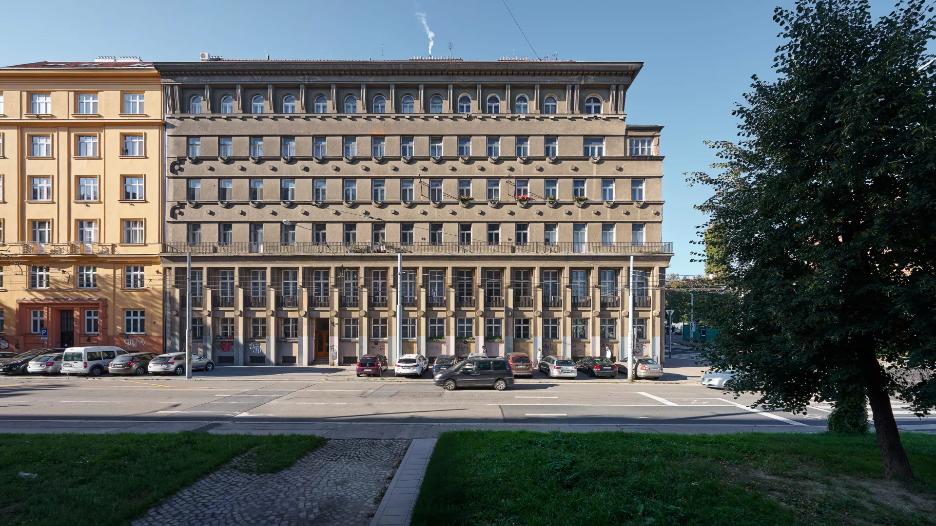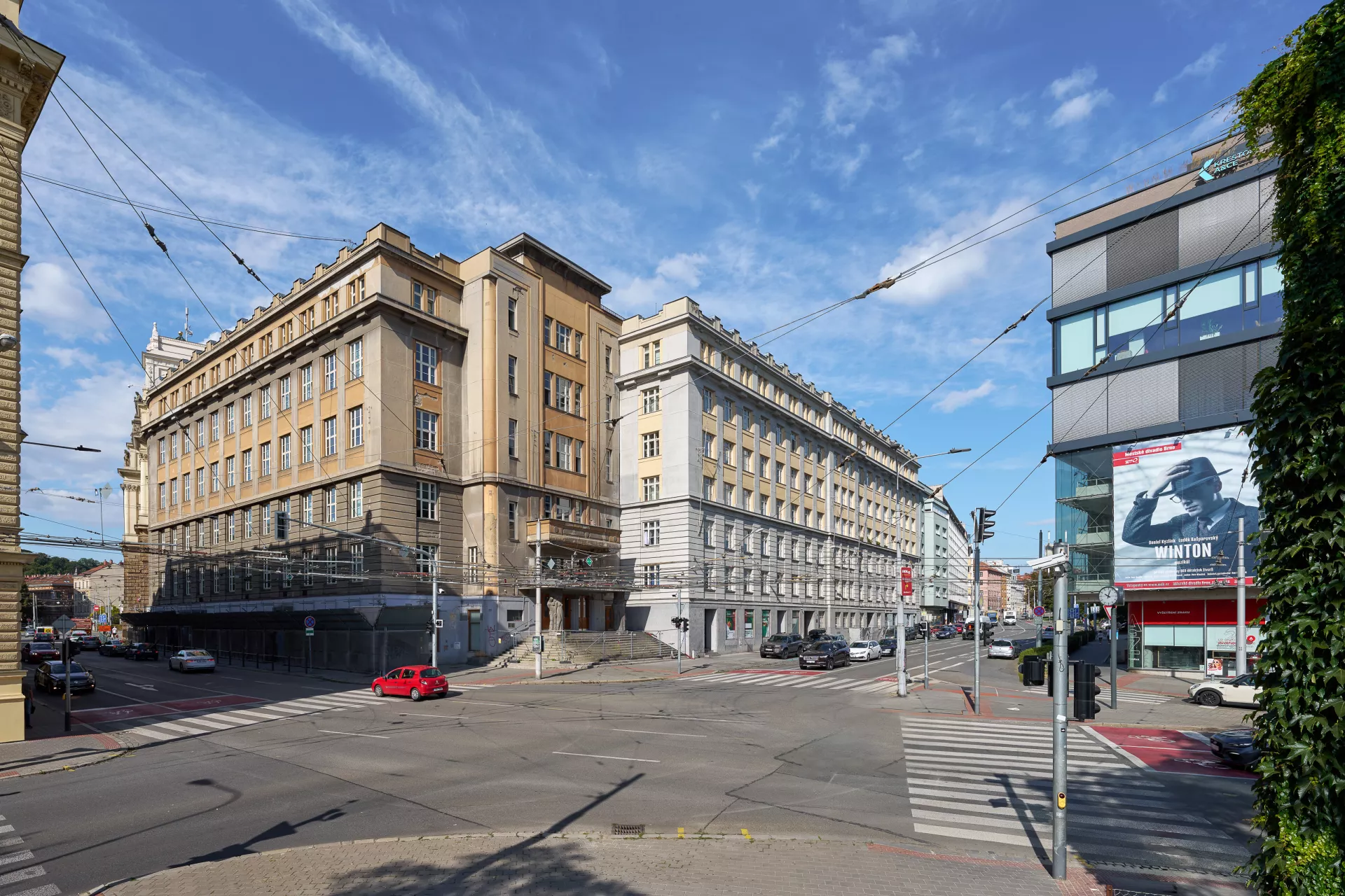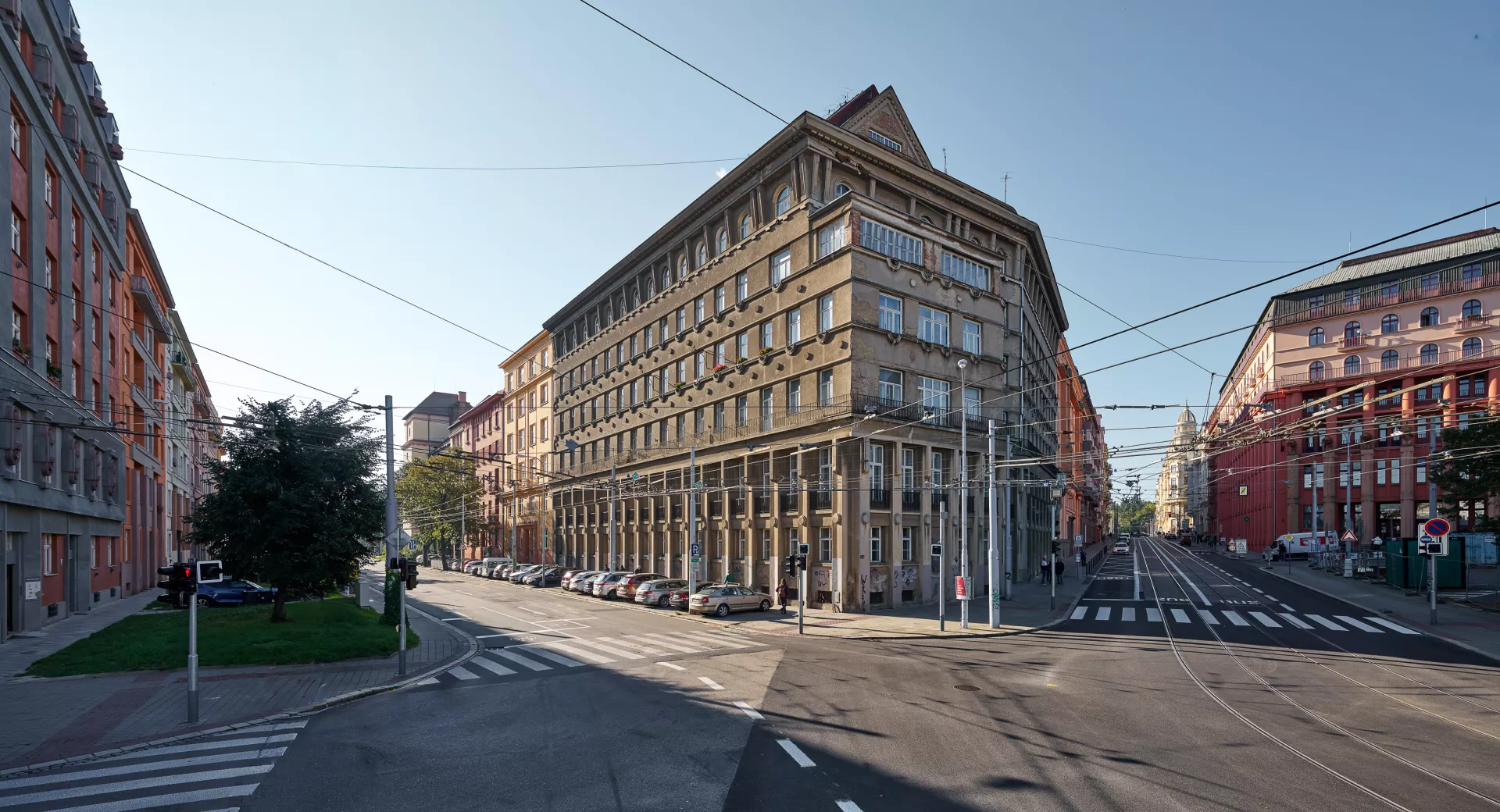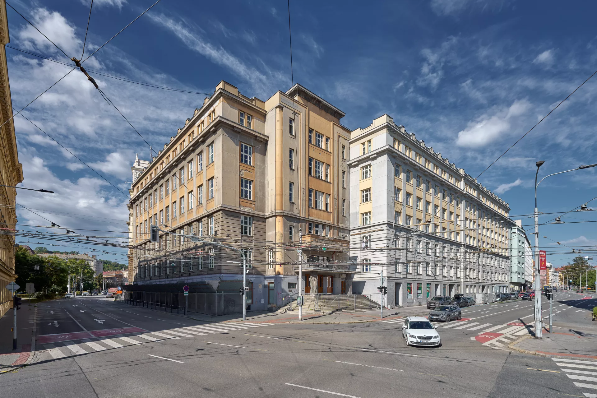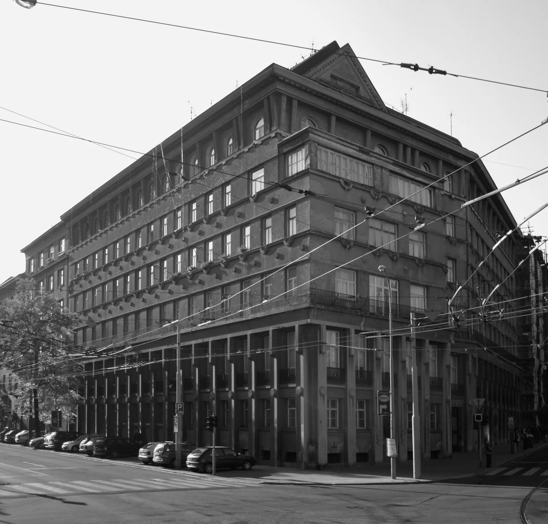 In 1921 the General Pension Institute opened an architectural competition for its new administrative building, which was intended to comprise part of the newly formed urban complex on the corner of Nerudova and Kounicova streets. The winner was Oldřich Liska, an architect from Hradec Králové; however, for unknown reasons, the contract was awarded to Jindřich Kumpošt, who also designed the opposite building for the District Sickness Fund in the same year. Both designs were intended for the corner location and their A-shaped ground plans consisting of two wings and a connecting corridor are nearly identical. The location of the round volumes of the staircases in the inner block is also identical and was favoured in Kumpošt's others designs of that period. However, the entrance lobby of the Pensions Institute is not located on the corner, but in the shorter wing in Nerudova Street. The facade with its prominent horizontal segmentation by running ledges and round relief elements approaches the aesthetics of rondo-cubism. Like the building of the Sickness Fund opposite, this building was also built using state subsidies under the Building Act. Therefore, the project assignment called only for offices on the ground floor, with the rest of the building designated for residential purposes. And yet, the investor required that the apartments be designed so that they could be easily converted into offices when the need arose. PH