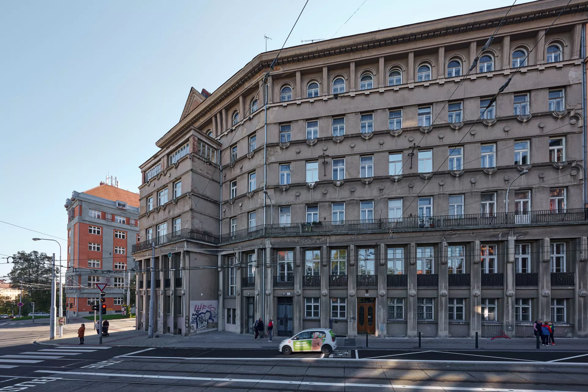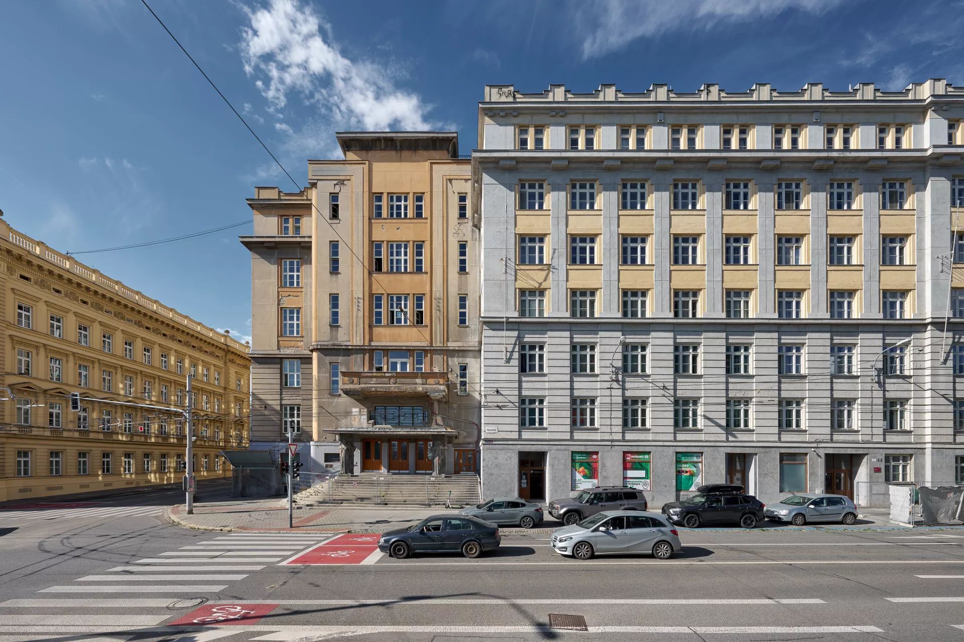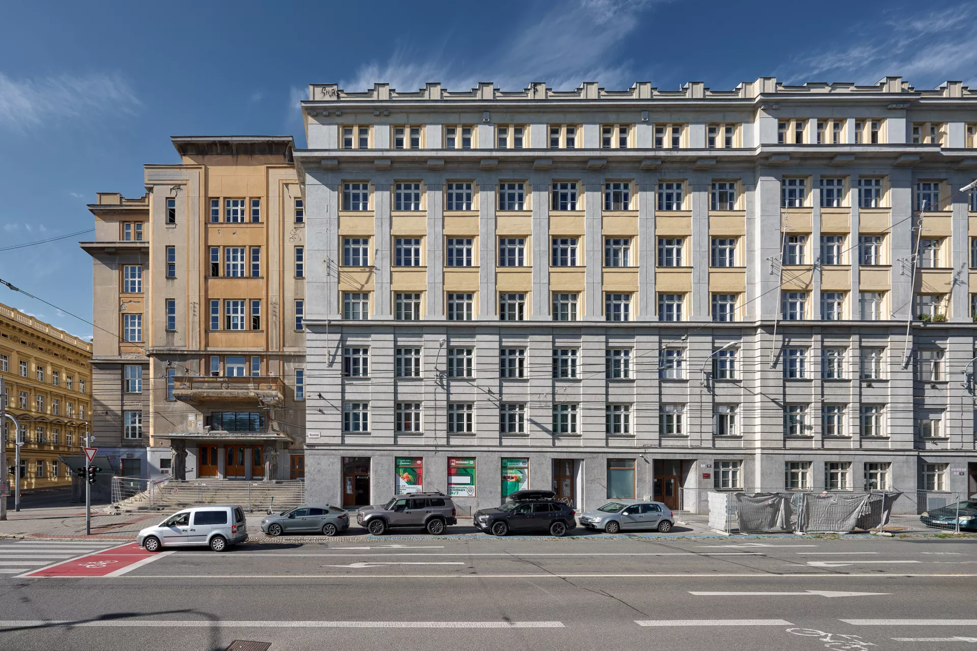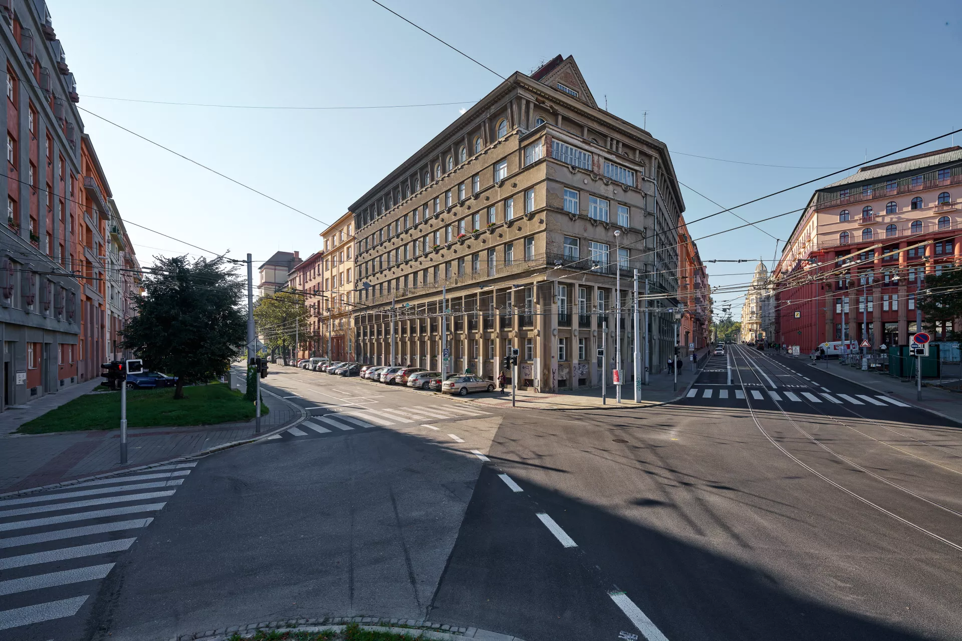 In 1921 the General Pension Institute opened an architectural competition for its new administrative building, which was intended to comprise part of the newly formed urban complex on the corner of Nerudova and Kounicova streets. The winner was Oldřich Liska, an architect from Hradec Králové; however, for unknown reasons, the contract was awarded to Jindřich Kumpošt, who also designed the opposite building for the District Sickness Fund in the same year. Both designs were intended for the corner location and their A-shaped ground plans consisting of two wings and a connecting corridor are nearly identical. The location of the round volumes of the staircases in the inner block is also identical and was favoured in Kumpošt's others designs of that period. However, the entrance lobby of the Pensions Institute is not located on the corner, but in the shorter wing in Nerudova Street. The facade with its prominent horizontal segmentation by running ledges and round relief elements approaches the aesthetics of rondo-cubism. Like the building of the Sickness Fund opposite, this building was also built using state subsidies under the Building Act. Therefore, the project assignment called only for offices on the ground floor, with the rest of the building designated for residential purposes. And yet, the investor required that the apartments be designed so that they could be easily converted into offices when the need arose. PH