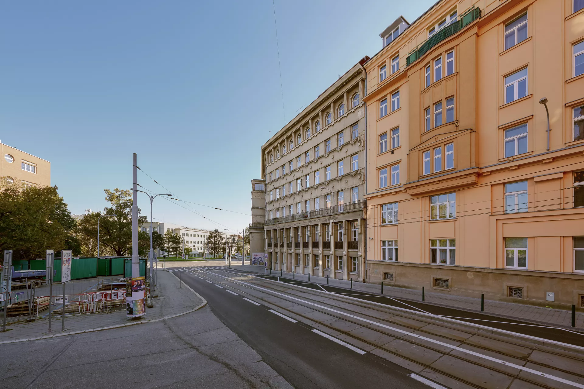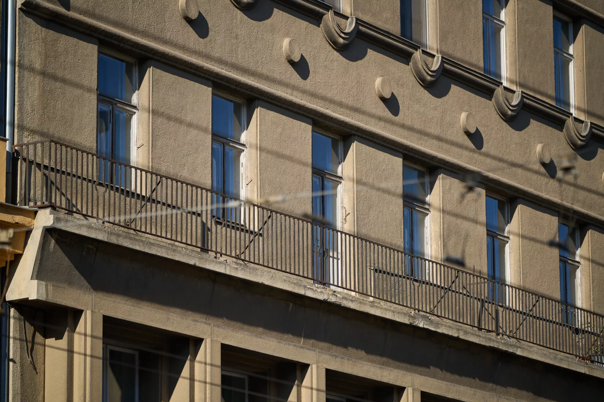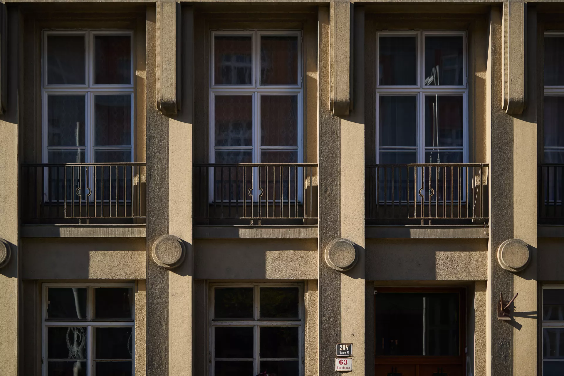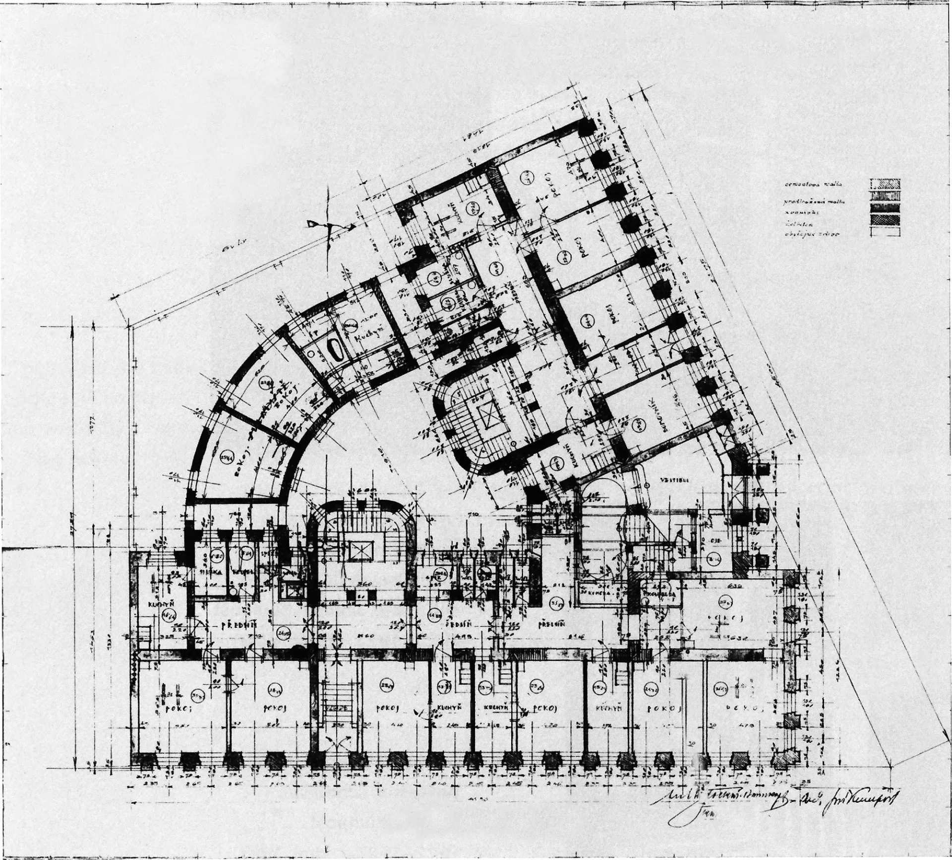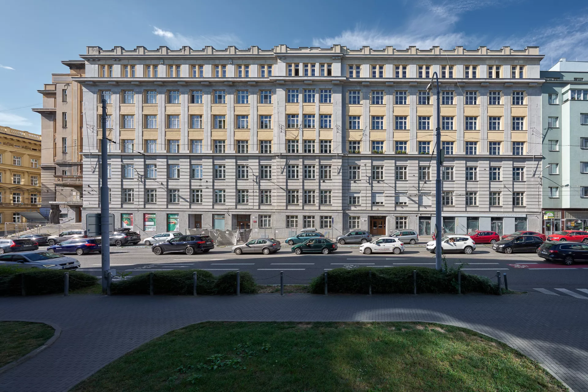 In 1921 the General Pension Institute opened an architectural competition for its new administrative building, which was intended to comprise part of the newly formed urban complex on the corner of Nerudova and Kounicova streets. The winner was Oldřich Liska, an architect from Hradec Králové; however, for unknown reasons, the contract was awarded to Jindřich Kumpošt, who also designed the opposite building for the District Sickness Fund in the same year. Both designs were intended for the corner location and their A-shaped ground plans consisting of two wings and a connecting corridor are nearly identical. The location of the round volumes of the staircases in the inner block is also identical and was favoured in Kumpošt's others designs of that period. However, the entrance lobby of the Pensions Institute is not located on the corner, but in the shorter wing in Nerudova Street. The facade with its prominent horizontal segmentation by running ledges and round relief elements approaches the aesthetics of rondo-cubism. Like the building of the Sickness Fund opposite, this building was also built using state subsidies under the Building Act. Therefore, the project assignment called only for offices on the ground floor, with the rest of the building designated for residential purposes. And yet, the investor required that the apartments be designed so that they could be easily converted into offices when the need arose. PH