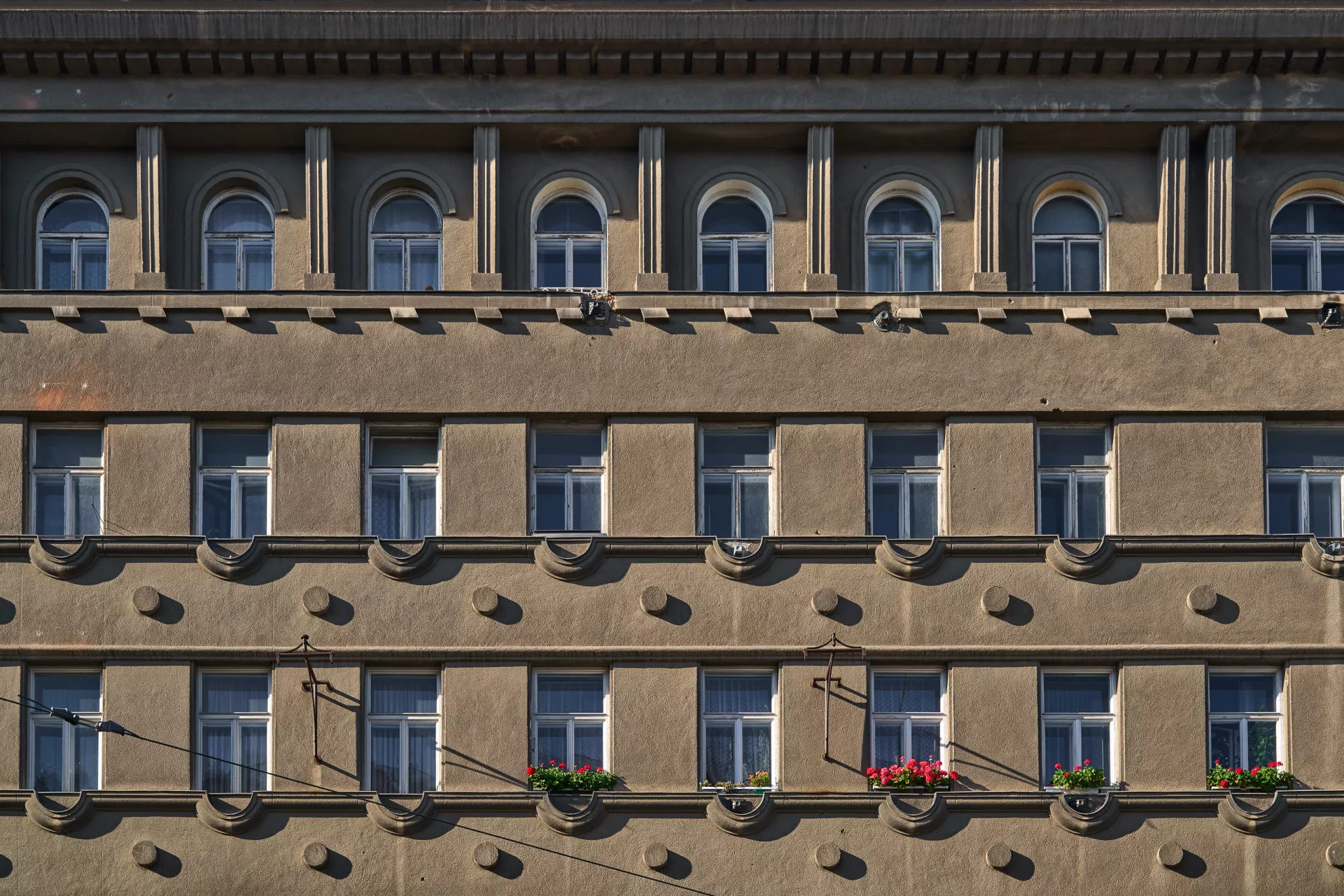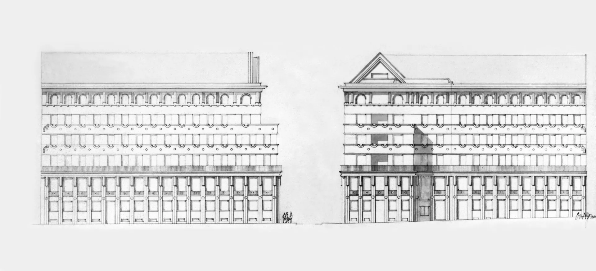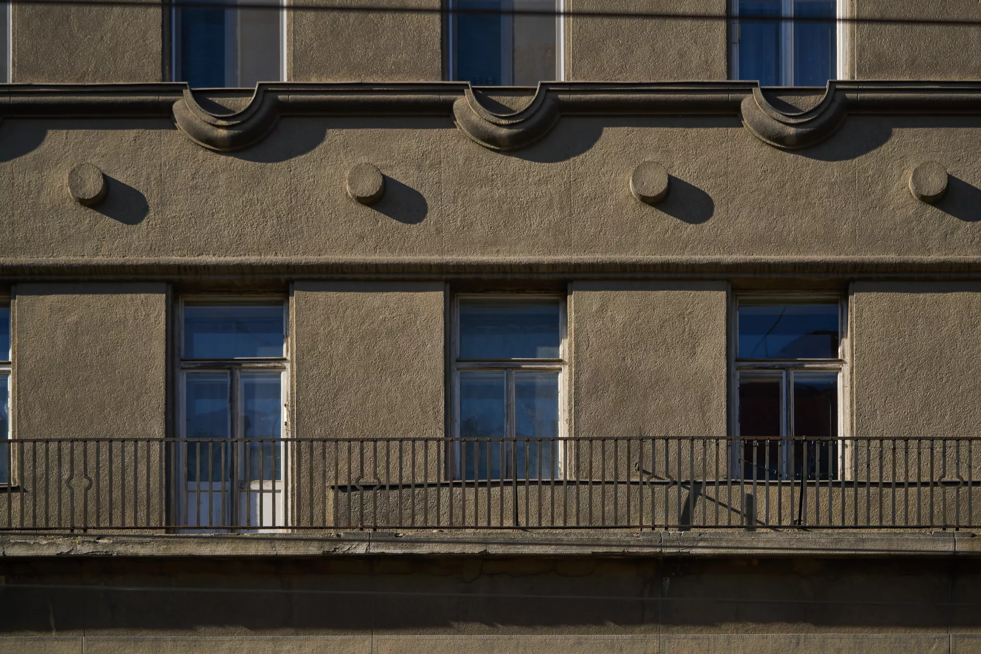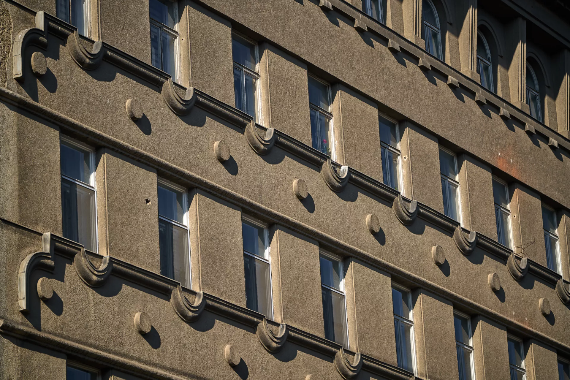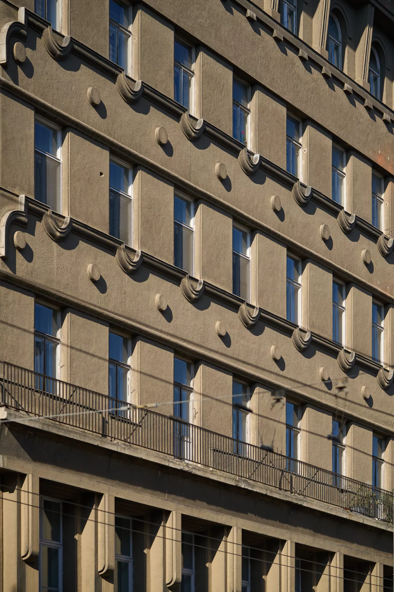 In 1921 the General Pension Institute opened an architectural competition for its new administrative building, which was intended to comprise part of the newly formed urban complex on the corner of Nerudova and Kounicova streets. The winner was Oldřich Liska, an architect from Hradec Králové; however, for unknown reasons, the contract was awarded to Jindřich Kumpošt, who also designed the opposite building for the District Sickness Fund in the same year. Both designs were intended for the corner location and their A-shaped ground plans consisting of two wings and a connecting corridor are nearly identical. The location of the round volumes of the staircases in the inner block is also identical and was favoured in Kumpošt's others designs of that period. However, the entrance lobby of the Pensions Institute is not located on the corner, but in the shorter wing in Nerudova Street. The facade with its prominent horizontal segmentation by running ledges and round relief elements approaches the aesthetics of rondo-cubism. Like the building of the Sickness Fund opposite, this building was also built using state subsidies under the Building Act. Therefore, the project assignment called only for offices on the ground floor, with the rest of the building designated for residential purposes. And yet, the investor required that the apartments be designed so that they could be easily converted into offices when the need arose. PH