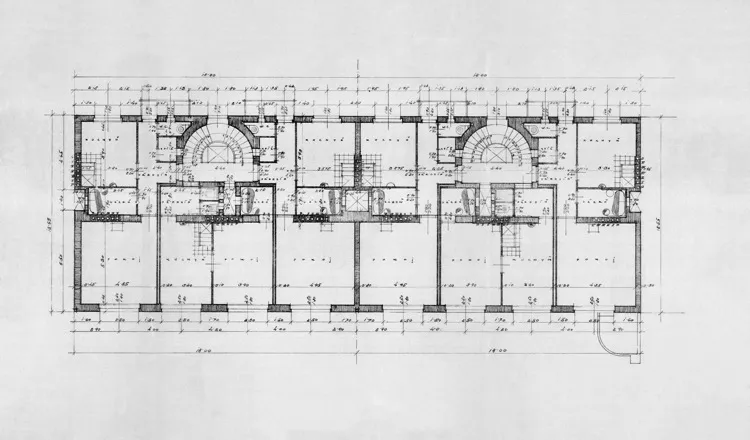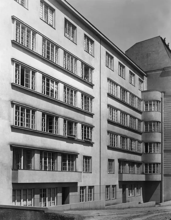 Jindřich Kumpošt built apartment buildings for Pension Institute employees in the new development at the base of Kraví hora in 1926. Each floor of these two seven-level buildings on rectangular ground plans contained three small one-room apartments whose living rooms look out on the street while the stairs and service facilities face the inner yard. The building is set back a little from the street line and the entrance is concealed by a support wall delimiting the front garden. The facade is, in the spirit of modern purist aesthetics, only segmented by rows of grid windows with protruding frames and pronounced molding; on the right, there is a lean corner alcove merging into the gable wall of the adjoining structure. The extension with loggias at the top of the building was added later. PH