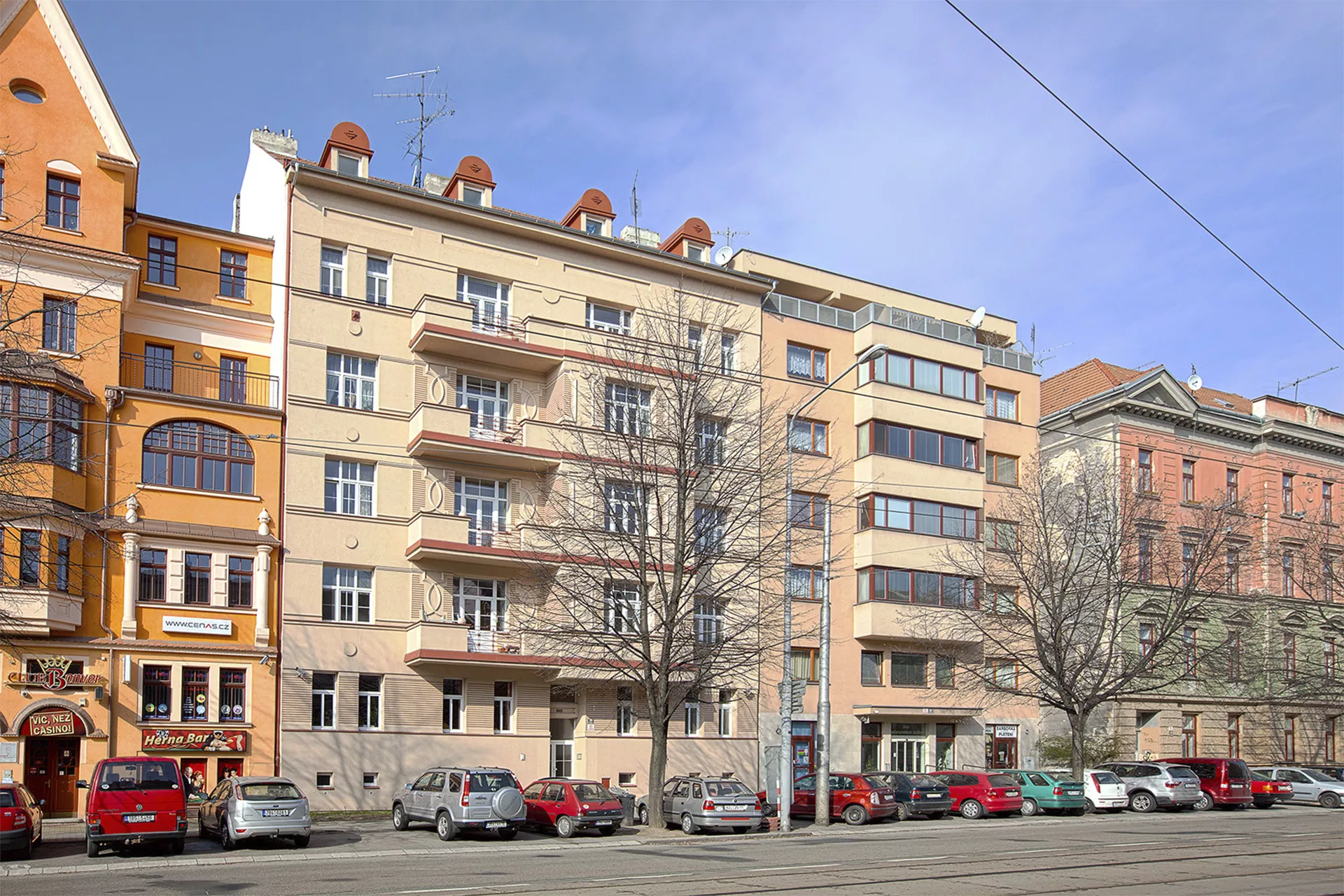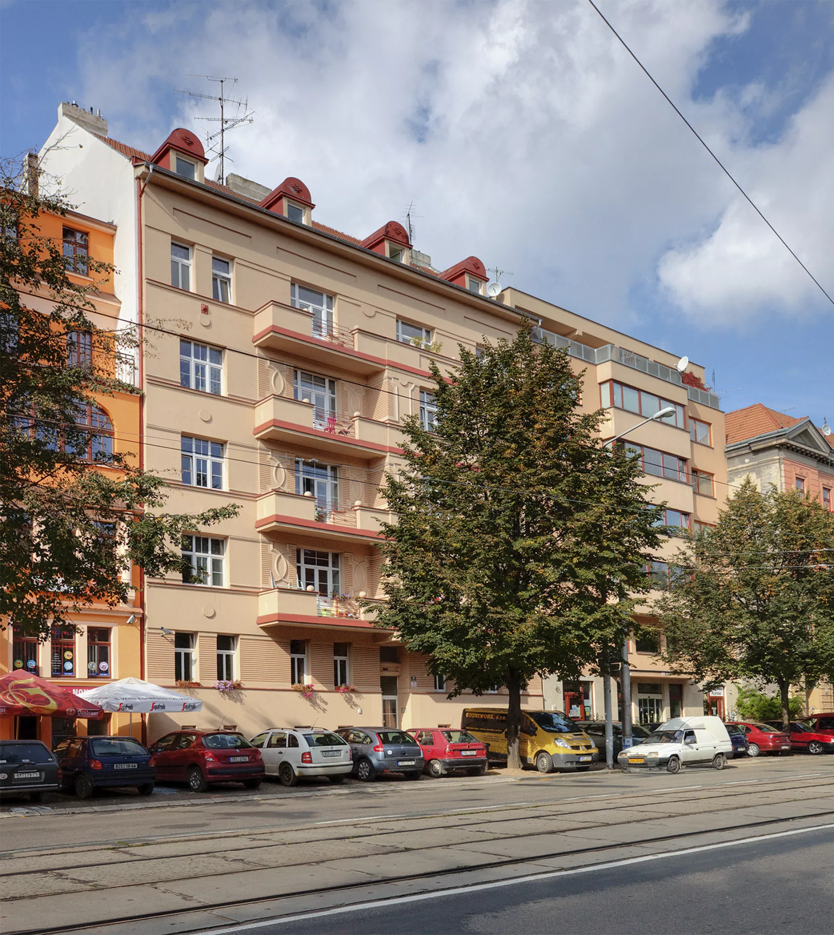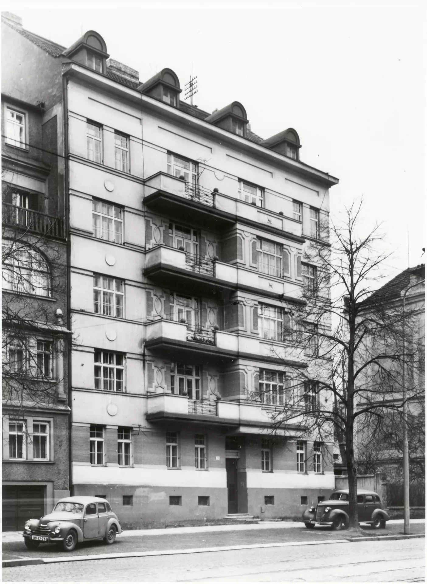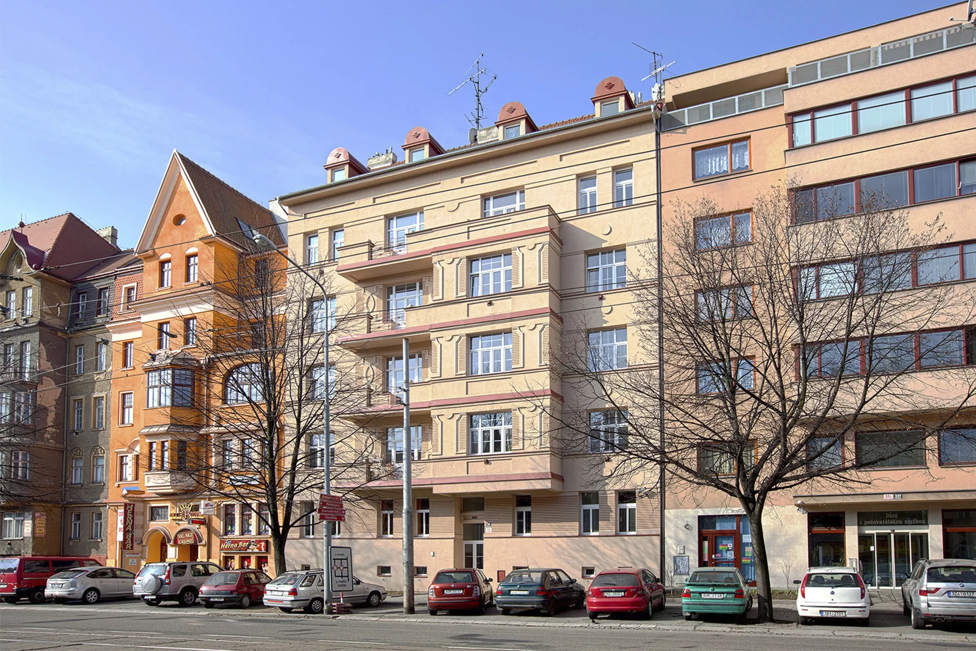 This building in Štefánikova Street is one of the apartment buildings built by the state in response to the housing crisis after World War I. Owing to the Building Act of 1921, which provided high state subsidies for building up to three-room apartments, the period from 1922 to 1925 witnessed the building of over one hundred and sixty apartment units in Brno. However, true reform regarding affordable housing and progressive designs of estates with small apartments did not emerge until the late 1920s, after the Building Act had been amended. This six-level building by architects Jaroslav Grunt and Miloš Laml manifests the search for a Czech national style after World War I. The facade – considerably reduced today regarding its colour scheme as well as relief decorations – represents an example of the new curved decor drawing upon folk motives that replaced the historicist ornament favoured in conservative Austria-Hungary. The building is divided into a communications part with a semi-circular staircase and a pair of two-room and three-room apartments on each floor. PH