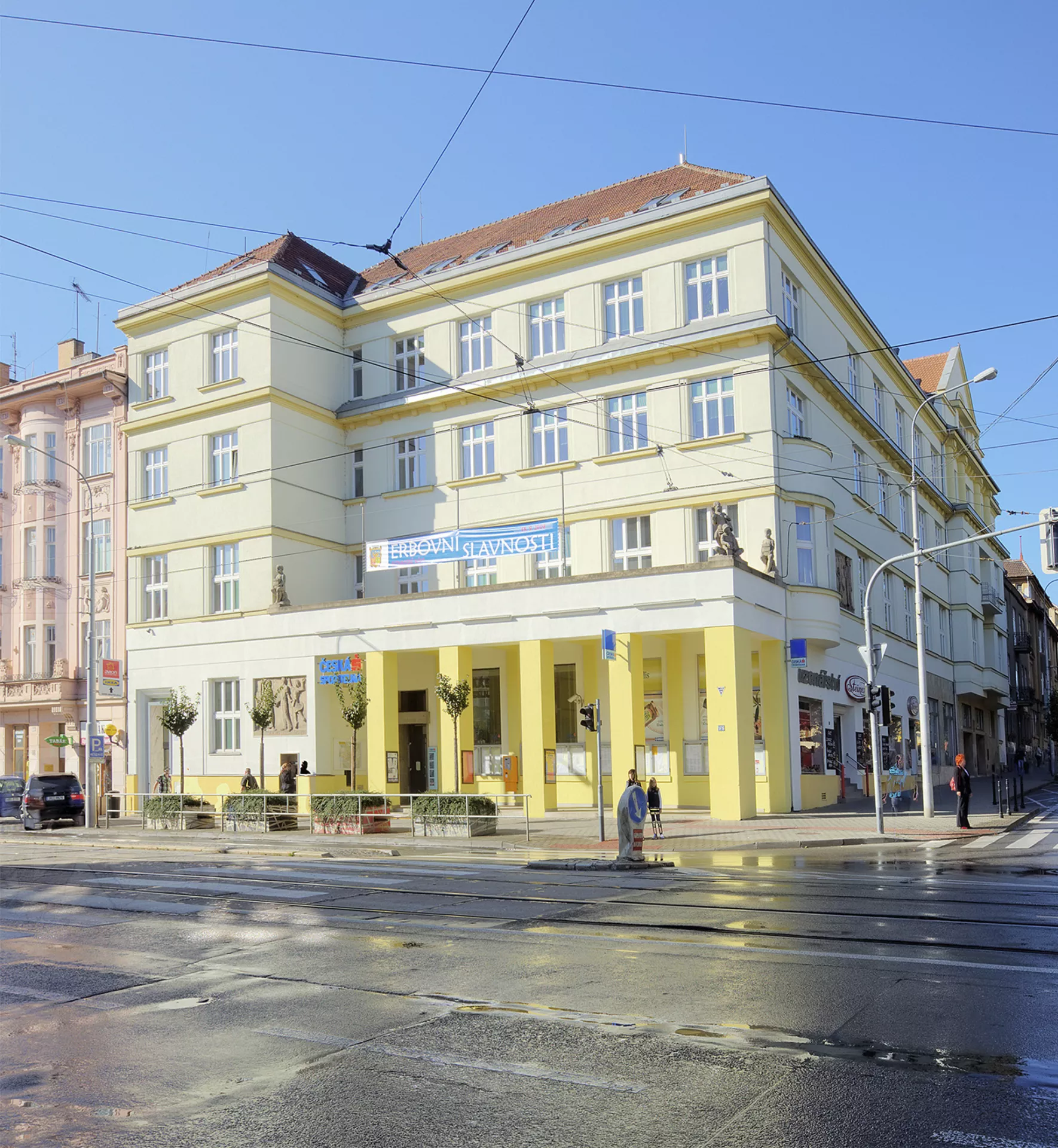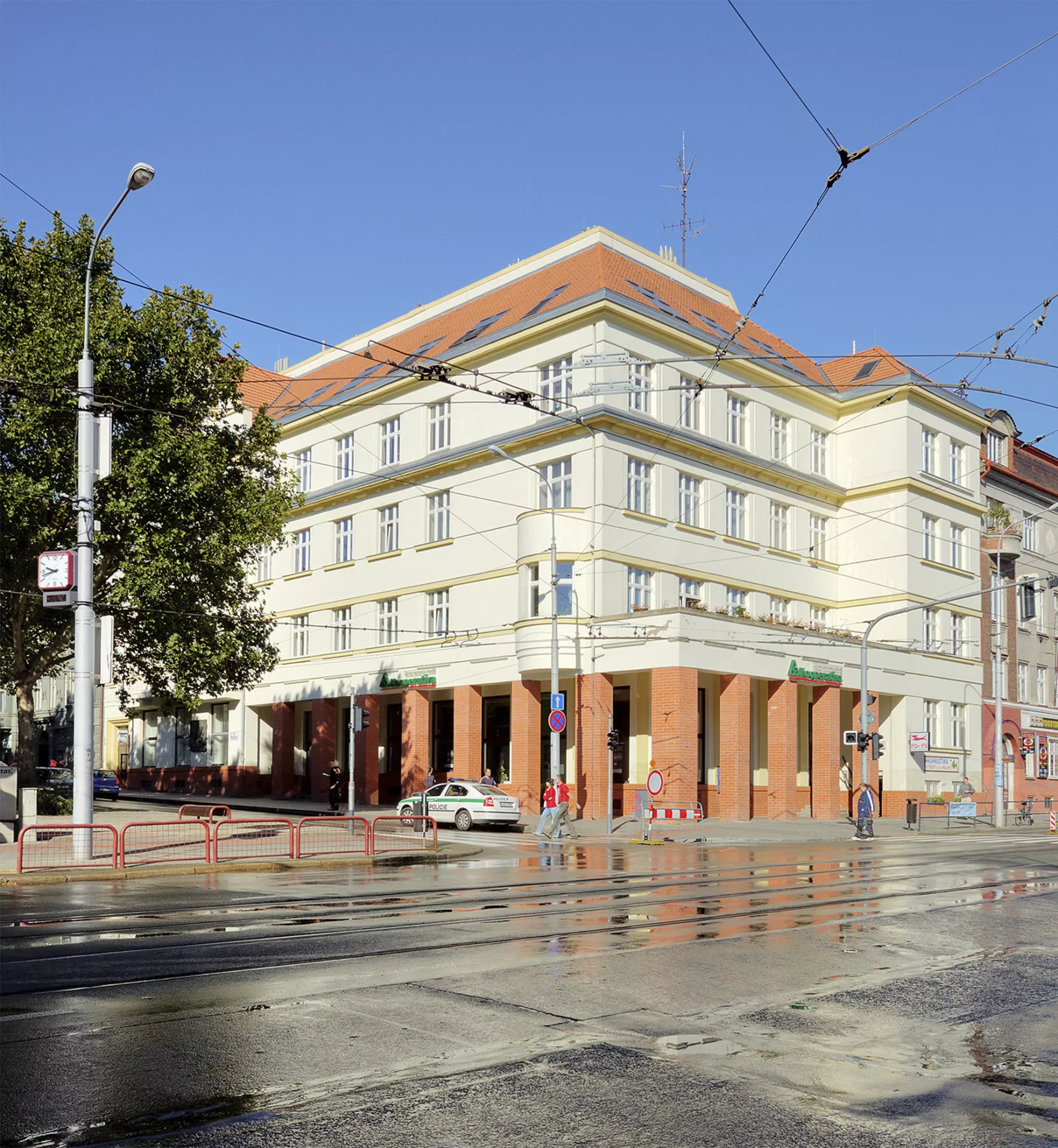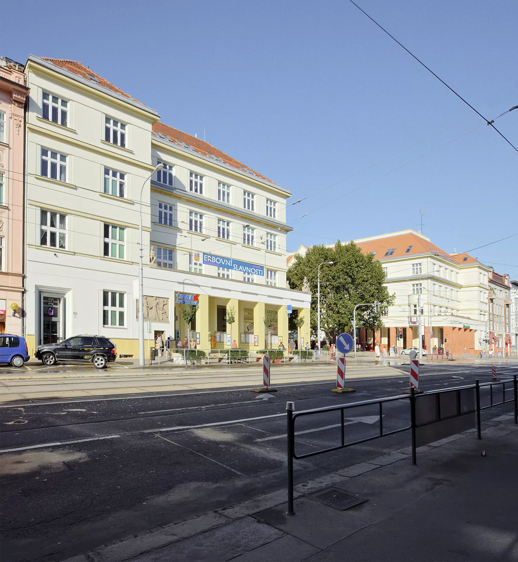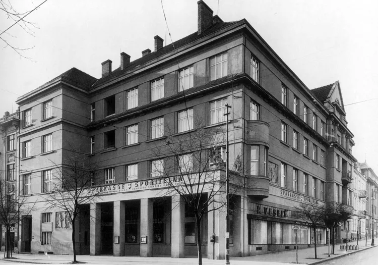 In 1923, the municipal authorities decided to build on the two corner plots at the junction of Husitská and Palackého streets in Královo Pole. The multi-purpose building was designed by Jindřich Kumpošt, the chief municipal architect at the time. The city used the state subsidy under the Building Act, which required that two-thirds of the building be used for residential space. Each block contained sixteen apartment units and a commercial ground floor to let. The City Savings Bank in Královo Pole moved its offices into one of the buildings (No. 59), as the company experienced an upswing in the years following the formation of Czechoslovakia and was looking for a new and stately seat. Like some of the architect's later designs, this one also employs the symmetrical arrangement of two identical mirrored buildings, creating a monumental gateway to the main square of Královo Pole, Slovanské náměstí. The volume of the structures is graded in Palackého Street and the ground floor colonnade adds lightness; the facade in Husitská Street is topped by a risalit with a triangular gable and decorated with cylindrical supports between the windows. The use of ferro-concrete structure enabled the opening of the ground floor of the generous bank lobby panelled with marble from Křtiny. This lobby is accessible via an entrance situated in Palackého Street and decorated with a ceramic relief by sculptor Vojmír Vokolek. Other decorations included statues of dogs guarding the staircase to the vaults and the manager's office by Václav Mach and a larger-than-life statue of Tomáš Garrigue Masaryk installed in the conference room. Jindřich Kumpošt based his design of the bank's premises on his studies of requirements for these facilities in Czechoslovakia. The period press praised mainly the purposefulness, simplicity and dignity of this new concept, which was in steep contrast to the exaggerated decorativeness and ostentatious pomp of Austro-Hungarian offices. This is an example of the formation of a new style combining the latest building procedures with a certain level of stateliness and it became a pattern imitated by many financial institutions, especially in minor towns, in the First Republic. PH