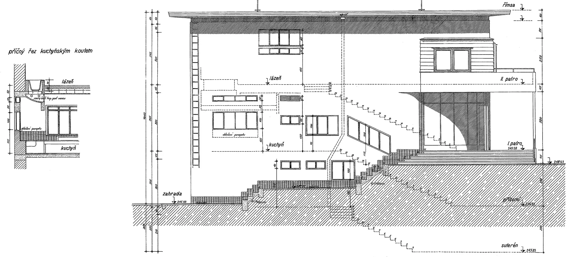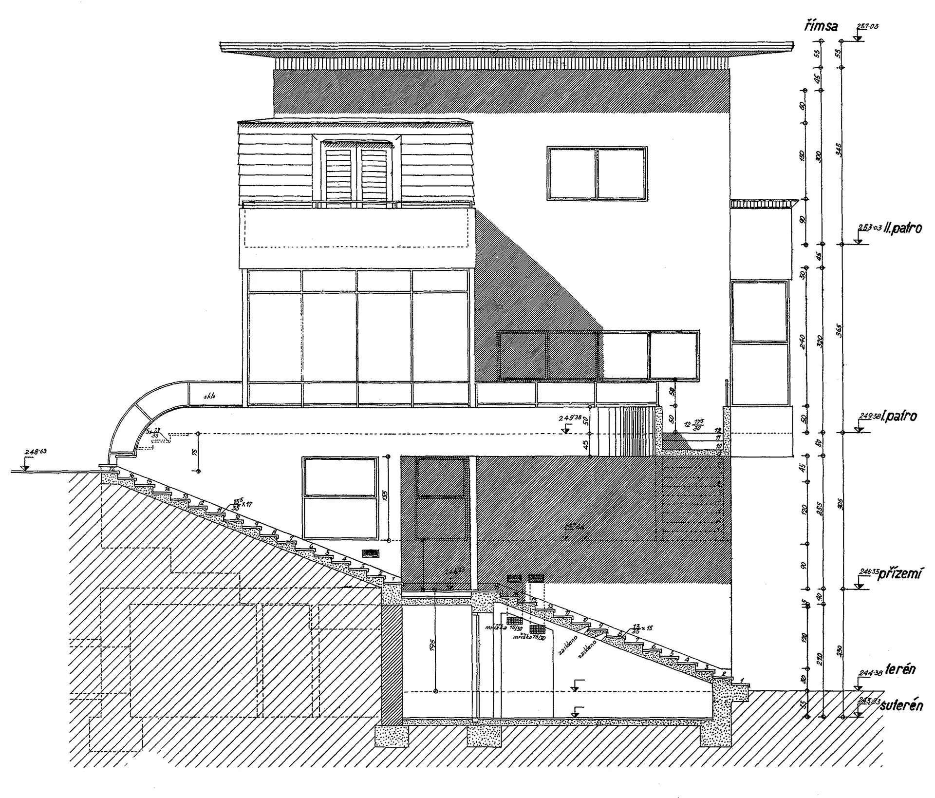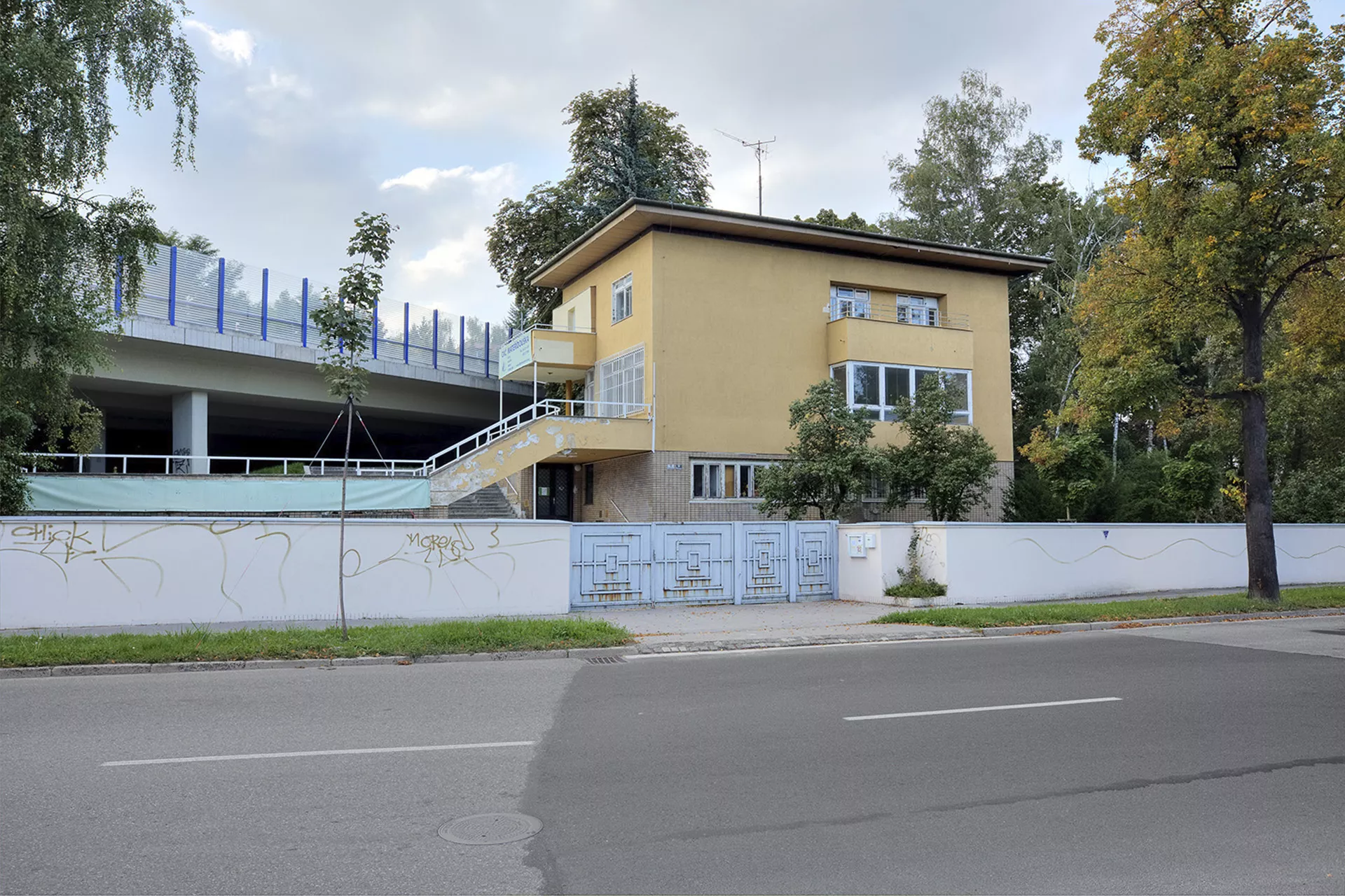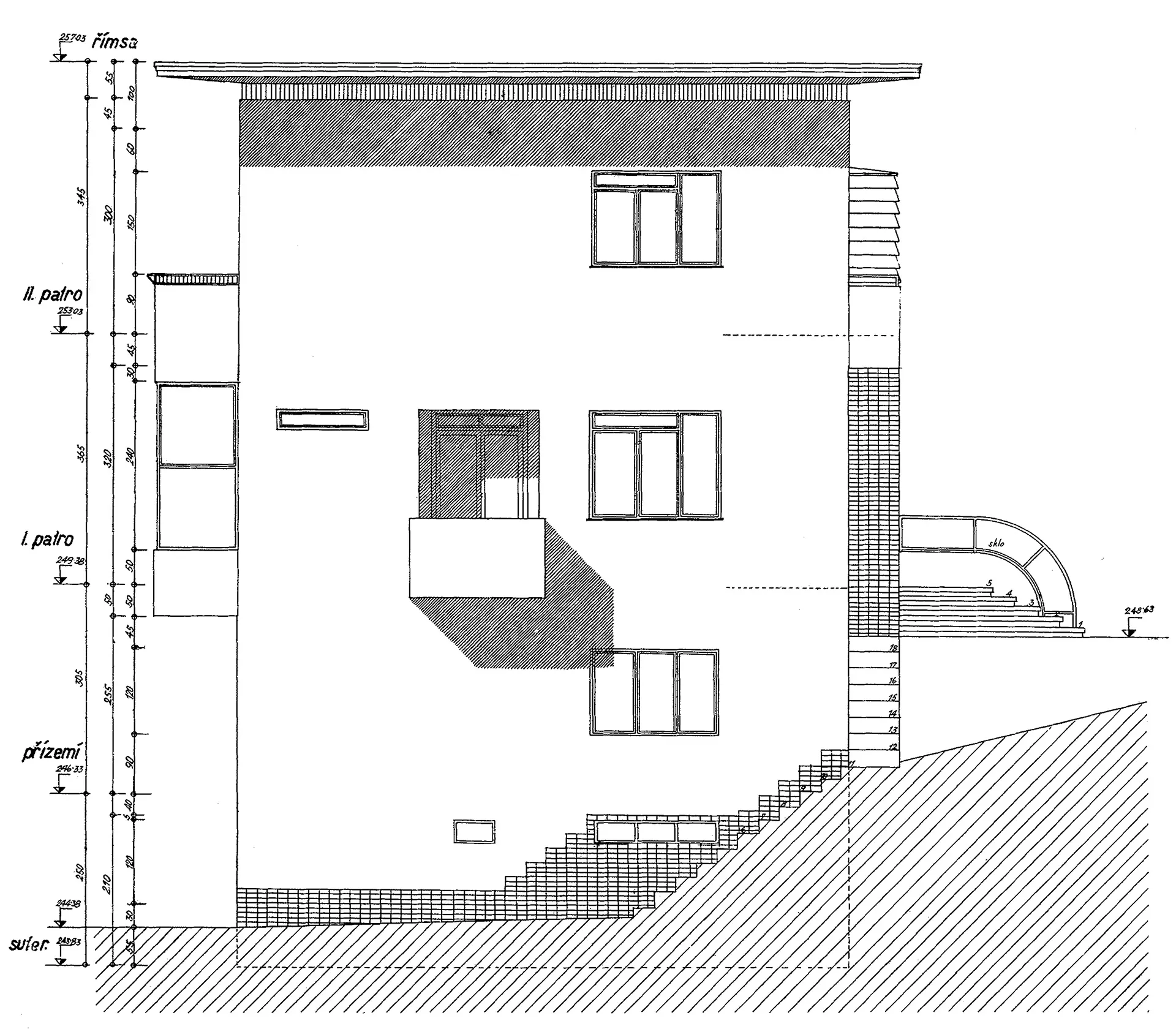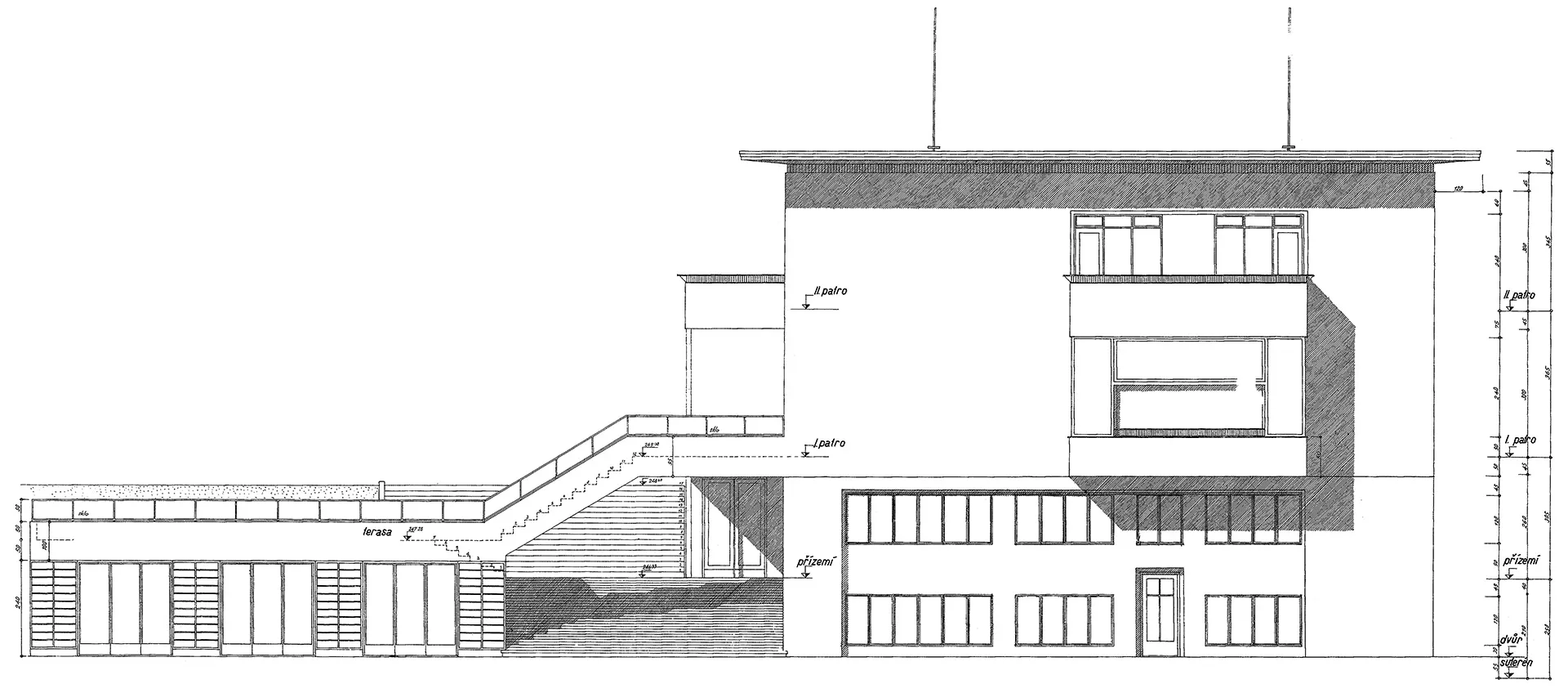 The Kuba brothers' building activities made an enormous contribution to the development of interwar Brno. Alois' entrepreneurial skills and Vilém's designs resulted in the building of several hundred terraced houses and apartment buildings boasting sophisticated architectural and economic concepts. Alois Kuba's villa enjoys a unique position in the context of Vilém's architectural works. This is not only for the villa's generous concept and the volume of financial resources invested, but also the architectural quality of the setting of the structure in the terrain of the garden as well as a number of original details. The two-storey villa is situated on a sloping plot, originally a large garden. The main entrance is sunk below the level of the ground and is accessible via a wide staircase. The prominent curve of another staircase spans this entrance yard and links the house with the terrace on the roof of the garage. The ground floor housed the janitor's apartment and servants' rooms. The staircase in the entrance lounge leads to the hall upstairs lit by the round glazed wall of the conservatory. This is where the living room and kitchen are situated. The bedroom, dressing room and bathroom are located on the top floor with another roofed terrace. The vast basement held service facilities including a central heating boiler room and an air raid shelter. One can marvel at both the technical equipment and some dynamic architectural features such as the ceiling hole for the portal of the staircase on the ground floor or the distinctively protruding cornice. The interior of the house was equipped with furniture designed by the Kuba brothers and manufactured by the UP company of Brno. Held for a short period of time by the Gestapo in 1943, builder Alois Kuba was forced to sell the villa to Edith Piesch, a Brno citizen of German origin, and move to his apartment in Kotlářská Street within one month. (He acquired another villa in Barvičova Street by Mojmír Kyselka shortly thereafter.) After the war the villa was confiscated and served as a healthcare facility. In 1957, a nursery school was set up in the villa; twenty years later it became the headquarters of the StB (State Security). After the revolution, the house was transferred to the City of Brno and its further use is the subject of negotiations. The seriously dilapidated villa was also damaged by the construction of a nearby road. Thanks to efforts in the profession, the villa was finally declared an object of cultural heritage in 2009. PH
