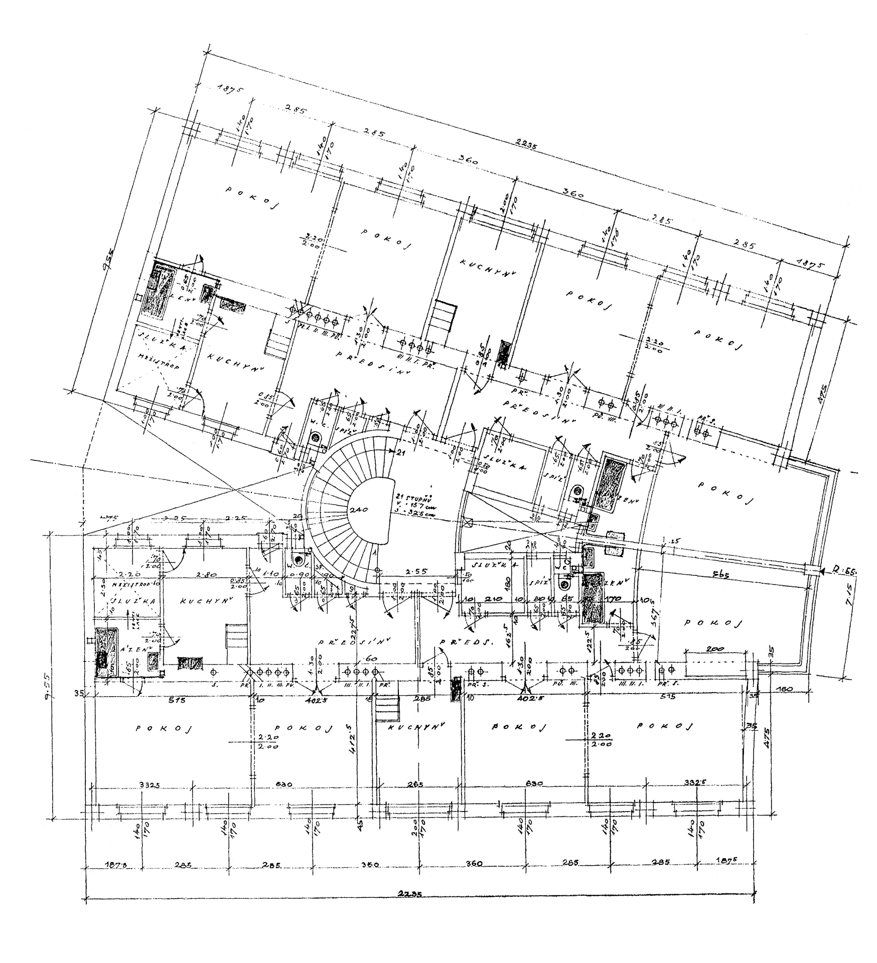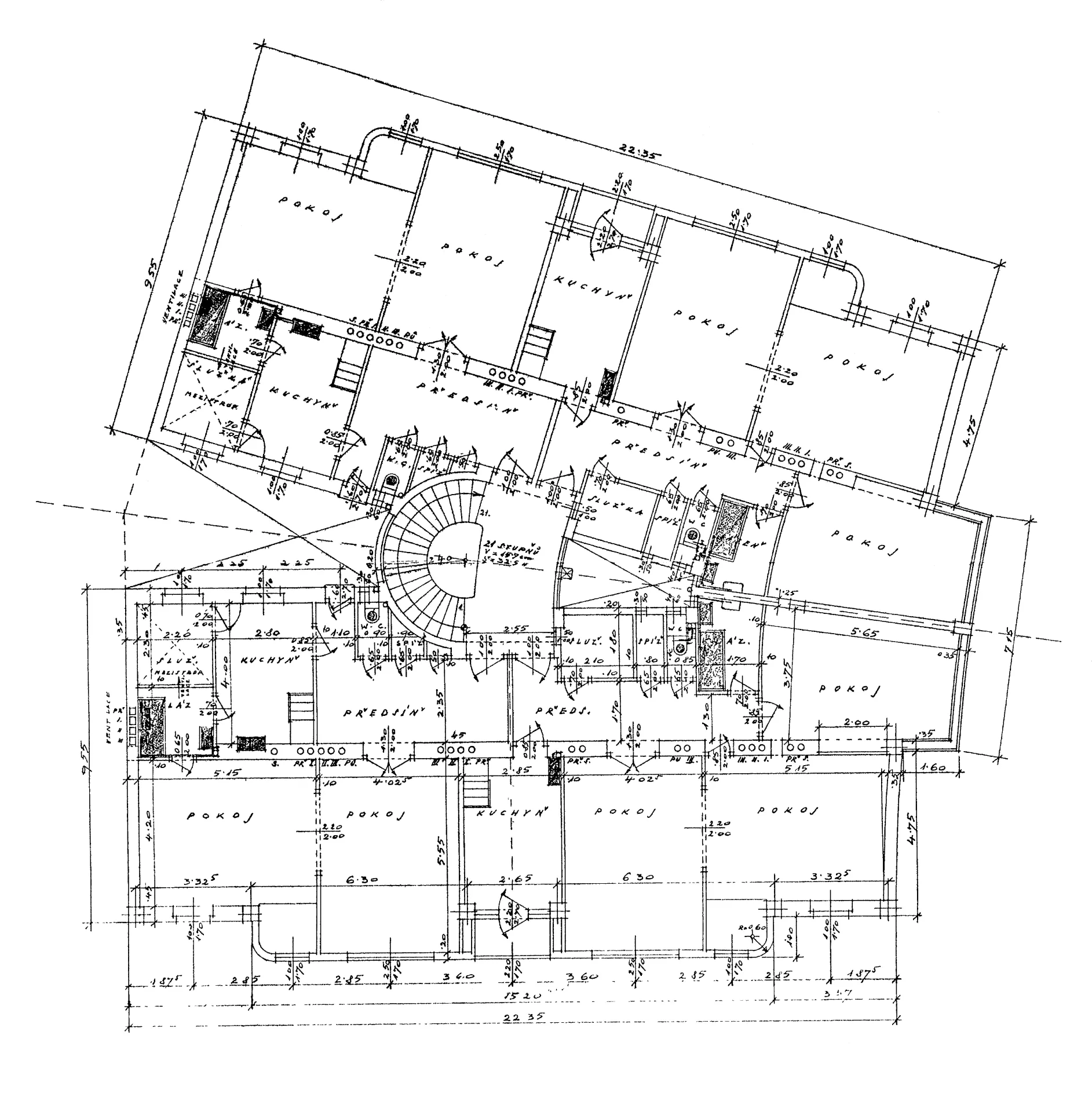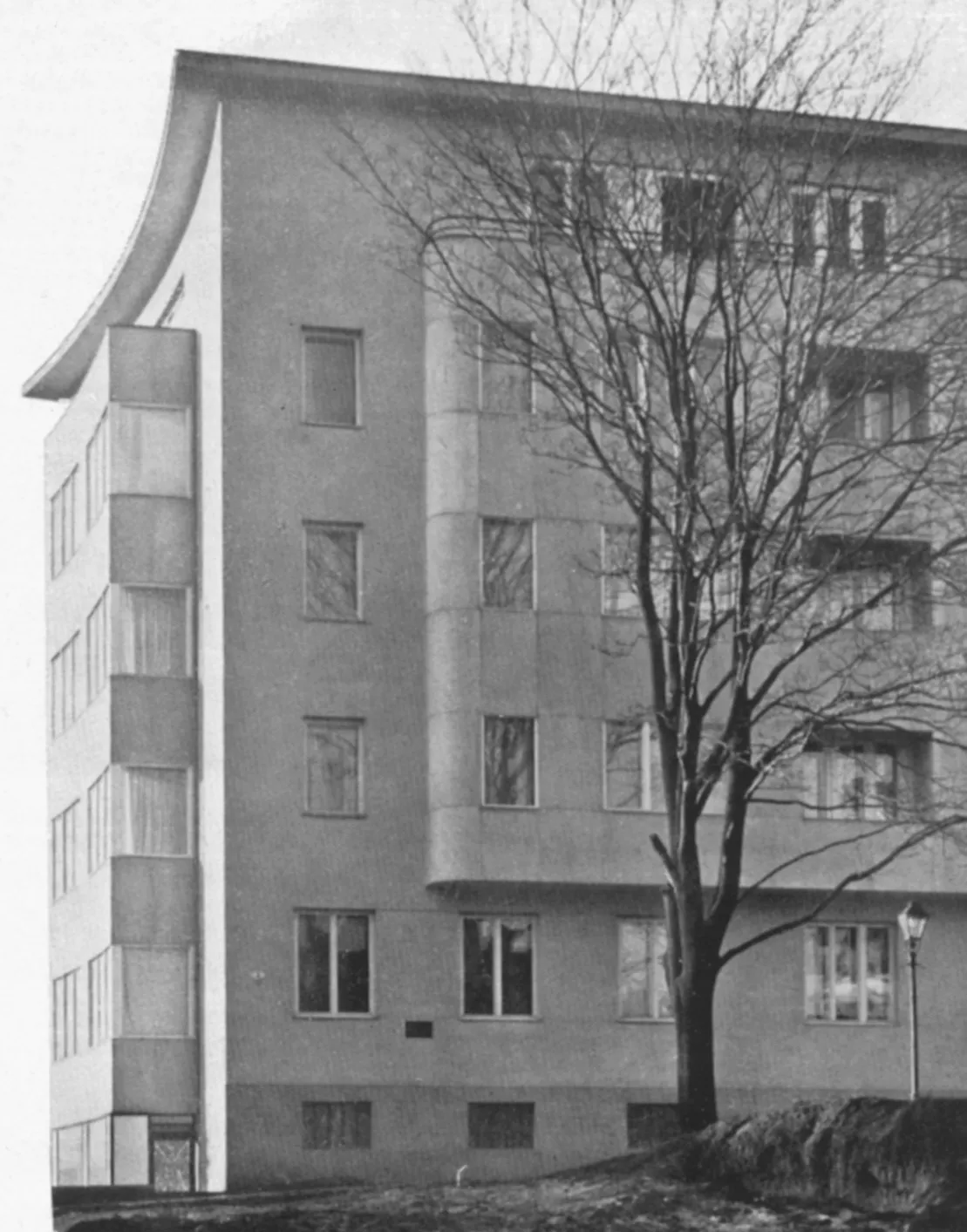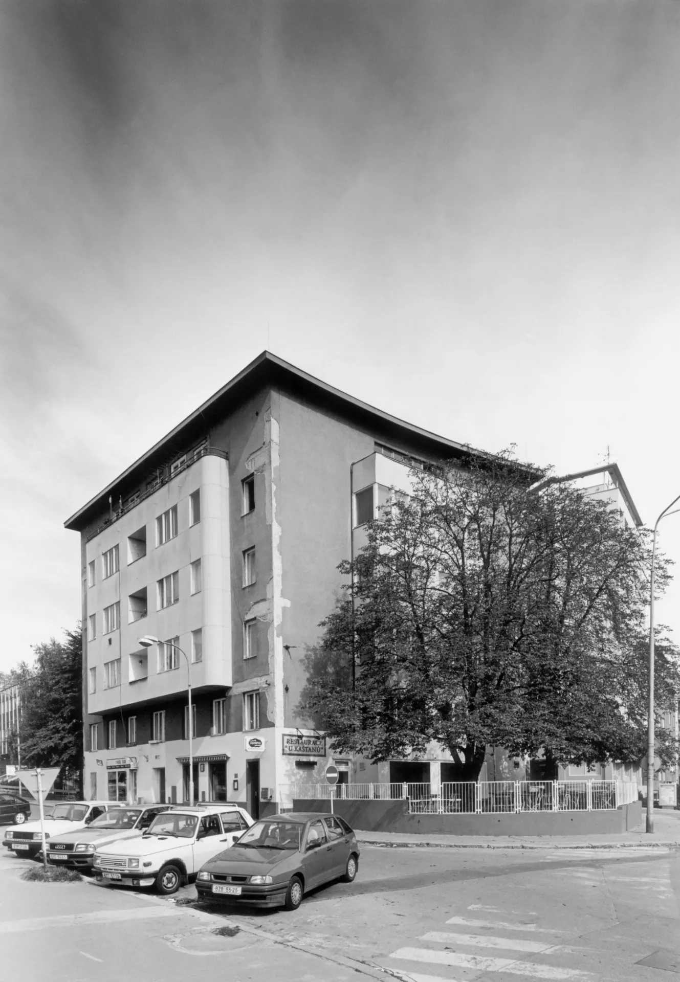 The apartment building designed by Hungarian architect Zikmund Kerekes for the Meerbaums in 1929 became a landmark at the end of Černopolní and Durďákova streets. This five-storey building was erected on a V-shaped ground plan, which enables the maximum use of the land as well as sufficient ventilation of service areas facing the inner yard. The windows of the residential rooms in the street facades face south, west and east.The facades overlooking Durďákova and Černopolní streets feature prominent four-level square bays with rounded corners, central loggias and a terrace. The two stretches of the corner windows enhance the risalit of the main concave facade in Merhautova Street, which is also accented by the curve of the monumental crown molding. The elevated ground floor is occupied by the popular U kaštanů pub with an adjacent terrace shaded by two large chestnut trees. LV