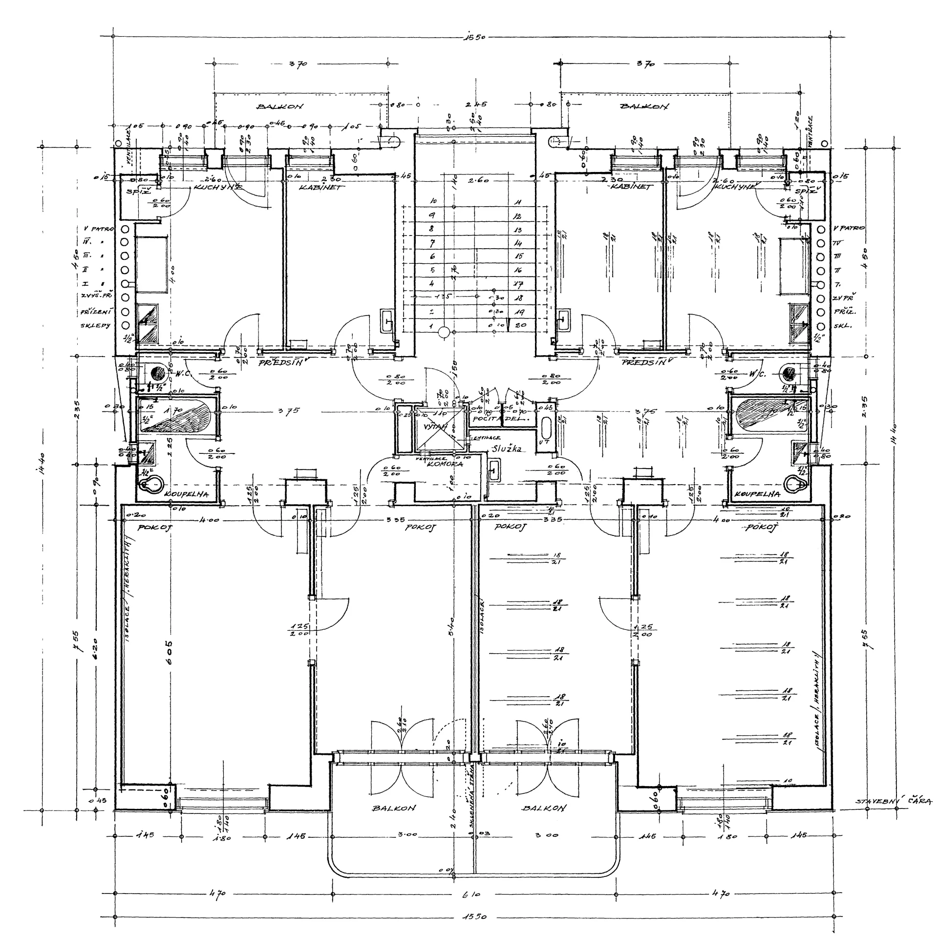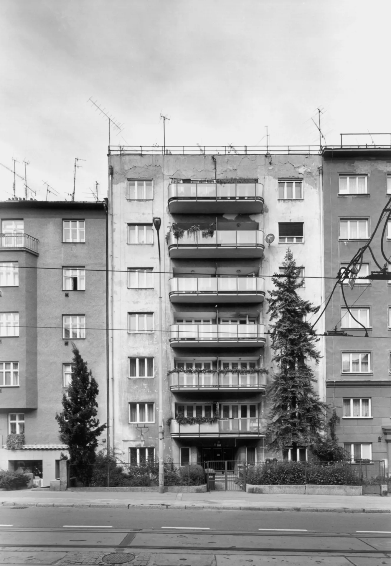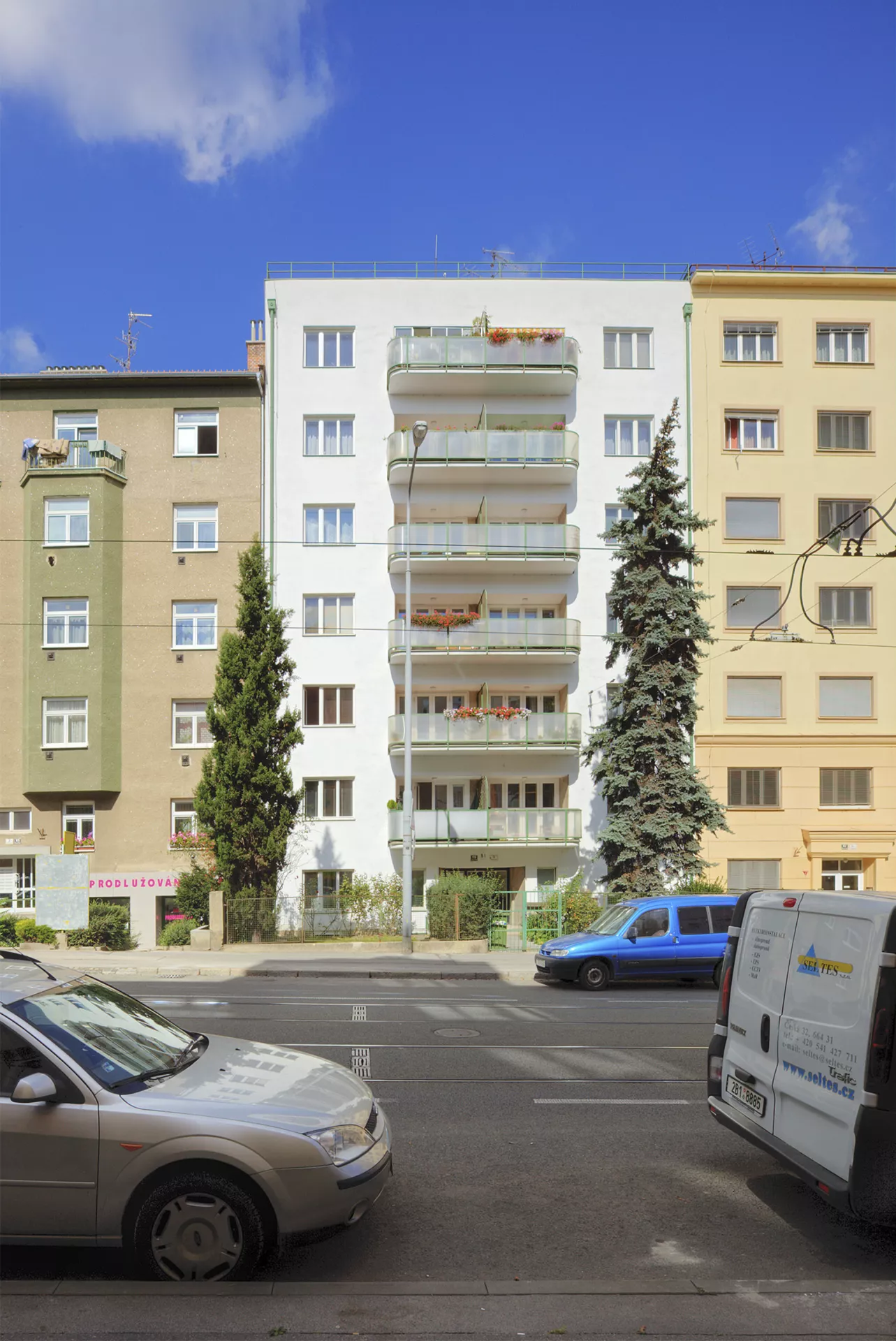 This seven-storey apartment block designed by Zikmund Kerekes grew on this plot in Merhautova Street in 1936. Its front is divided by the lines of three-part windows and the central axis of rounded balconies shared by two apartments. Underneath is the main entrance, whose bevelled reveal is covered with cement slate. This material is also present in other buildings by Kerekes and replaces stone or ceramic cladding. The interior of the building features a plain and logical layout; each floor houses two spacious apartments. The yard is overlooked by the windows of kitchens and small rooms; the entrance hall provided access to the bathrooms and rooms facing the street. Recent reconstruction work restored the building's original white colour. LV