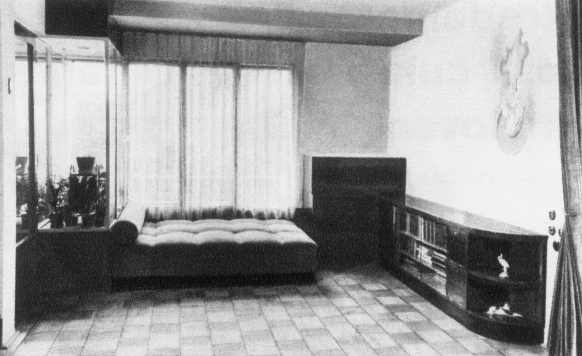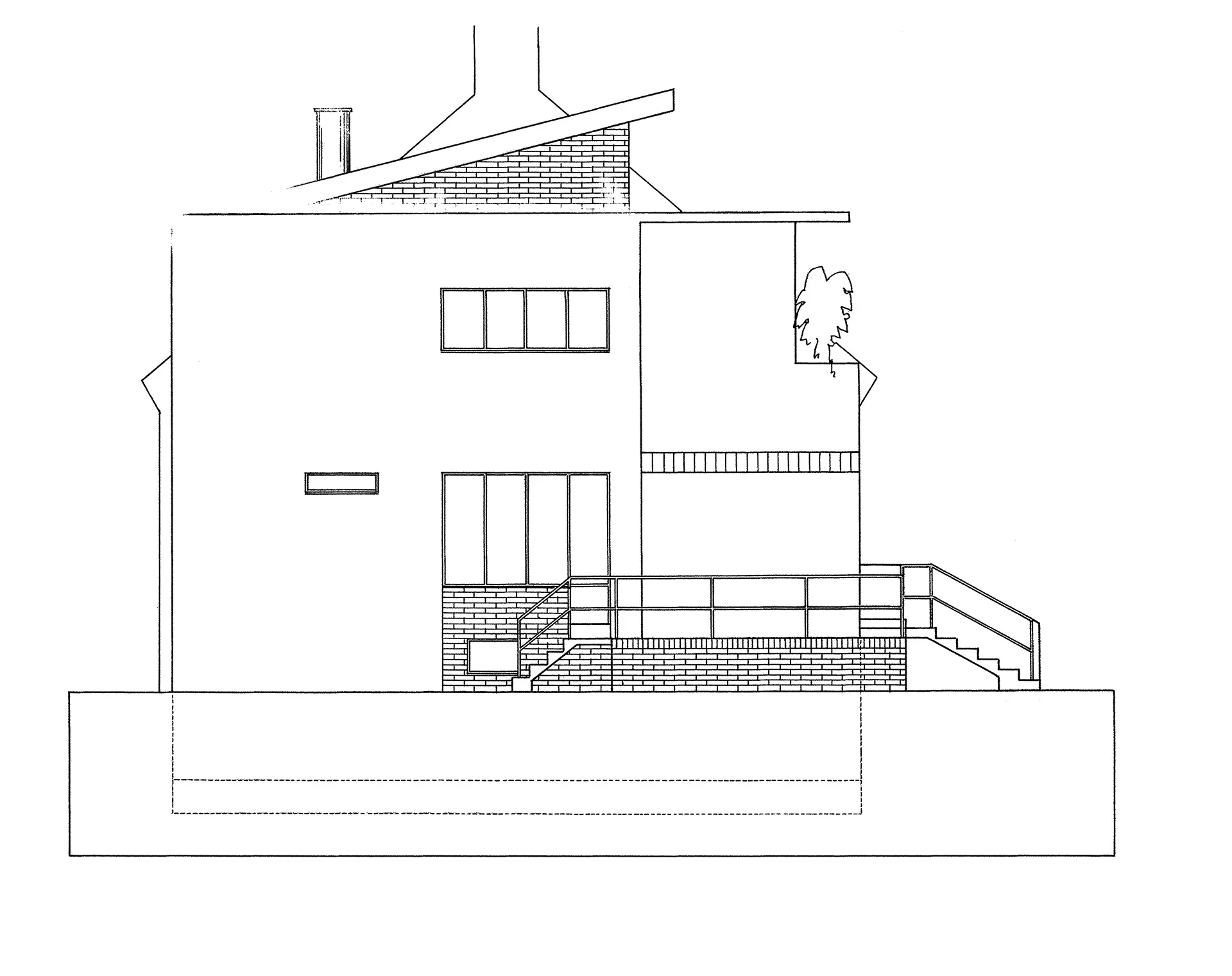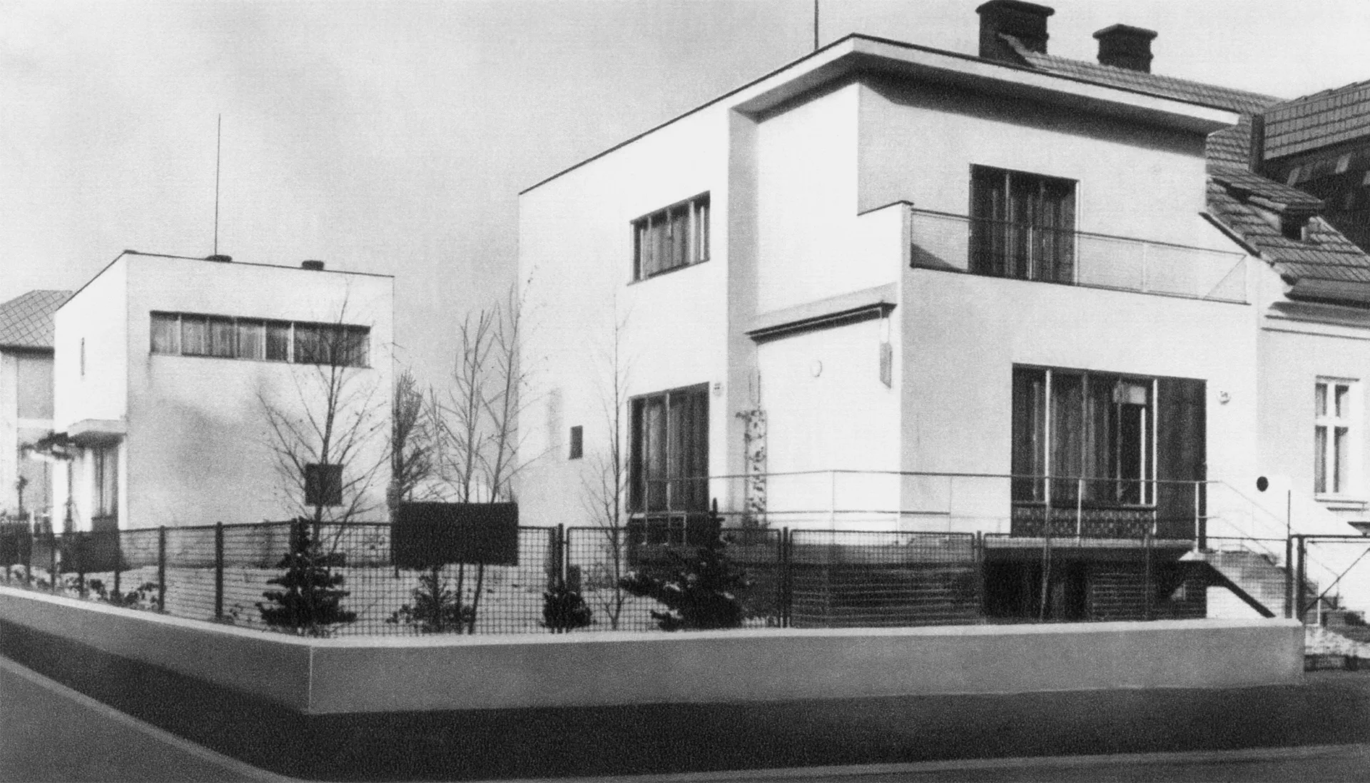 The house designed by Josef Kranz in Pflegrova Street for Ludmila Vařechová-Markesová was built at the same time as the neighbouring villa owned by Karla Ošťádalová, in fact, there originally was no fence separating the two plots. The main entrance to the house is again situated on the raised ground floor, as the basement was occupied by service areas, very much like in the neighbouring villa. The house is accessible via the terrace on the landing reaching as far as the side facade, where it could be shaded by awnings. The entrance leads to a residential hall that also served as a study, dining room as well as living room with large windows looking out on the garden. The first floor housed the guest room and bedroom with a terrace partially covered by the protruding cornice. The living room was decorated by an expressive wall painting by the architect himself; the furnishing also featured pronounced colours with light and dark cork panels, a yellow floor, light ash veneers of the built-in furniture as well as blue upholstery and curtains.