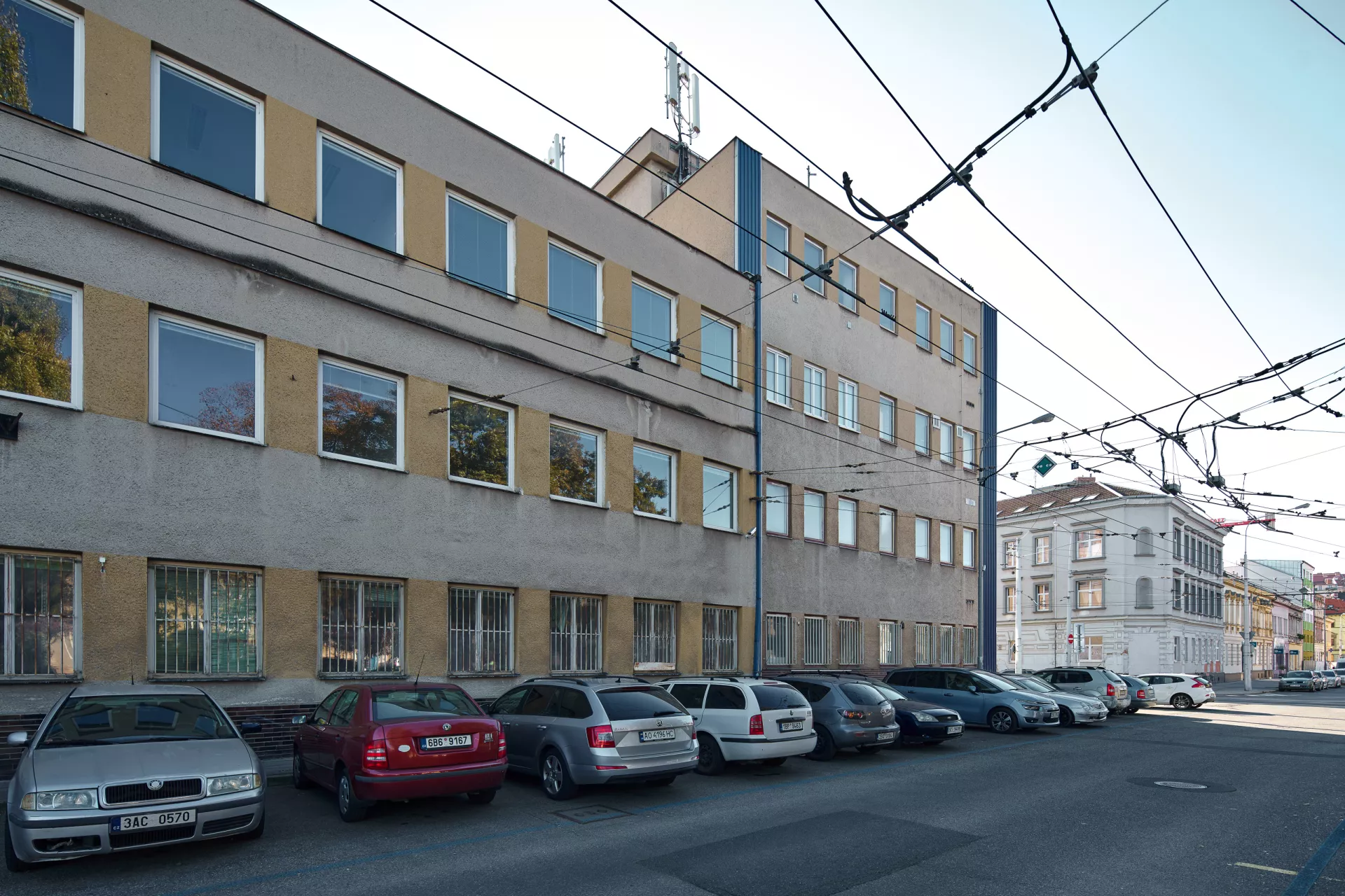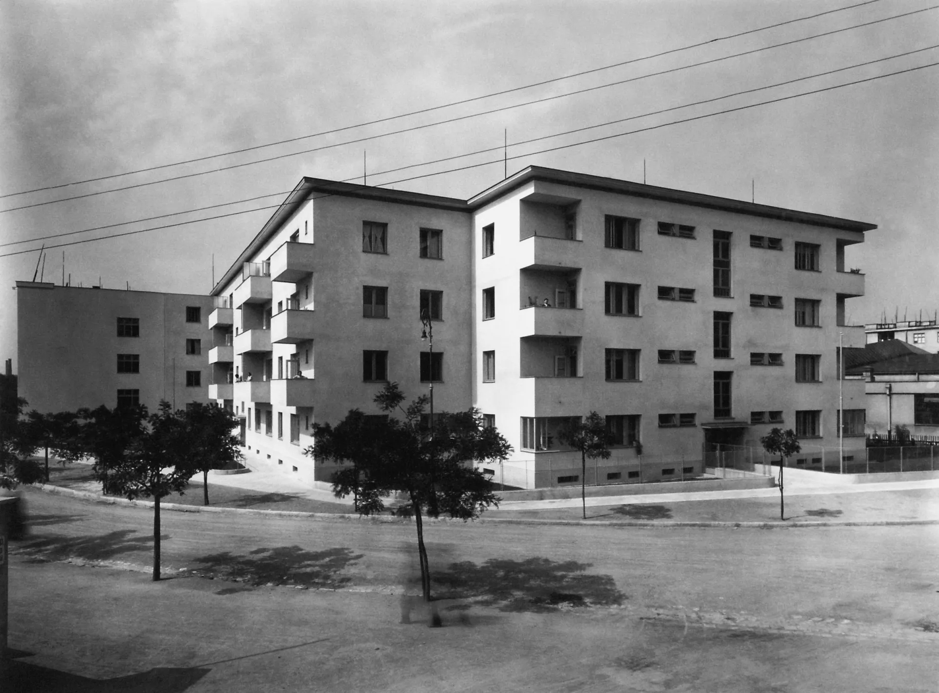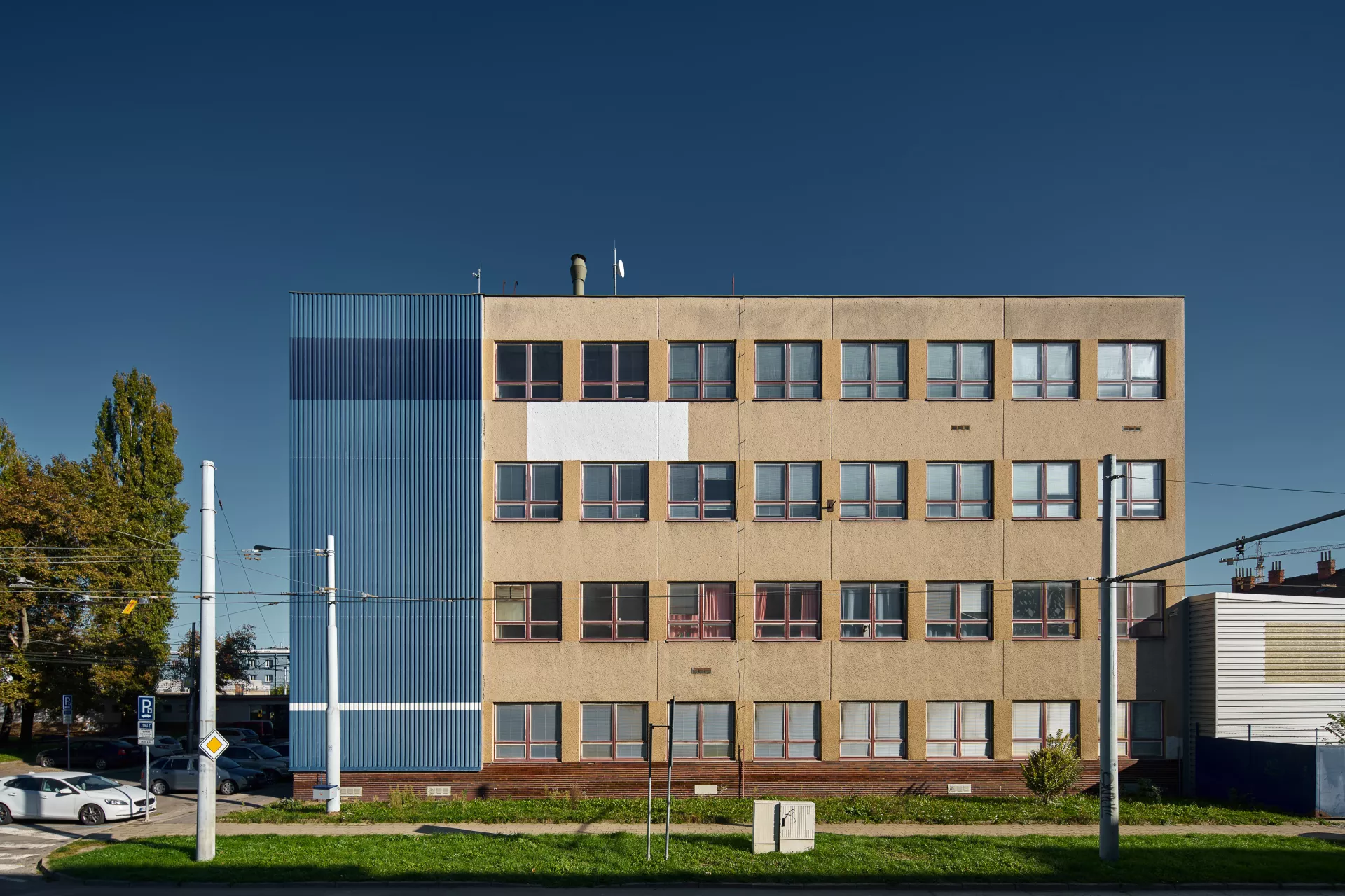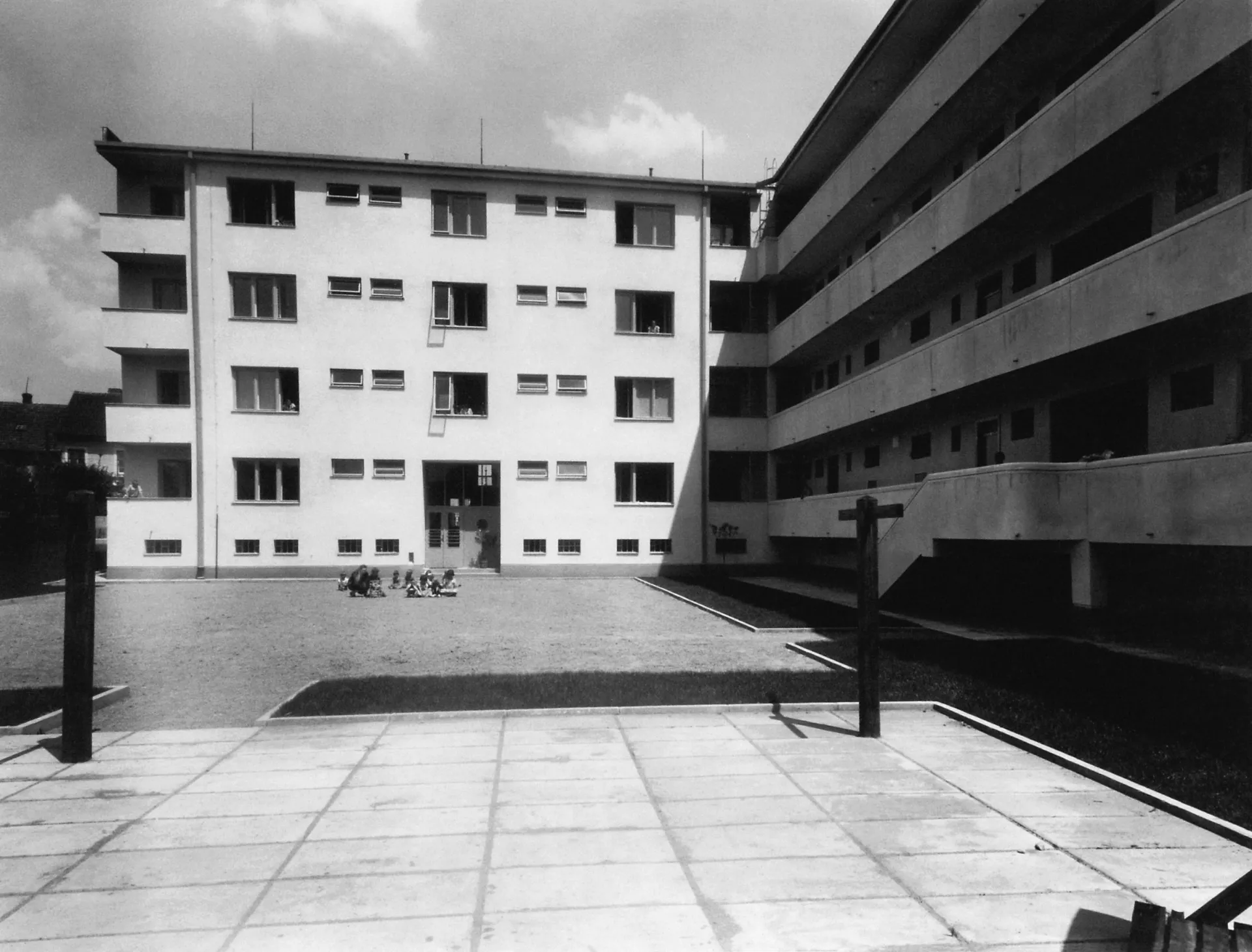 In 1936 a new building act was enacted in an attempt to address the continued lack of affordable housing by means of subsidies. Brno officials decided to make use of allowances and add new buildings to Fuchs' older complex with small apartments built in Husovice. Two four-storey buildings with minimal apartment units designed by Josef Polášek in 1936-38 are directly linked to Fuchs' buildings on Svitavské nábřeží, and their L-shaped ground plan delimits an inner area occupied by children's playground. The street frontage of the house on the bank of the Svitava River was originally segmented by balconies made of brick; these were later replaced with a protruding steel structure. The central location of the plain main entrance is enhanced by the rectangular windows of the staircase. The inner yard facade is segmented by lines of galleries providing access to all apartments. Each floor housed six apartments units consisting of a small hall, a living room/kitchen with a balcony, a bedroom and a bathroom with a shower and a lavatory. The house in Dačického Street is perpendicular to the building with the galleries and its apartments (4 on each floor) are accessible from staircase landings. The loggias of small bedrooms adjoined the living room/kitchen are cut directly into the corners of the street and yard facade. The apartments met all of the standard hygienic requirements of the time, including separate sleeping quarters for children and adults. LV