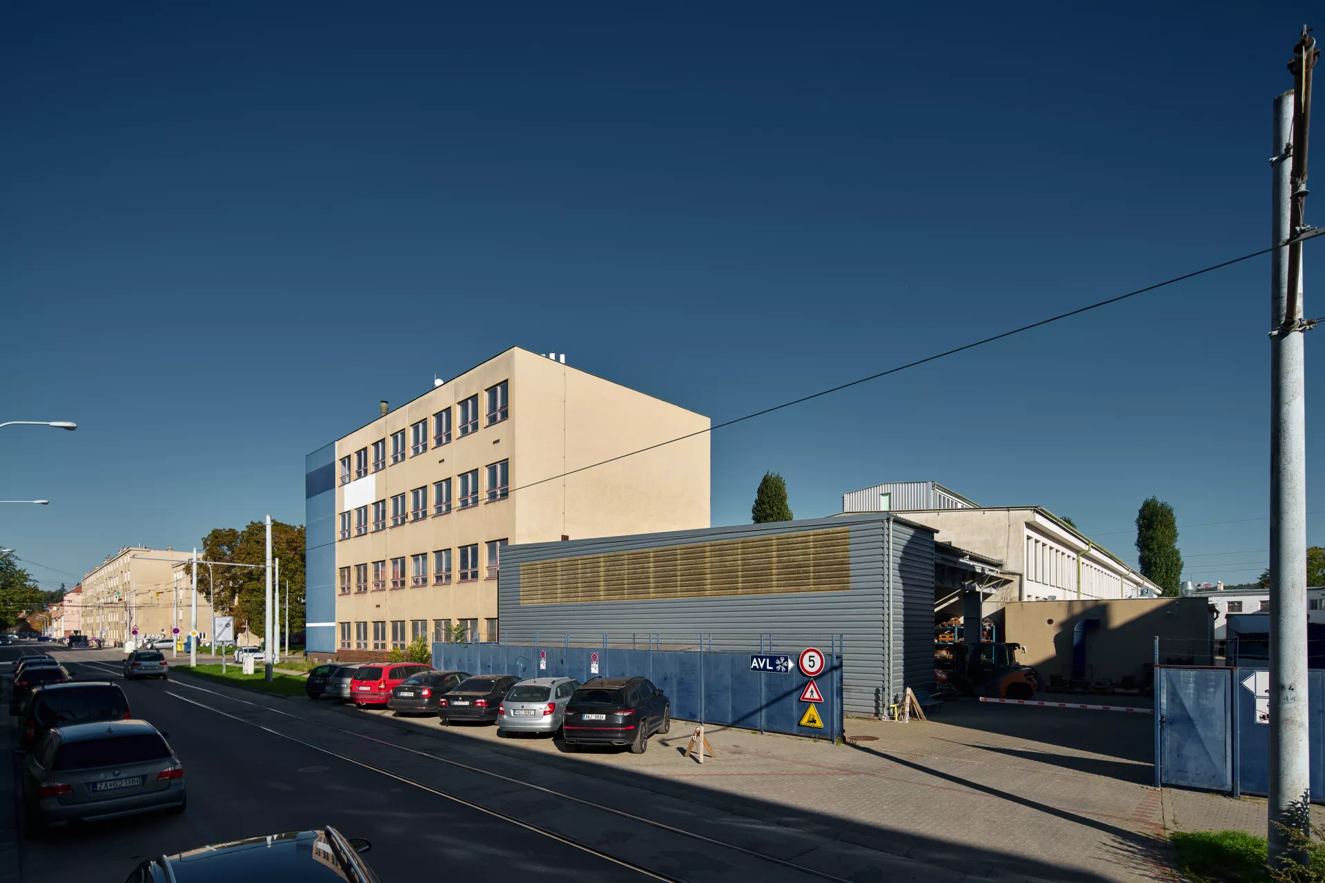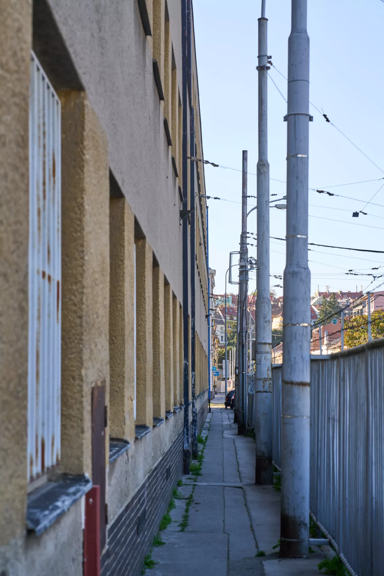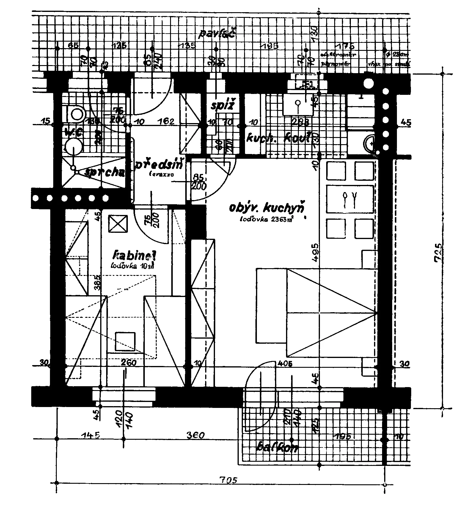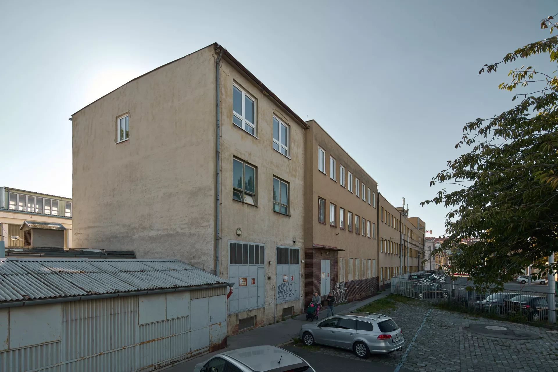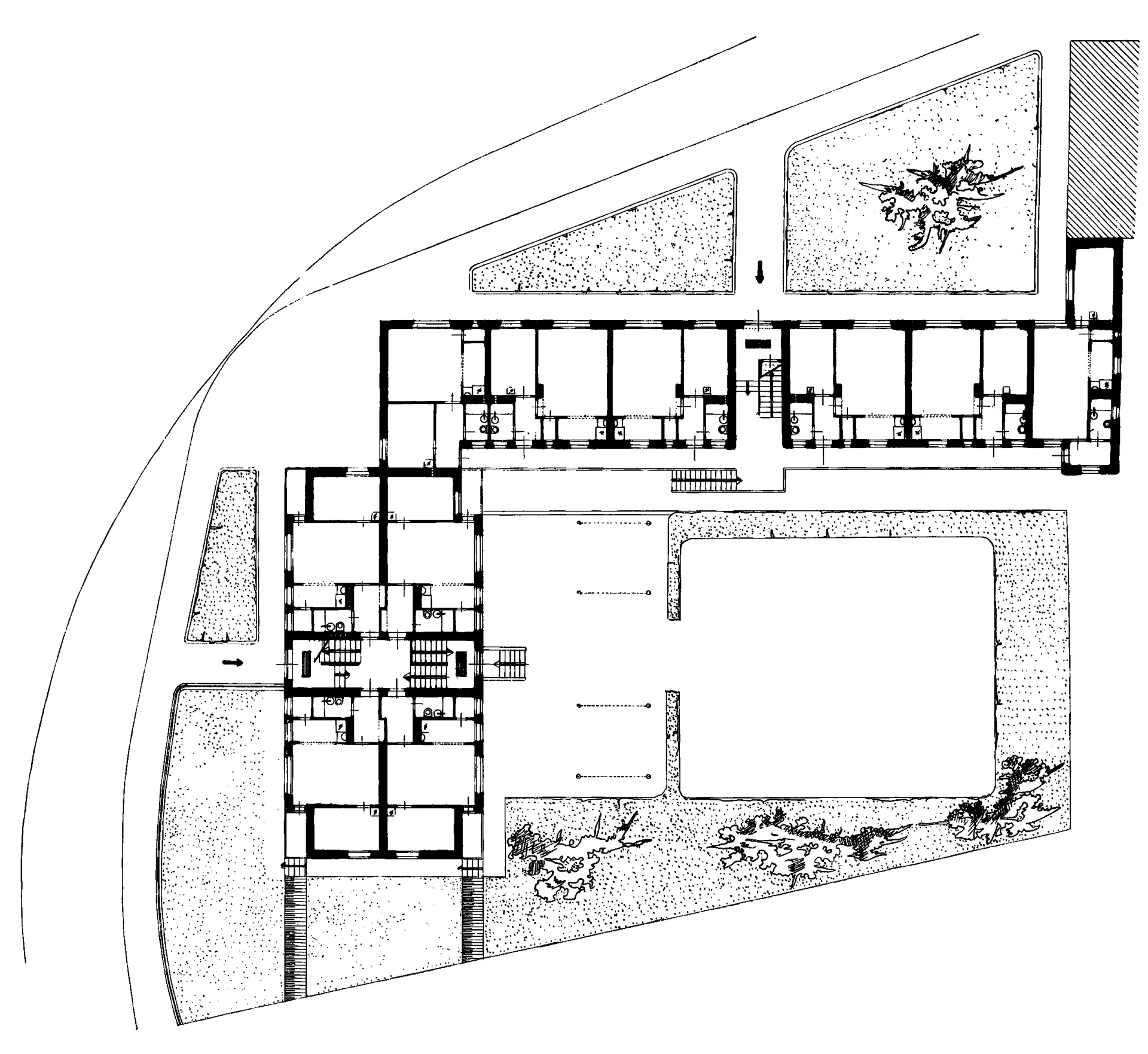 In 1936 a new building act was enacted in an attempt to address the continued lack of affordable housing by means of subsidies. Brno officials decided to make use of allowances and add new buildings to Fuchs' older complex with small apartments built in Husovice. Two four-storey buildings with minimal apartment units designed by Josef Polášek in 1936-38 are directly linked to Fuchs' buildings on Svitavské nábřeží, and their L-shaped ground plan delimits an inner area occupied by children's playground. The street frontage of the house on the bank of the Svitava River was originally segmented by balconies made of brick; these were later replaced with a protruding steel structure. The central location of the plain main entrance is enhanced by the rectangular windows of the staircase. The inner yard facade is segmented by lines of galleries providing access to all apartments. Each floor housed six apartments units consisting of a small hall, a living room/kitchen with a balcony, a bedroom and a bathroom with a shower and a lavatory. The house in Dačického Street is perpendicular to the building with the galleries and its apartments (4 on each floor) are accessible from staircase landings. The loggias of small bedrooms adjoined the living room/kitchen are cut directly into the corners of the street and yard facade. The apartments met all of the standard hygienic requirements of the time, including separate sleeping quarters for children and adults. LV