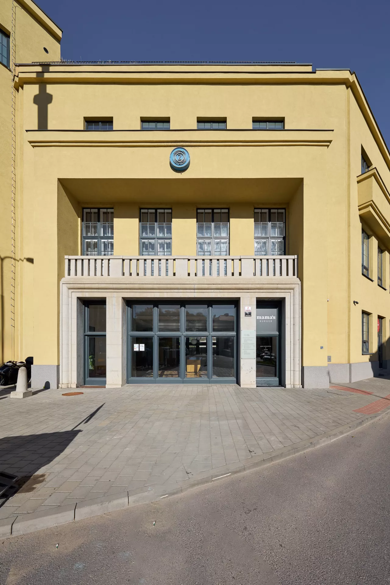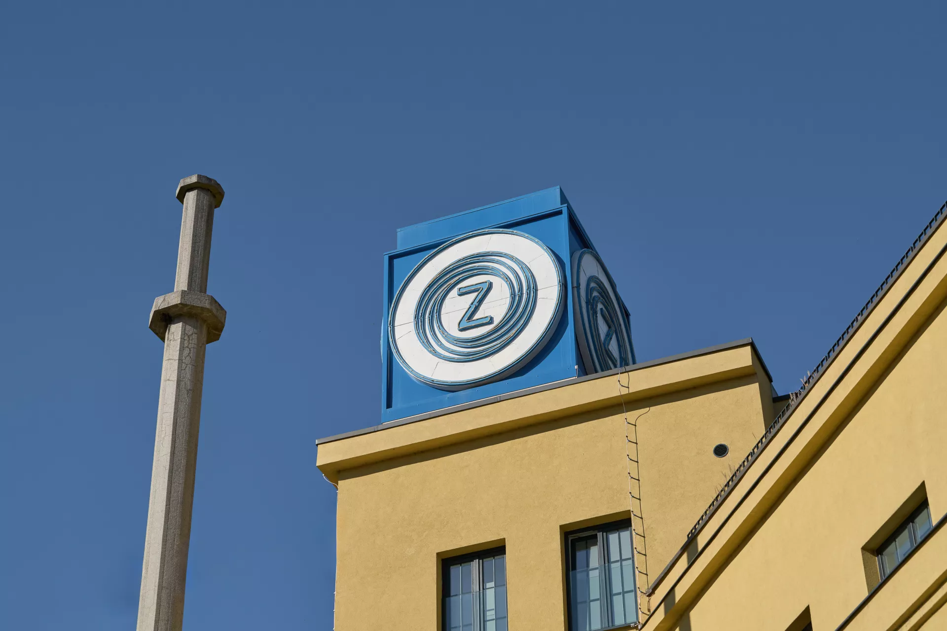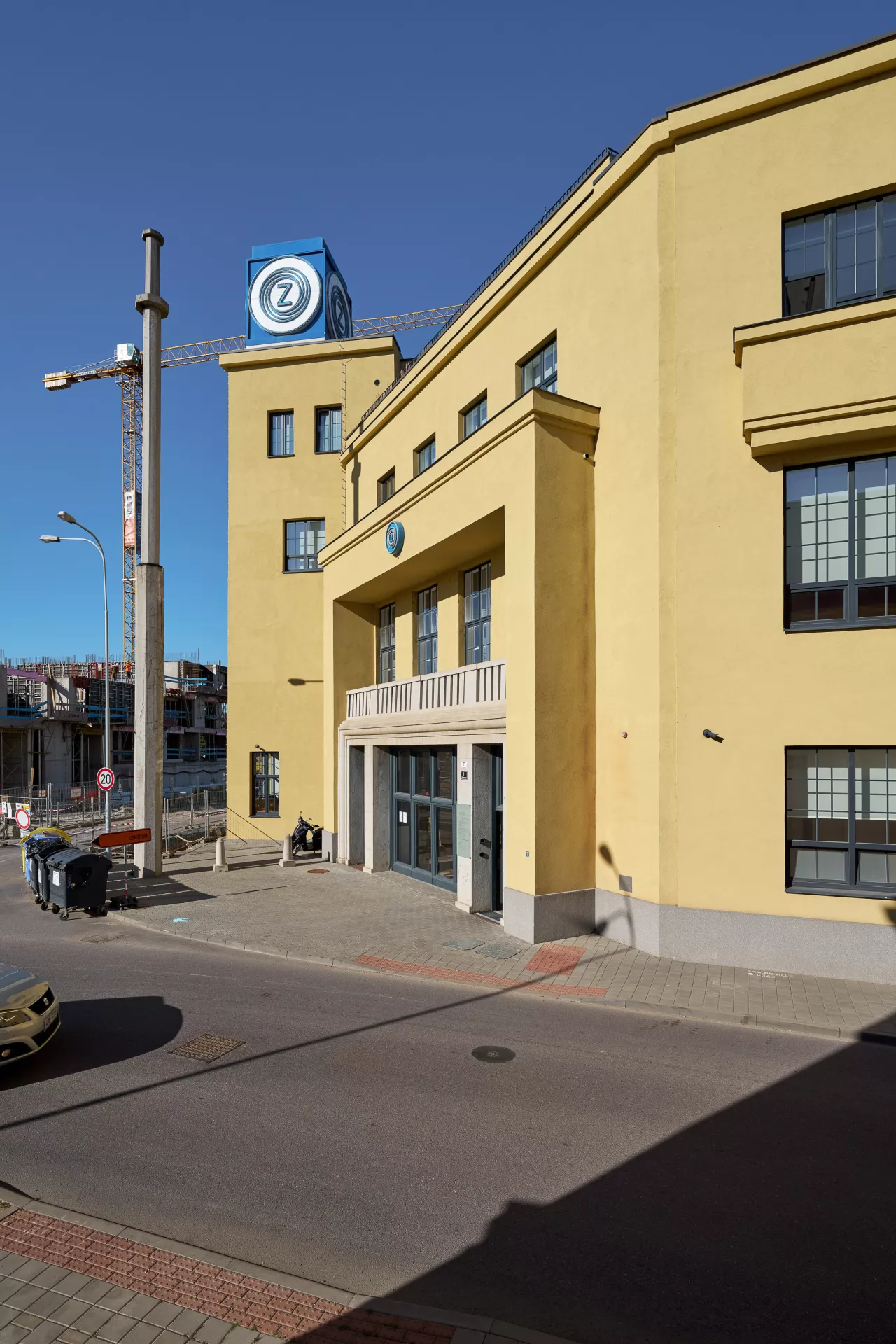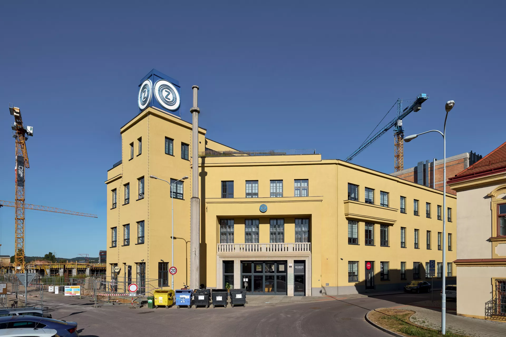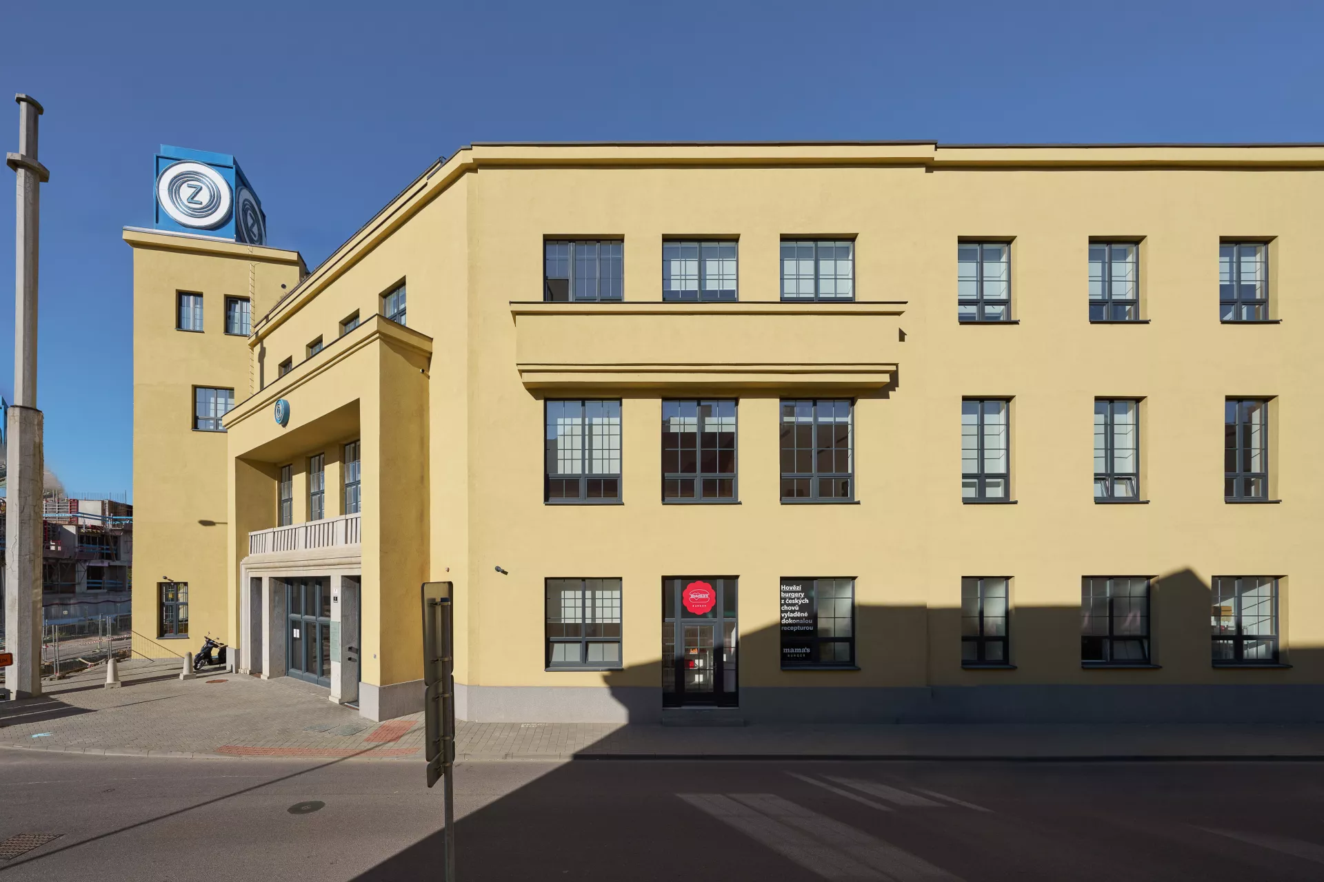 The Czechoslovak Arms Company was established in Brno in 1918 with manufacturing facilities in former Austro-Hungarian artillery shops. However, the range of the company's products expanded beyond arms in the interwar period to include machining tools, industrial scales, aircraft engines, bicycles and typewriters. The company developed Czechoslovakia's first car with front wheel drive, the Z4, in the 1930s. As production grew in the late 1920s, so did the plant in Zábrdovice. In 1928 the new administration building designed by Bohumír Čermák was built with a tower as the monumental entrance to the complex. It also featured the company's most formal areas – sales management offices and a showroom displaying new car models. The sloped front of the building with the main entrance creates an entrance area in front of the gate. The classical facade is decorated with two lesenes topped by a balcony and framing the loggia on the first floor with the balustrade. On the left is the tower's elevated risalit topped by a cube with the neon logo of the company. PH