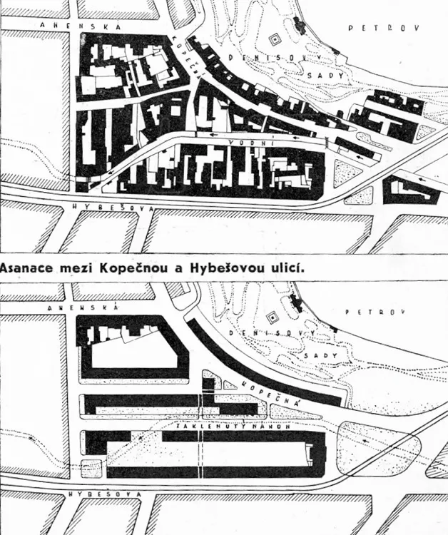 During WWII the Urban Planning Department of the Brno Building Office realized several extensive urban projects prepared in the 1930s. Rudolf Spazier, the mayor of Brno before the war, put a heavy emphasis on conceptual urban development by professionals. In 1939, shortly before he was removed from office and imprisoned by the Nazis, Spazier promoted the publication of Brno of Tomorrow. The work contains future urban development plans, the grandeur and rigor of which were based on the modernistic faith in progress and social prosperity. The most significant urban planning feats included the connection of the city's small ring route at the junction of Husova and Nádražní streets. The demolition of older buildings and the construction of the wall visible from Kopečná Street took place in 1939-41. It was also linked to the planned redevelopment of Old Brno involving demolitions of old buildings, filling in the Svratka millrace in Vodní Street (using the excavated soil and debris) and building new apartment buildings. This intention, which destroyed the picturesque embankments of the millrace dubbed "Brno Venice," was realized during the war; however, due to the political situation in the following years, not all of the planned buildings were built. As a result, this part of Old Brno remains undeveloped to this day. PH