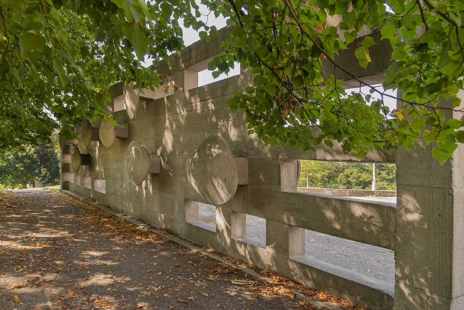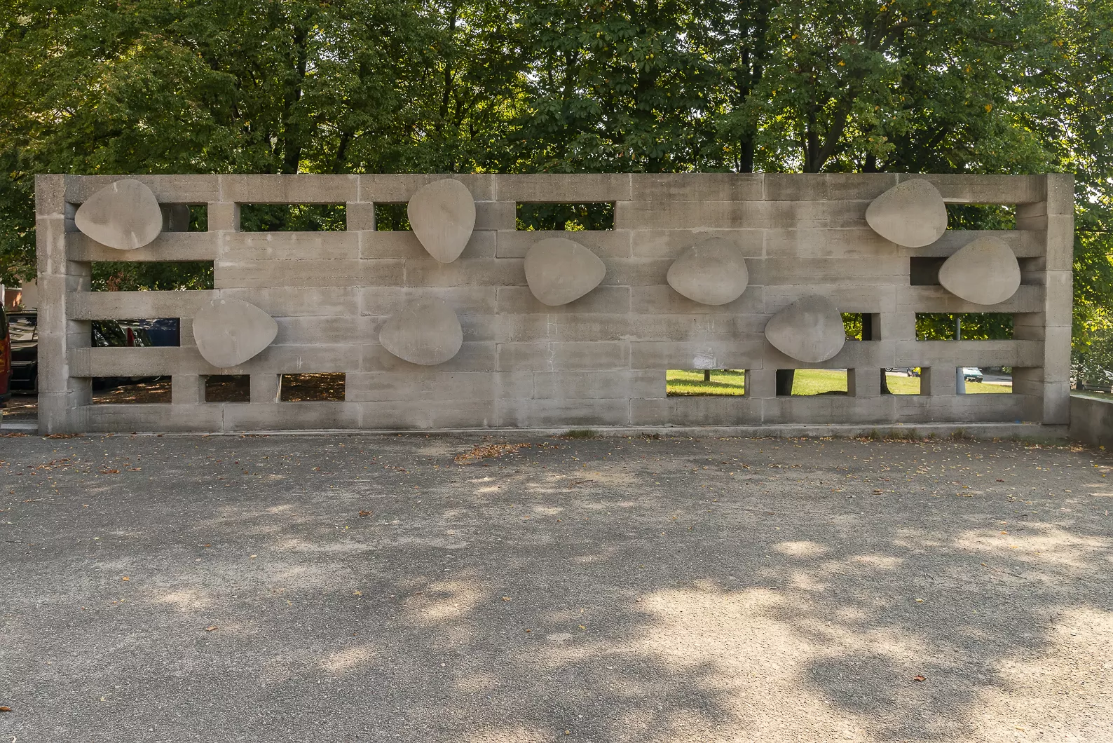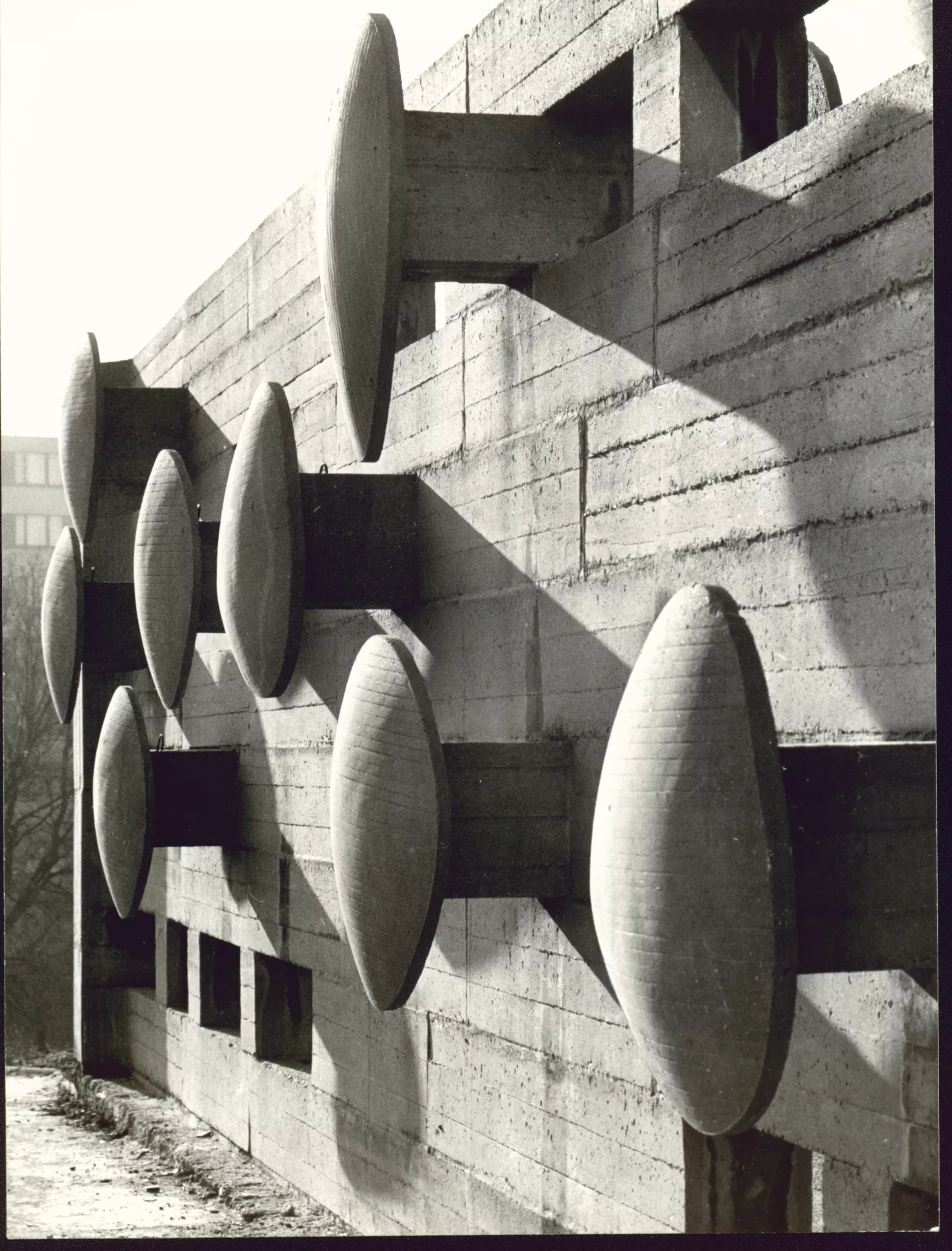 In 1969, a year before the completion of the construction of the district of Lesná, a series of so-called decorative walls was created. The architect Viktor Rudiš was in charge of the selection of artists and consultations with regard to the placement of the individual sculptural elements. He approached nine artists. ‘In front of every large building, we designed a paved play area for children’s games demarcated by walls conceived as art objects. I only determined the size and material, the concept was up to the artist,’ said Rudiš in the publication The Sixties in Architecture through the Eyes of Contemporary Witnesses. The walls were functional and conceived in various ways. They were built from material used directly in the process of constructing the housing estates, such as concrete, paving stones, or bricks. The humanisation of the space around the monumental prefabricated concrete panel blocks was an essential task, which was also referred to in a commentary in the periodical Architecture ČSSR from 1968: ‘This collection of small architecture brings a necessary human dimension into the individual spaces, which is particularly desirable in urban areas of large prefabricated panel buildings.’ Sylva Lacinová’s creation used prefabricated concrete blocks, which she placed on top of each other irregularly, thus creating apertures in certain parts and, from a functional point of view, also imaginary entrances for children’s games. The concrete block is complemented by nine sculpted targets entering the space, which resemble the aesthetics of the Brussels Expo 58. The author thereby created not only a decorative wall that demarcates and livens up the public space, but also a possible source of children’s games. DK