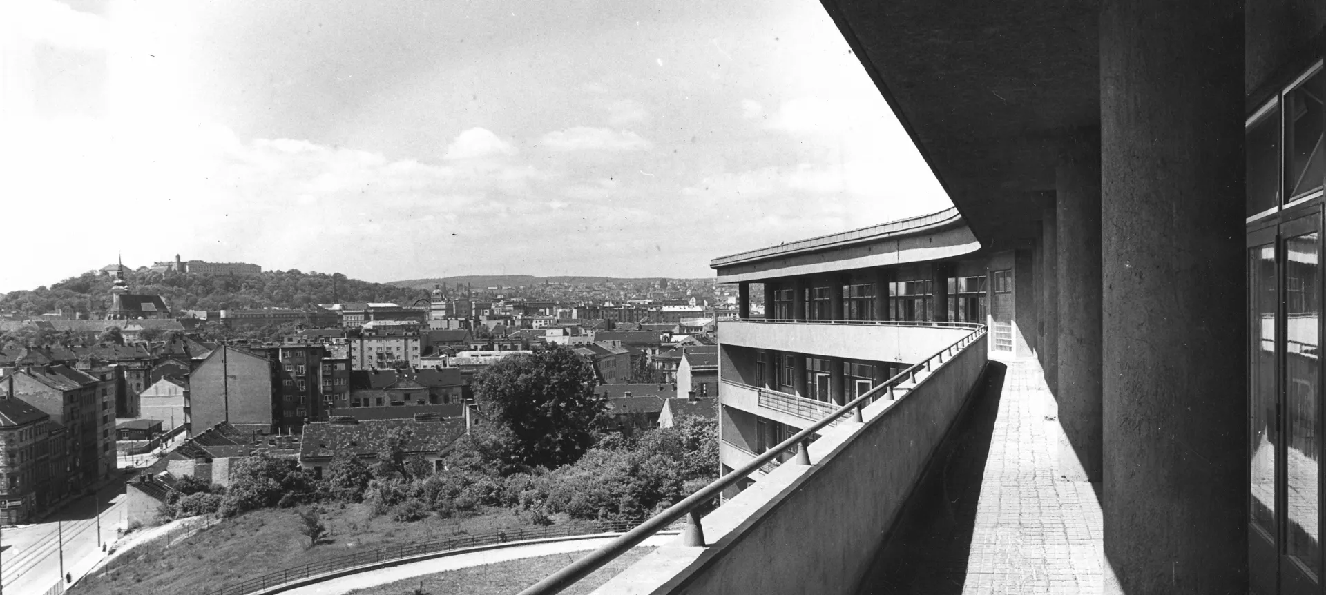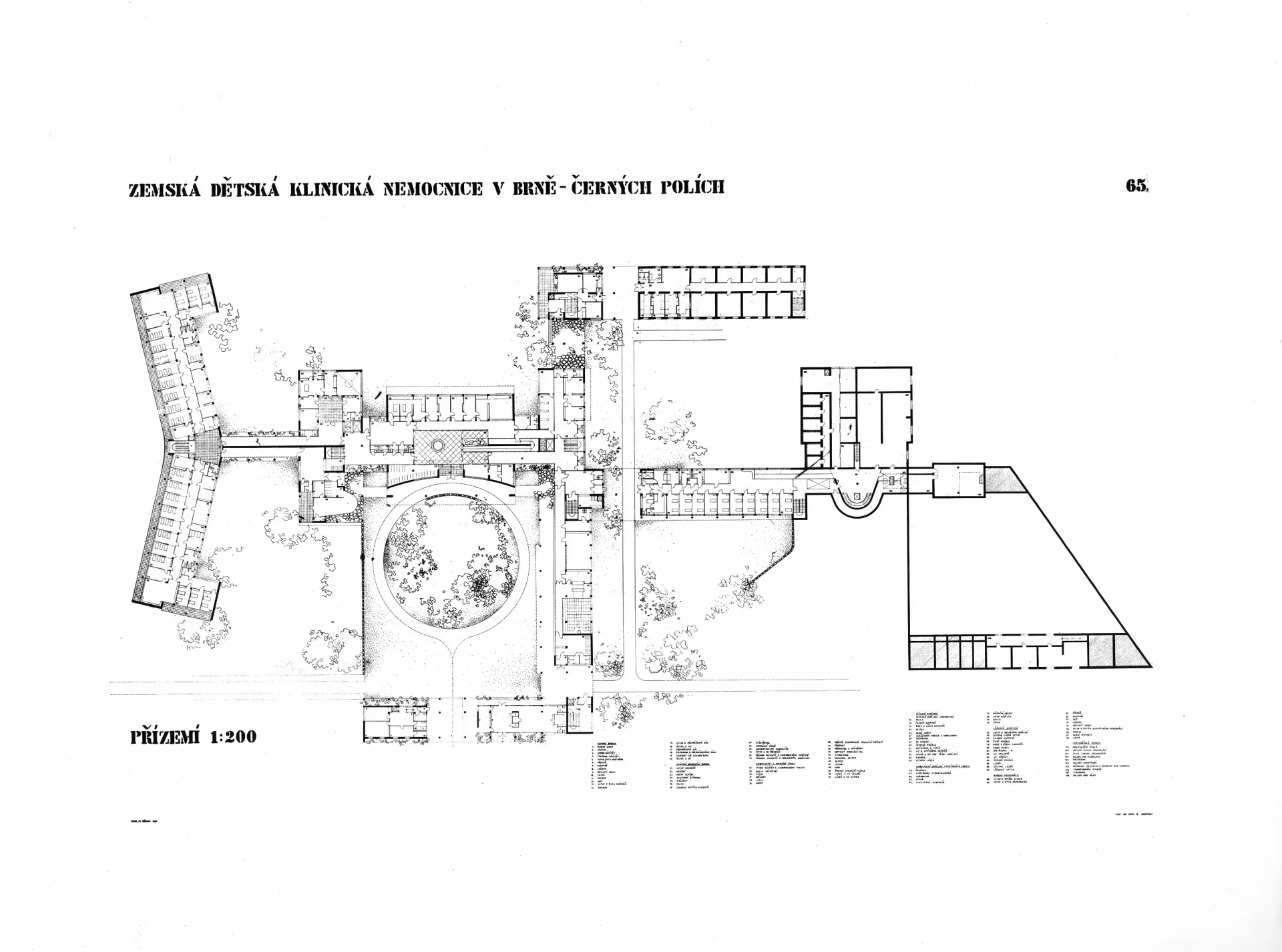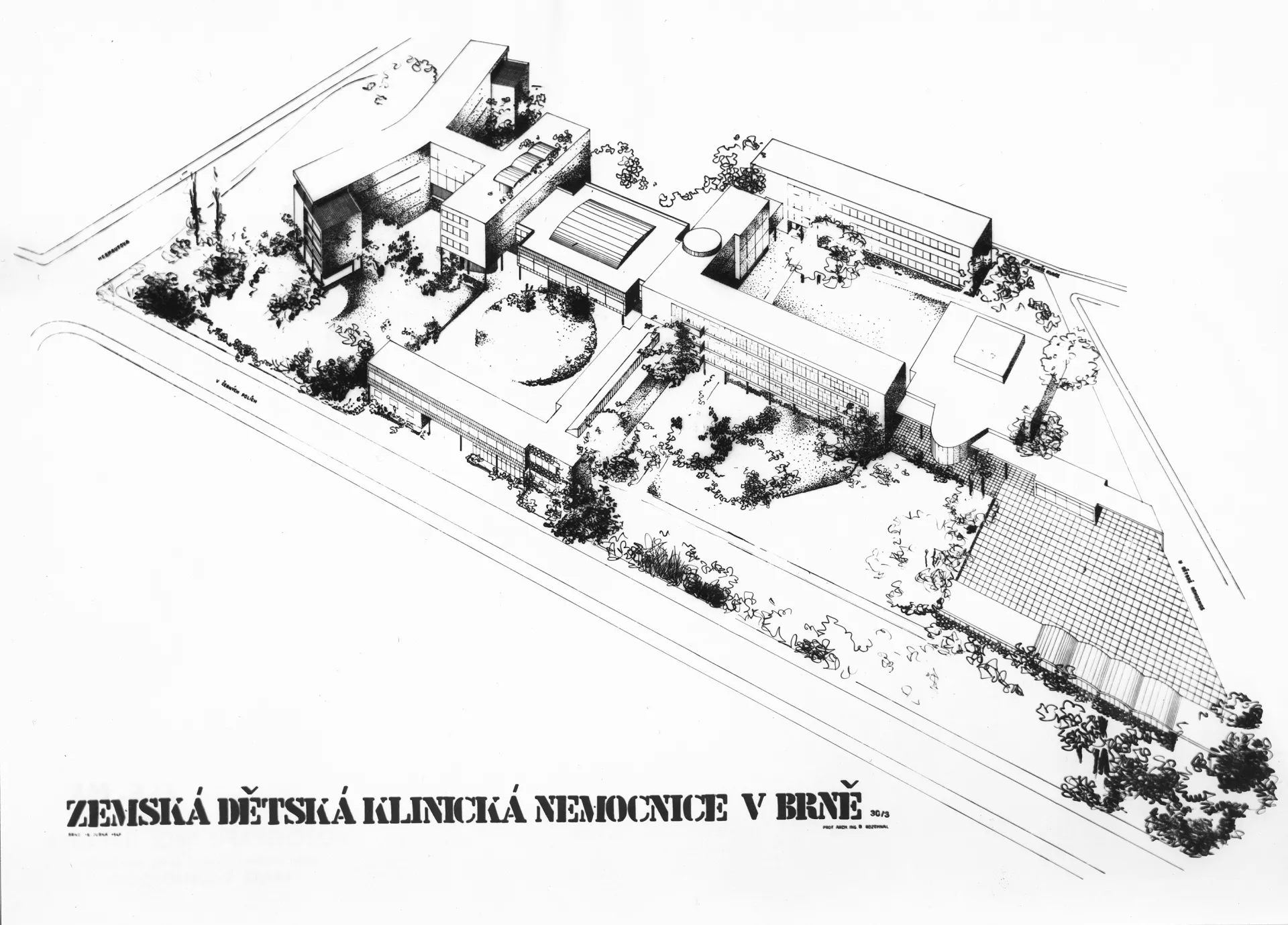 The first specialized hospital for the treatment of children was founded in Vienna in 1787 and inspired similar institutions in other European cities. From 1809, there was a short-lived specialized private clinic in Brno for the paediatric patients of the physician Ernest Karel Rincolini. In 1844, Ferdinand Dworzak appealed to the citizenry of Brno to contribute to the establishing of an association for the common good to create a foundation for a children’s hospital that would primarily treat children from poor families. As a result of his commitment, in 1846, a clinic with twenty-eight beds was established on what is now Kounicova street. Although it was gradually enlarged, its capacity continued to be insufficient, and, in the mid-1890s, a building fund was established for the construction of a new hospital, for which the city donated a large plot of land at the top of Černá Pole hill. Hugo Kranz, Moravia’s head of construction took on responsibility for the architectural design. His design for the children’s hospital was in the form of six specialized pavilions, which were fully electrified and supplied with water from the newly established water pipeline from Březová. The hospital was built in the years 1897–1898, Although the hospital complex served its purpose for sixty years, extensive damage to the buildings at the end of the Second World War and developments in the field of medicine led to the need to build a new hospital. The new concept for a specialised medical clinic for the treatment of children was entrusted to Prof. Otakar Teyschl, director of St. Anne’s University Hospital, Dr. Vladimír Mazal, newly appointed director of the Children’s Hospital, and the architect Bedřich Rozehnal. The architect had specialized in the construction of hospital facilities since the 1920s, and his buildings were to be found throughout Moravia. When designing hospitals, Rozehnal always considered the needs of doctors and consulted with them at length. This form of mutual cooperation led to the creation of top modern medical institutions. With possible future technological developments in mind, Rozehnal also designed buildings in such a way that they could be adapted over time to accommodate new medical equipment. The final concept of the Moravian Children’s Hospital in Brno was approved by the Congress of Paediatricians in 1948, initiating the first phase of construction on the new complex. The old hospital would continue function during this time. Rozehnal departed from the pavilion design that was usual for that time in favour of a more modern block design, which functionally connected the individual specialized departments. The first building to emerge was the economic and administrative wing. In the next phase, up to the year 1953, the central entrance hall with glass ceiling (now Teyschlova Hall), and wings for out-patients, operations and in-patient wards were built, which were interconnected. The dominant feature of the complex is the six-storey block with wards for in-patients with a Y-shaped floor plan and continuous terraces oriented towards south-western city skyline, which shows a marked influence of Le Corbusier. The terraces, with their procession of huge columns, were used for giving patients exposure to the sun and fresh air, which was supposedly beneficial for the mental well-being of the children. In this sense, Rozehnal’s intention was for the hospital and its architecture to motivate the patient to recover. Thus, in the early 1950s, the Children’s Hospital became the final functionalist building in Brno, when the official politically prescribed style was already socialist realism. Its aesthetic design and well-thought-out concept, which Bedřich Rozehnal elaborated in the book Cesta k řešení nemocniční otázky města Brna. Projekty zemské klinické nemocnice a státní oblastní dětské nemocnice v Brně [Solving Brno’s Hospital Problem. Designs for the Moravian Clinical Hospital and the State Regional Children's Hospital in Brno] (Brno 1949) was soon acknowledged by architectural professionals around the world, including Le Corbusier himself. Construction was supposed to follow in subsequent years with facilities for internal medicine and an infectious disease clinic, but Rozehnal’s project was not implemented. It was reworked in the early 1960s by Karel Volavý and Eduard Říha, when Rozehnal was politically persecuted and imprisoned. On the basis of Rozehnal’s overall plan, they designed the building for the 2nd Department of Pathological Anatomy. After the Velvet Revolution, with the further development of medical technology and methods, and thanks to support from Olga and Václav Havel, the Children’s Hospital complex was extended, partly realizing Rozehnal’s idea for ​​a comprehensive medical care centre. The design of the new Pavilion F was drawn up by the Tuffy architectural studio under the direction of Zdeněk Jánský and was built in two phases. In the years 1994–1996, building F was constructed for intensive care medicine, and in the period 1996–2001, building G was built for a paediatric internal medicine, oncology, radiology and other departments. During this period, the almost fifty-year-old buildings Rozehnal designed were also renovated. LV