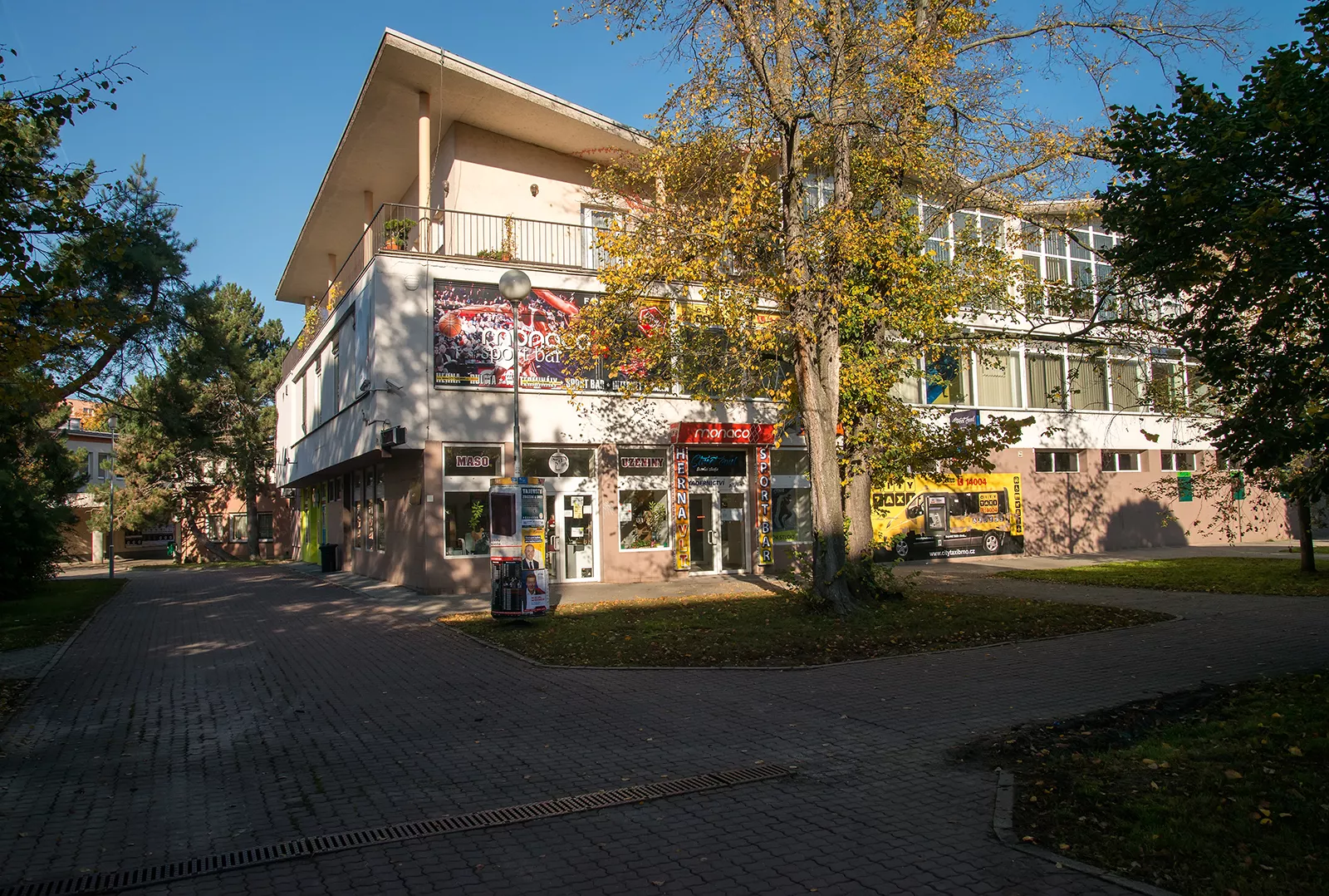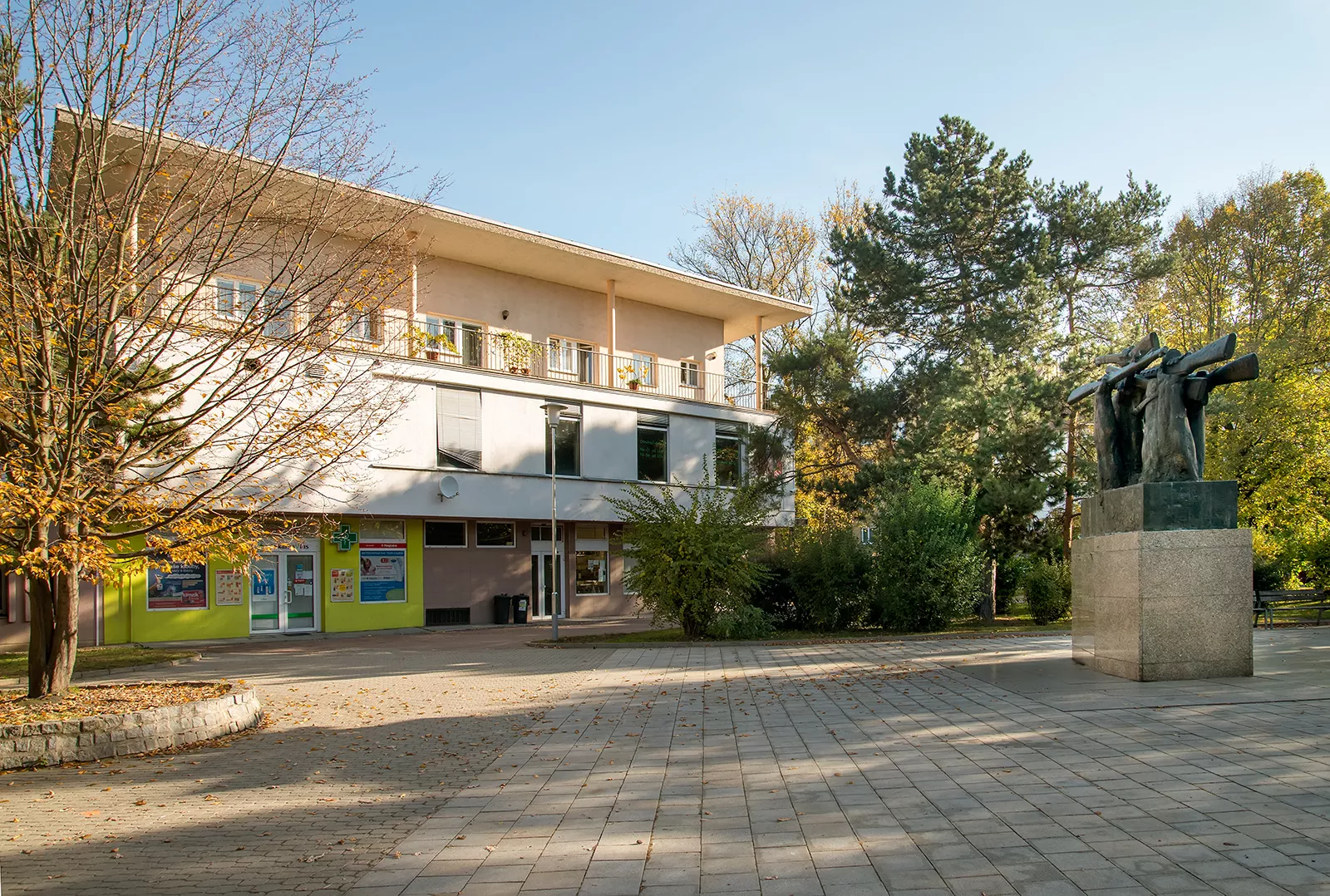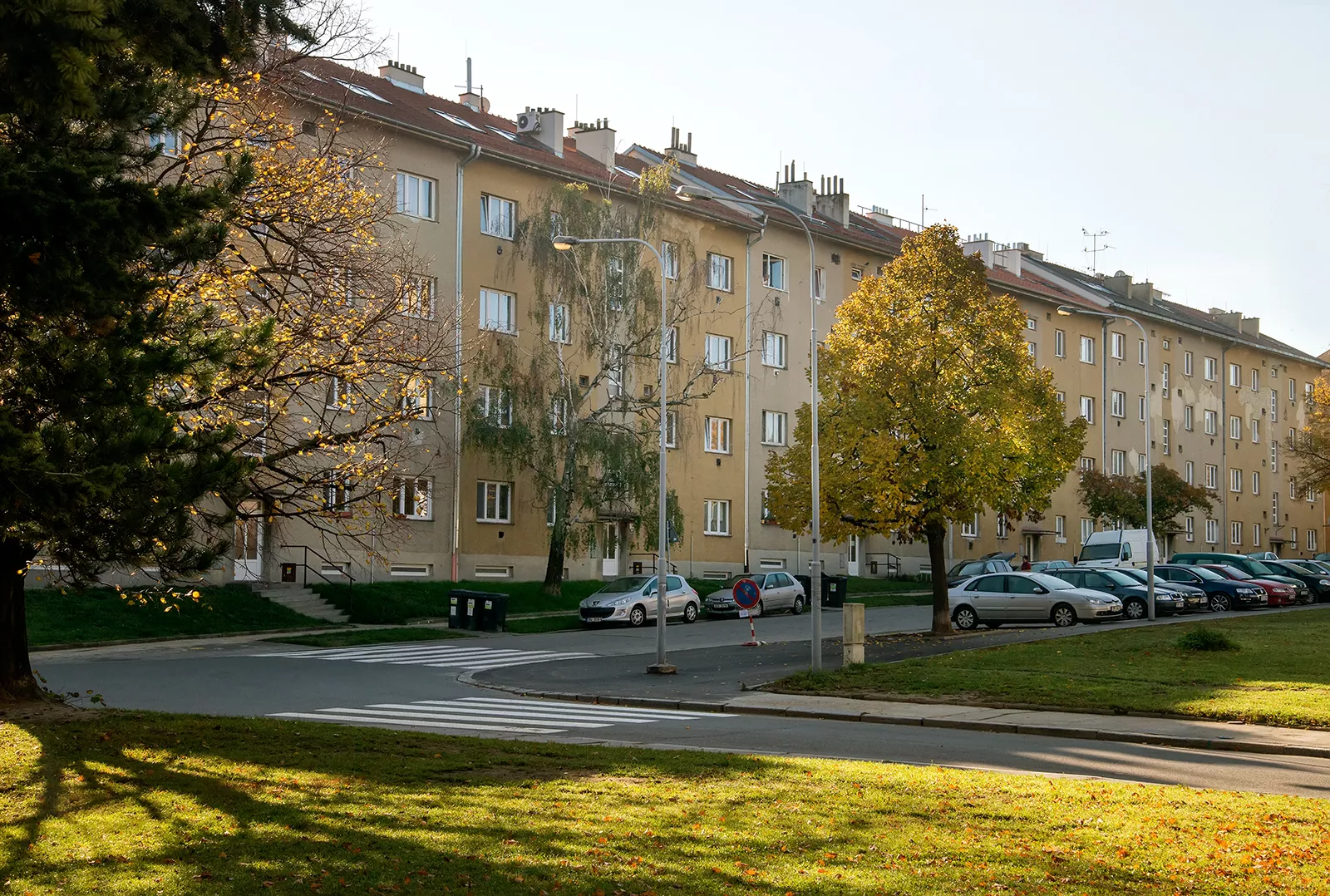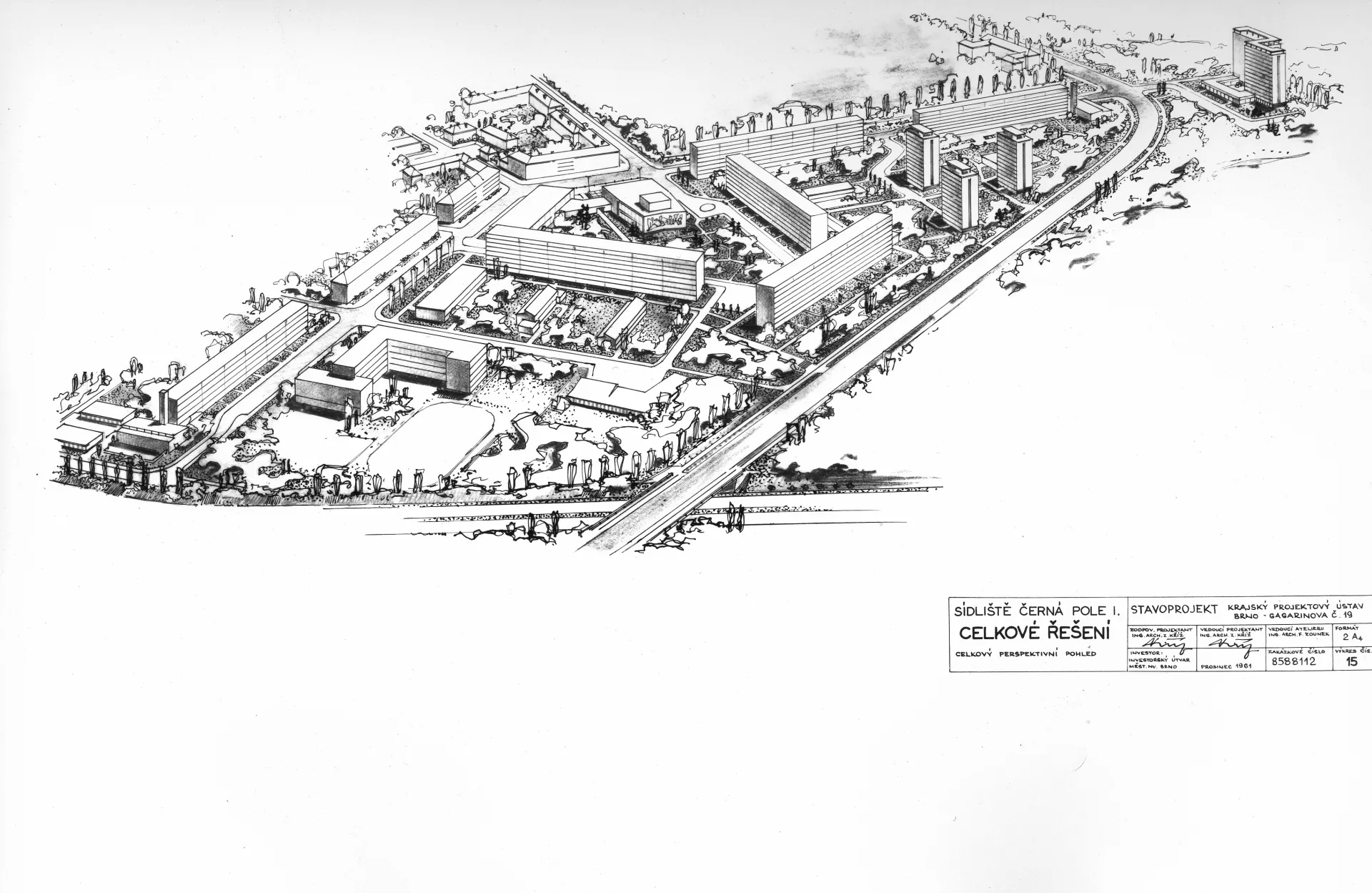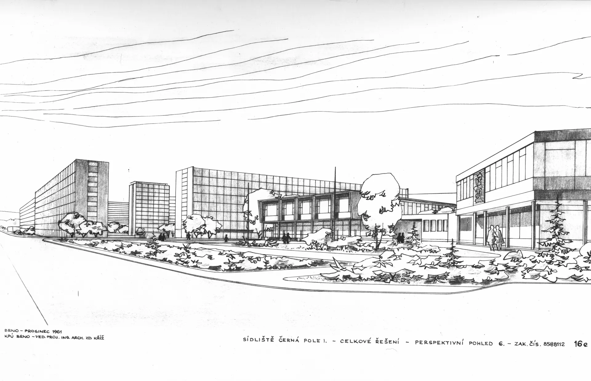 The severe shortage of housing associated with the Second World War had still not been resolved fifteen years after it ended. A breakthrough in housing construction development came at the 11th Congress of the Communist Party of Bohemia and Moravia in 1959, during which it was decided that the progressive method of prefabricated concrete panel construction would be used to build a projected quota of 2,000 to 3,000 apartments annually. There was a new plant for manufacturing prefabricated concrete panels in Horní Heršpice that would help make production in Brno and its surroundings faster and more efficient. Thus began a period of mass construction of prefabricated panel buildings which would indelibly change the appearance of Brno. The compact housing estate in the district of Černá Pole was built on a vacant site between a disused railway line (in the direction of Tišnov) and an area of family houses in Štefánikova čtvrť . In terms of urban planning, the housing estate has a relatively straightforward composition, consisting of three eight-storey prefabricated panel blocks of flats around the square náměstí SNP. In the western part, close to General Píky street, three separate thirteen-storey tower blocks dominate the skyline. In 1964, following the original project, two seven-storey pre-fabricated panel buildings were erected spanning the length of Bieblova street using local technology known as type B60. In 1968, a row of eight nine-storey apartment blocks of the ‘Lesná’ type was built opposite them facing the street. With this, the projected capacity of the housing estate, which was 974 housing units, increased by another 288. In contrast to other housing estates, within three years of moving in, local residents had access to a full range of public amenities, which included a small shopping precinct, a primary school, two nursery schools and a creche, and a medical and dental centre. In 1969, a community centre with a cinema and ceremonial hall was also added to these facilities . In the 1960s, the public spaces of the new housing estates were not only invigorated by newly planted greenery, benches and playgrounds, but also by numerous quality works of art. This was the result of a new building law that required the investor to spend between one and four percent of the overall budget of the project on artistic decorative works. The sculpture Vlna a Pohádka [Wave and Fairy Tale] by Miloš Axman and the allegorical sculpture Hudba[Music] by Jiří Marek in front of the café cinema can still be found on the Černá Pole housing estate. Since 1974, a bronze monument by Ladislav Snopek commemorating the Slovak national uprising has added to the appearance of the square. Originally, there was a concrete fountain situated in the green space between the tower blocks, but it was decommissioned a very shortly after due to technical faults and complaints about the noise from local residents. In 2017, when the park was restored, it was removed and replaced with a modern water feature. Since 2000, the housing estate has undergone a complete revitalization, which included landscaping and restoring public amenities. Rather than enhancing its attractiveness, the cheap materials and multicoloured exteriors of the newly-clad buildings detract from the value of the development. LH