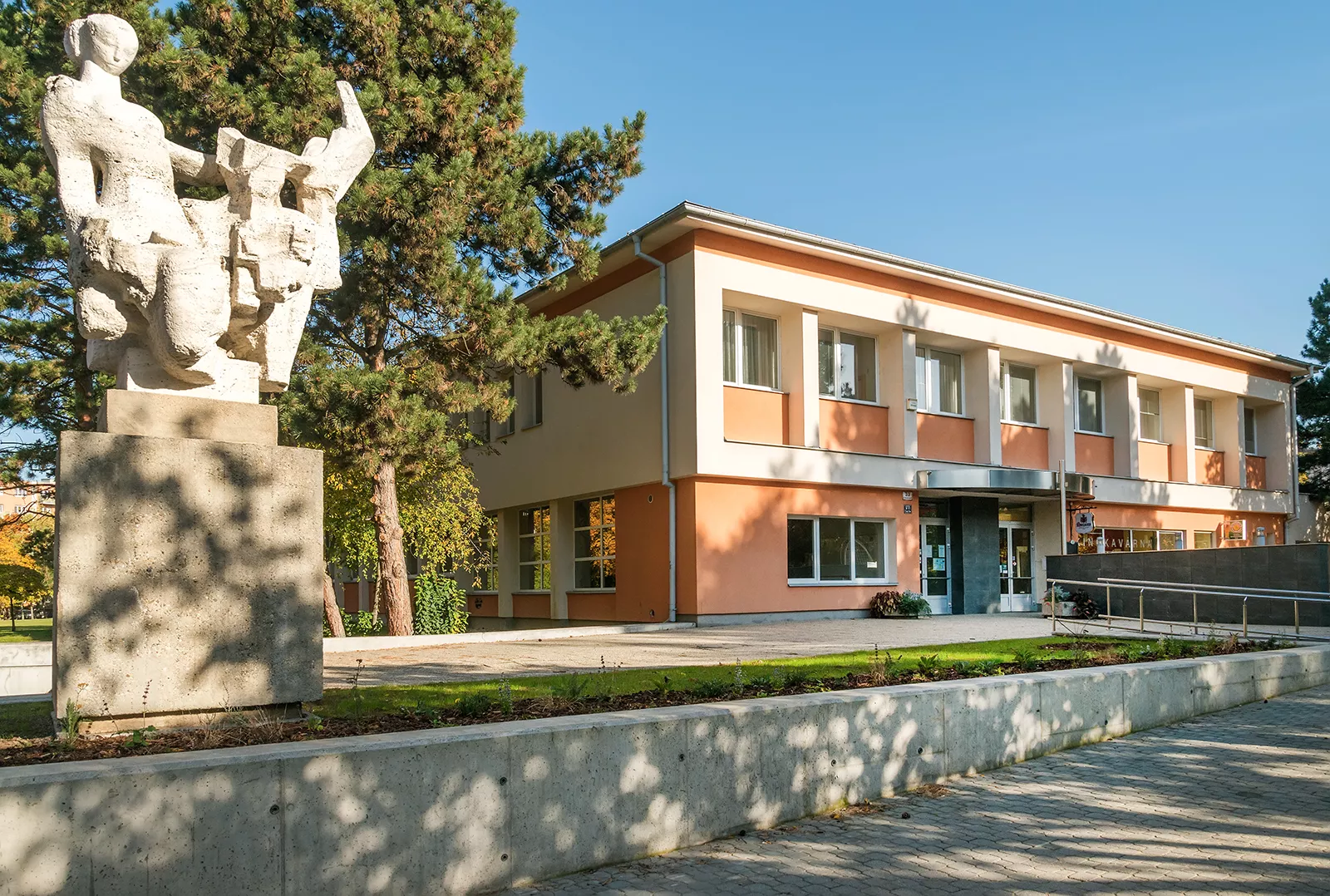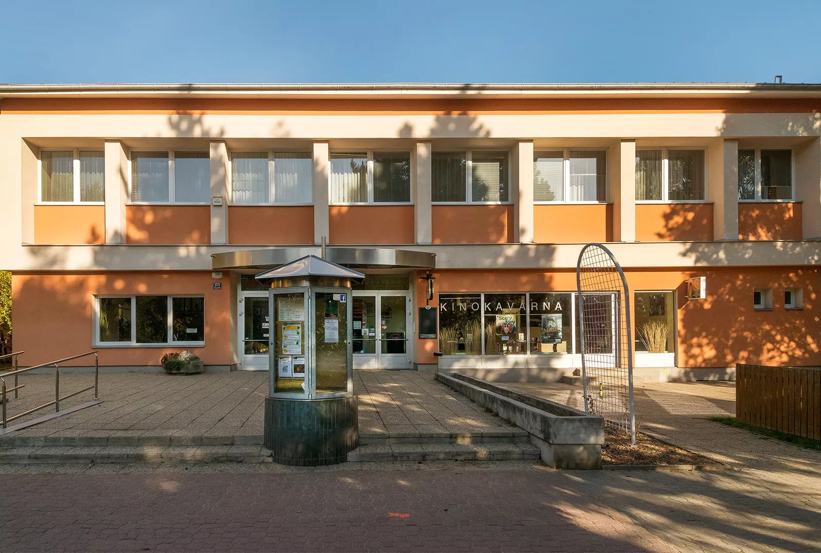 Náměstí SNP (Square of the Slovak National Uprising) with its multi-purpose cinema café and local supermarket formed the natural centre for social activity and public amenities for the housing estate in the northern part of Černá Pole district. This was designed according to the urban plans of Zdeněk Kříž, who was also the author of the psychiatry pavilion on the Bohunice hospital complex that was influenced by ‘the Brussels style’. During 1960s, the estate outgrew the original structure of the urban development. Combining long eight-storey prefabricated panel buildings and thirteen-storey tower blocks, it filled the space in between the pre-war residential district and the new road (Generála Píky) leading to the residential district of Lesná. The two-storey building designed by the architect Vilém Zavřel comprised a community centre and a cinema café. It was completed slightly later than the buildings around it and opened on 13 November 1969 with a gala evening and as part of a national festival of health films. The construction of the cinema cafe is associated with a tragic event from April 1968, when the prefabricated ceilings collapsed during the construction, killing a number of construction workers and apprentices. Situated at the centre of the housing estate on an open trapezoid-shaped park between the prefabricated panel buildings, the cinema café was designed to offer residents of the estate film screenings in the comfort of a café atmosphere. In the architectural expression and structure of the cinema café and its details, Vilém Zavřel not only displayed his functionalist training, but also the experience he had gained working on earlier designs, particularly the market hall building on Zelný trh in collaboration with Evžen Škarda (1947–1950), and the Janáček Theatre building, where he was the chief engineer and collaborated with Jan Víšek and Ivan Ruller on design. The upper floor protrudes slightly, creating a shallow avant-corps all around the perimeter, which also separates the floors visually. A characteristic feature of this simple rectangular building is the prefabricated columns all around its perimeter, which gives the facade a vertical and distinctly periodic dimension. The architect set large windows between the columns and marked out the under-window sections on the entrance facade with a different colour of plaster. The auditorium could seat over a hundred people and was built to different heights according to the type of seating. Apart from the cinema, the community centre also included other amenities such as shops, lounges and ceremonial halls. Zavřel also uses huge protruding concrete ribs on the ceilings of the interiors. The building’s artistic decoration was provided by the statue Hudba [Music] by Jiří Marek. It still stands on a monumental square pedestal to the left of the café entrance. The building was first modified in the late 1970s. Unfortunately, another more recent reconstruction of the cinema cafe led to a coarsening of its appearance. Apart from the garish new colouring, a number of the building’s original details disappeared, including the original design of the entrance. KE