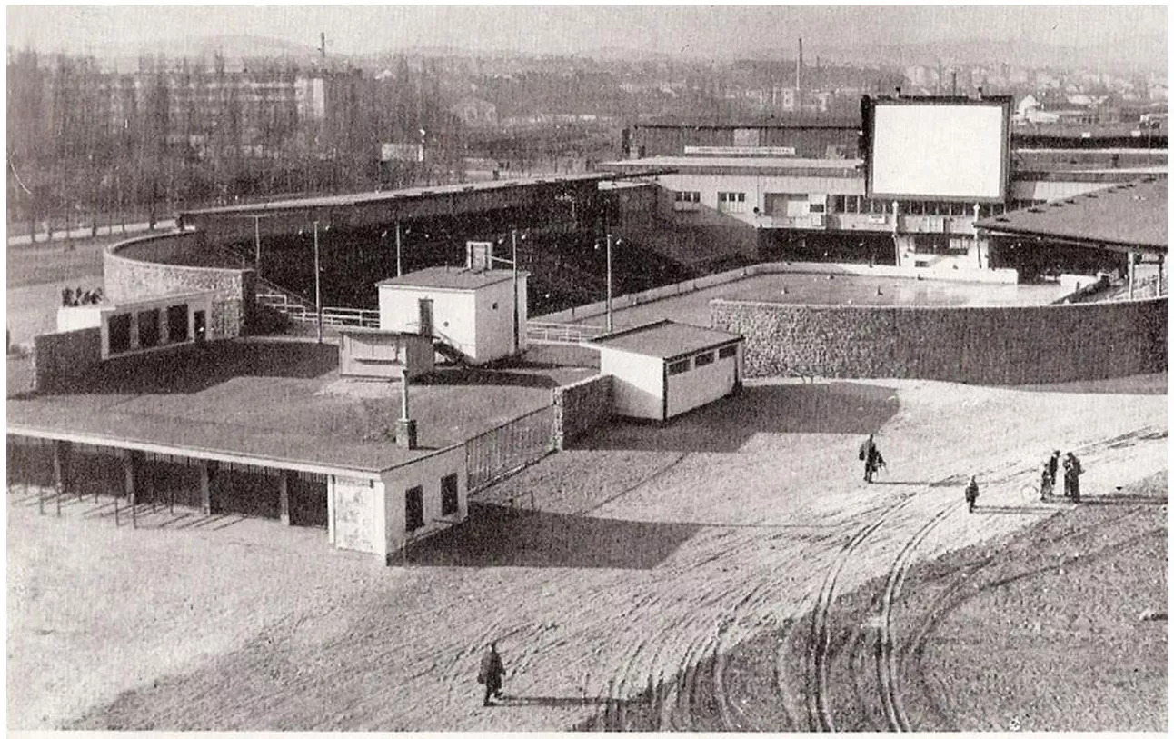 The outdoor ice rink of the Za Lužánkami Winter Stadium was built in the first phase of the ambitious project of the Brno National Stadium cooperative. The design was drawn up by the architect Bohumil Fiala, who waived his fee for the work, and construction work was due to begin in 1946. However, there was some rather opaque criticism of the project from professional and particularly political quarters. Consequently, the cooperative committee commissioned a new project and assigned it to one of the leading critics of the former project, the architect Václav Roštlapil. In January 1947, thanks to labour brigades of students, soldiers and athletes, the winter stadium was ceremoniously opened under the name Beneš National Stadium. At that time, it was the largest artificially cooled ice surface in Czechoslovakia. The main rink measuring 30 x 60 metres was situated next to a smaller training rink, which was primarily used by the general public for recreational skating. The architects composed the two ice surfaces in the shape of a letter T. The spatial concept of this design was based on the separation of the rinks by means of a one-storey ‘bridge’ building with a mostly glazed restaurant, a clubhouse, offices and other facilities. From this position, both ice rinks could be viewed by visitors to the restaurant and social areas, and also by sports commentators. The stands for 12,000 spectators were embedded in the terrain with access through the main gate from the direction of today’s Drobného street. As the winter stadium was one of the first to be built in Czechoslovakia (after Prague, Bratislava and České Budějovice), it was relatively difficult to construct, in terms of the materials available at that time, and it proved necessary to scale down the original programme. The plan for the comprehensive roofing of the stands was abandoned due to the high potential cost. As a complex of more than just regional significance, it provided facilities for a number of teams, including the newly established sports club Red Star Brno. However, in 1959, when Czechoslovakia hosted the Ice Hockey World Championships, the shortcomings of having an uncovered winter stadium became apparent in an international context. It proved difficult to maintain the ice during snowfalls and also in higher temperatures, the ice surface was very often contaminated with ash from nearby industrial plants, and, in bad weather, the spectators in the stands were particularly uncomfortable. Consequently, in 1959, the cooperative approved a design for a stadium roof by Bohumil Fiala, which used a patented ‘garland’ truss, developed by Vítkovice Steelworks. However, in the end, due to cost considerations, the Vítkovice patent was re-evaluated and in the summer of 1961 a new design was submitted by the Department of Steel Structures and Bridges of Brno University of Technology, led by the engineer Ferdinand Lederer. The design was conceived as a purely rational, economically viable and quick solution. The double-layer braced plate with a slope on one side utilized the columns of the original roofs of the side stands, whose foundations were adequate for the needs of the new roof. On the shorter sides, the weight of the roof was distributed across the lattice truss to the foundations of the existing restaurant building and the newly built southern stand. In order to avoid building new foundations and thus interfering with the unstable substratum, the stands were only reconstructed and extended in one place, which, however, gave spectators the worst view of the rink. This modification only increased the capacity of the stadium by 300 seats. However, this simple roof structure, in which the steel pipes were connected by hollow ball nodes, was an aesthetically very attractive and, at the same time, economical design. It also had the advantage that it could be assembled quickly. The project was approved in August 1961 and construction work began in 1962. On 6 September 1964, a league match got the first season under the roof underway. The eventual appearance of the winter stadium was thus, on the one hand, a curious amalgam of the designs of three prominent architect/engineers, with visible layers of the individual construction phases of the building. At the same time, however, it can be perceived as a remnant of Bohumil Fiala’s architectural concept from 1960 with many of the original features of the layout and massing division of the building, such as the monumental bevelled inverse corners of the stadium and the projecting cube-like ground floor buildings with social facilities. The ‘Brussels-style’ curves of his side stands and main entrance with ticket offices pleasantly contrasted with the new roof structure overlapping on all sides with the linear geometry of its dense tubular network. Nevertheless, in the end, it was Lederer’s roof that became the outstanding feature of Brno’s winter stadium. After the 1989 revolution, the fate of the whole Za Lužánkami Sports Complex befell the winter stadium, with fatal consequences. After it was privatized under the policy of the new political regime, it deteriorated significantly, and its condition failed to improve even after it was bought back from the new owner by the city. Despite the various plans and specific projects for reconstruction and new construction, the building continued to deteriorate. The fatal intervention was the decision to demolish it in 2008. Thus vanished the winter stadium, the ‘foundation stone’ of the Za Lužánkami Sports Complex. ŠS