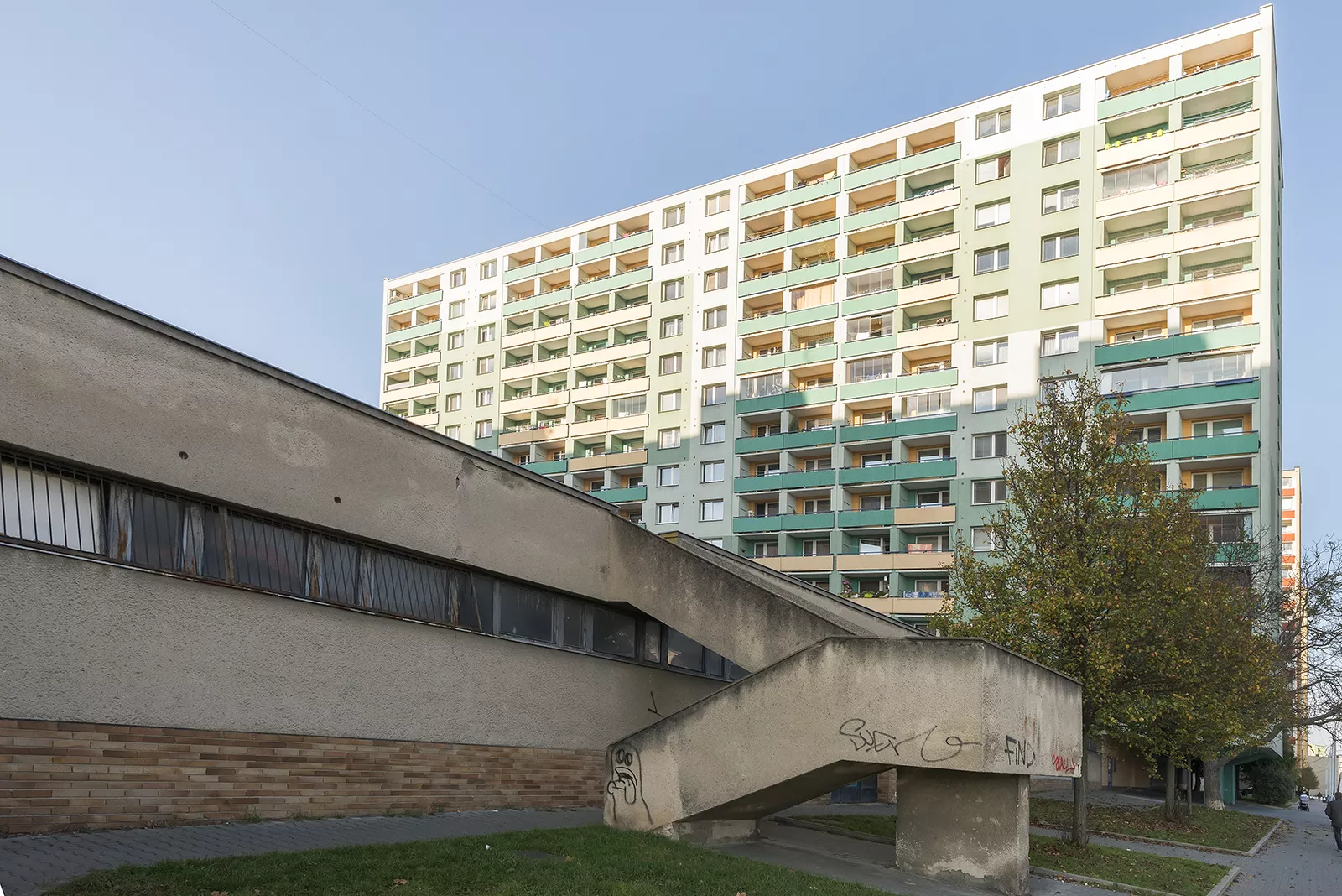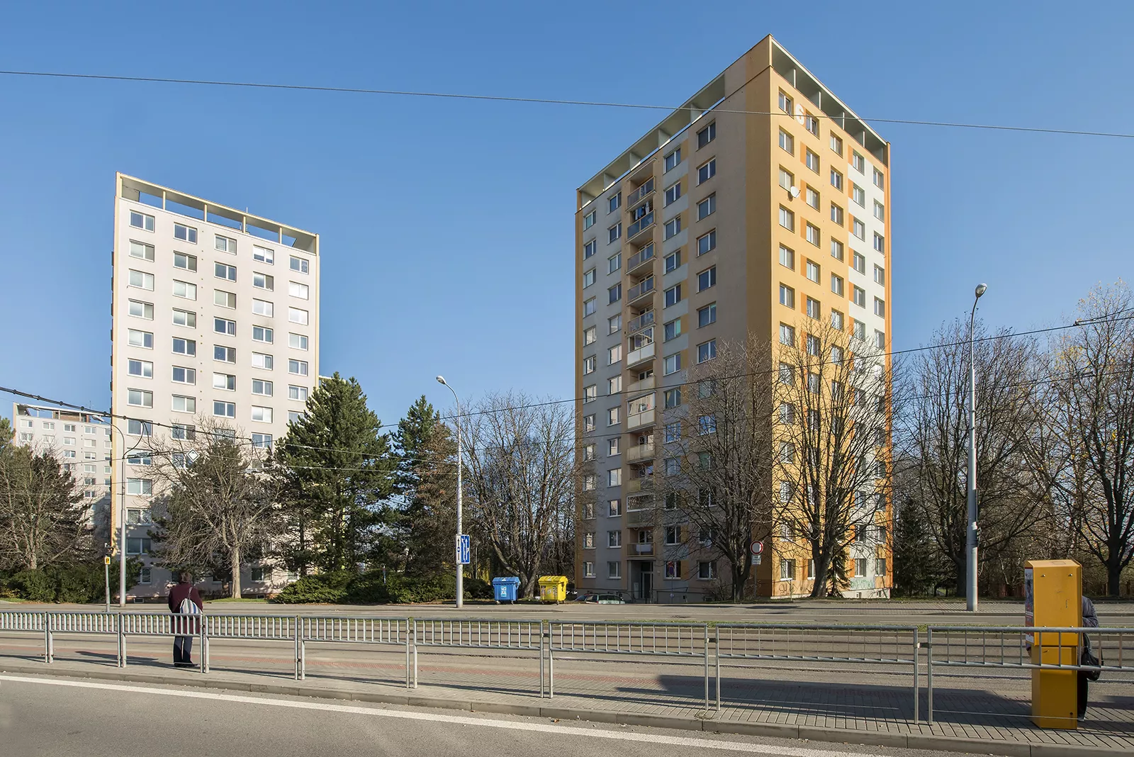 At the beginning of the 1960s, the Brno architects Ladislav Volák and Karel Zounek worked together on a residential project in the Lesná district that had been acclaimed for its high urban, architectural and artistic quality. They joined forces again just a few years later on a project to construct prefabricated apartment buildings in the district of Královo Pole, which were mostly intended for the employees of the local engineering plants. After extensive clearance of the original sites, which were largely rural in character, a vacant land area was created between the streets Purkyňova and Božetěchova, bordered in the north by a four-lane highway. This space was gradually filled with a range of diverse residential buildings constructed by means of the huge prefabricated panel technology used across the country known as T06B. The Královo Pole housing estate is not a compact whole, as it is divided by the street Palackého into two separate, differently structured zones. There is a group of nine thirteen-storey tower blocks with six or seven apartments per floor in the vicinity of Herčíkova street that dominate the western side of the residential district. From there, five-storey and seven-storey prefabricated panel buildings in L- or U- shaped configurations with passageways through the corners meander down in the direction of Palackého street, following the contours of earlier developments of family houses. In the north, these buildings are surrounded by civic amenities in the form of a primary school of the pavilion type, a kindergarten and a health centre. There is a civic precinct known as Zagreb directly on Palackého Street that was intended to provide a smooth transition between the western residential zone and the group of buildings on the other side of the tram line. Located near the main tram stop that serves the estate, it is a two-storey, ramp-connected shopping precinct with a restaurant, a covered arcade and an artistically designed ornamental brick wall. The western side of Božetěchova street was conceived by the architects Volák and Zounek as an offshoot of four thirteen-storey high prefabricated panel buildings, each consisting of 48 residential units, characterized by massive supporting pillars facing the street, and single-storey buildings for technical functions which form an interconnected base. This housing estate, which contains more than two thousand housing units, suffers from a range of ills common to cities. After such a large-scale clearance, the overly massive blocks, positioned too close together, intrude into the structure of the district. At the same time, there are too few recreational areas and the free movement of pedestrians in the residential areas and other places is impeded by busy roads directly entering the space. Most of the residential buildings and some civic amenities have recently been renovated, which has included the insulation of facades and the replacement of balconies. The Zagreb precinct is covered with advertising, but is still more or less in its original state. Nevertheless, the public space between buildings would benefit from some careful contemporary modifications in order to enhance the recreational functions for its residents. KE