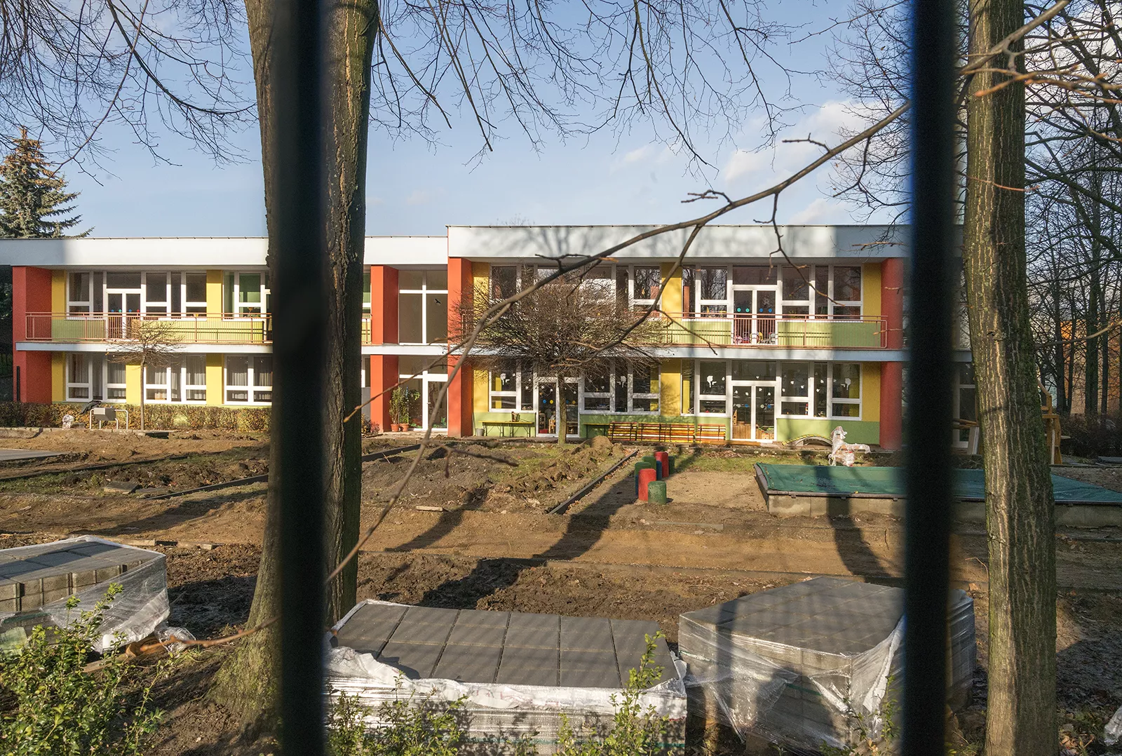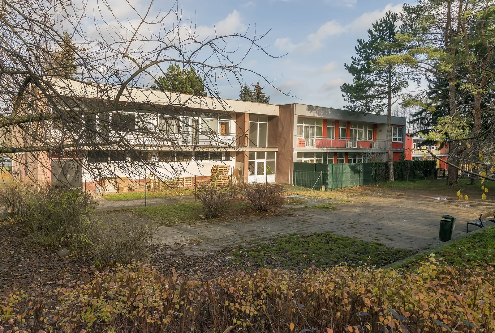 Under the communist regime, civic amenities played an important role in the creation of municipal plans for all settlements in the districts. They were designed to meet the everyday needs of people living there, including shopping, recreation, sport, eating out, social and health services, but also to raise living standards, by, for example, increasing the capacity of facilities for children of all ages. According to a survey from that time, in the early 1970s, the construction of nursery schools in the South Moravia region slightly lagged behind the national average. For that reason, the architectural planning organization Stavoprojekt Brno was tasked with designing a number of local nursery schools for individual districts of the city. One of these was the nursery school and creche in the Královo Pole district for 90 and 55 children, respectively, which was built in 1976. It was designed by the architect Miroslav Dufek, who conceived it as a two-storey building with minimal basement adjusted to the incline of the terrain. The main entrances to the ground and upper floors from the north are separated, as is the entrance to the kitchen and its basement storage space with lift. The interior of the first floor of the building consists of two identical parts with identical functions and two staircases. The corridors connecting the staircases are connected to large halls with changing rooms on both floors. There are also sanitary facilities, staff offices, and spaces for play, dining, and sleeping for thirty children in each part. A loggia with balustrade runs the whole length of the first floor so that the rooms can be ventilated easily and safely. The ground floor is also divided into two parts, one that copies the layout of the first floor and another accommodating the kitchen, the lift, a two-bedroom flat for the caretaker, the Head’s office, washrooms and storage spaces. There is also an entrance for moving toys and other equipment into and out of the garden. The building is surrounded by lush greenery, which helps create a pleasant environment and block out noise from the street in a busy part of the city. The design for the spacious garden included a sandpit and paths. The project was designed as a fully assembled skeleton with hidden main beams according to a system from that period known as KPO Brno. The dimensions of the basic and additional modules of the building were 600 × 720 cm and 600 × 480 cm. The shell of the building is masonry from CDK-type bricks and steel was chosen as the main building material for the staircase. According to the architect Miroslav Dufek, the main principle of the architectural design was the use of solid gable walls contrasting with the glazed frontage. The plaster of the gable walls was originally from coarse rough-cast plaster and the parapets by the entrance and on long sides of the facade had fine-grained surfaces. Unfortunately, this alternation in the aesthetic effect of the building was recently covered with brightly coloured insulation. The ceramic tiling on the south side of the building has also disappeared and the original windows have been replaced with plastic versions. LK