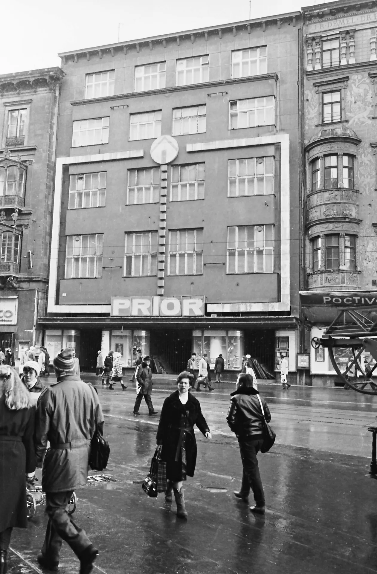 On the south-western side of the square náměstí Svobody, between the Renaissance House of the Lords of Lipá and the Neo-Renaissance Klein’s Palace, both important historical buildings, there was once a Baroque burgher house that had been used down the years for residential, retail and banking purposes. During the Second World War, it was badly damaged in the bombing of Brno and had to be demolished. The vacant site in a prestigious location in the very heart of the city centre was soon occupied by a five-storey office building, modified in 1950 for the purposes of a department store for the state enterprise Rozkvět, which later became part of the nationwide network of PRIOR stores. In accordance with efforts to renew the quality of services that had been decimated by the war, Rozkvět was meant to expand the opportunities for shopping and refreshment in the centre of Brno, as was the case with the nearby market hall on Zelný trh and the Milk Bar, a few houses down on the square Unlike the former burgher house, which was a floor lower than its neighbouring buildings, the Rozkvět building, which opened in 1951, was the same height, thereby balancing the frontage of the square. On the other hand, its smooth facade, punctuated only by four large windows on each of its floors, stood in contrast to the decorative facades of Klein’s Palace and the House of the Lords of Lipá. The main entrance was located in the middle of a light glazed ground-floor below a neon sign advertising the name of the department store. The most striking decorative element of the otherwise modest building was a huge luminous letter R extending the height of one floor, together with a continuous neon tube that circled the entire facade. Particularly in the evening, Rozkvět took on an illuminated metropolitan appearance that was reminiscent of the city’s interwar tradition, when it boasted many excellent functionalist department stores in the centre. Rozkvět was completely reconstructed in the years 2004–2005 according to a project by a team of architects consisting of Ivo Balusek, David Písařík, Radka Weberová, Radomír Staněk and Lukáš Bílek. The new facade is now glazed and is completely covered on the upper floors by reflective blinds. The original shape of the business space on the ground floor has disappeared along with the elegant neon signs. The building is still a shopping centre, but also offers offices and residential units, while serving as a passageway that connects the main square with the adjoining street of Panská. KE