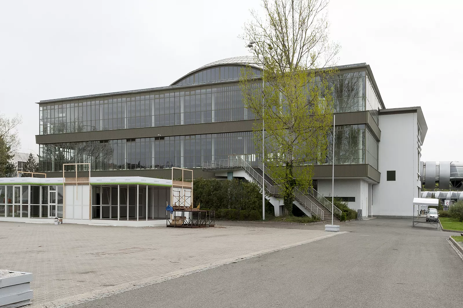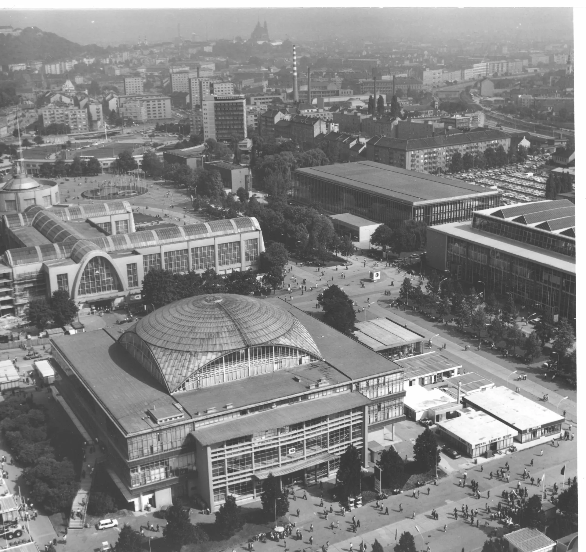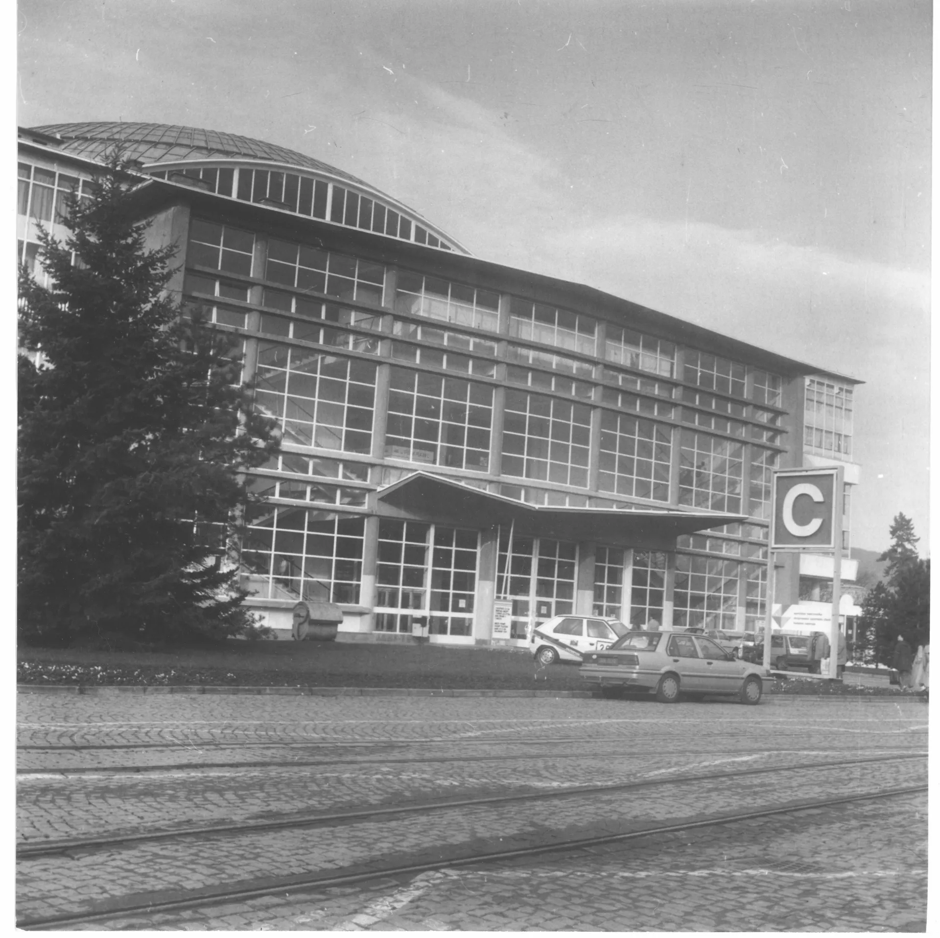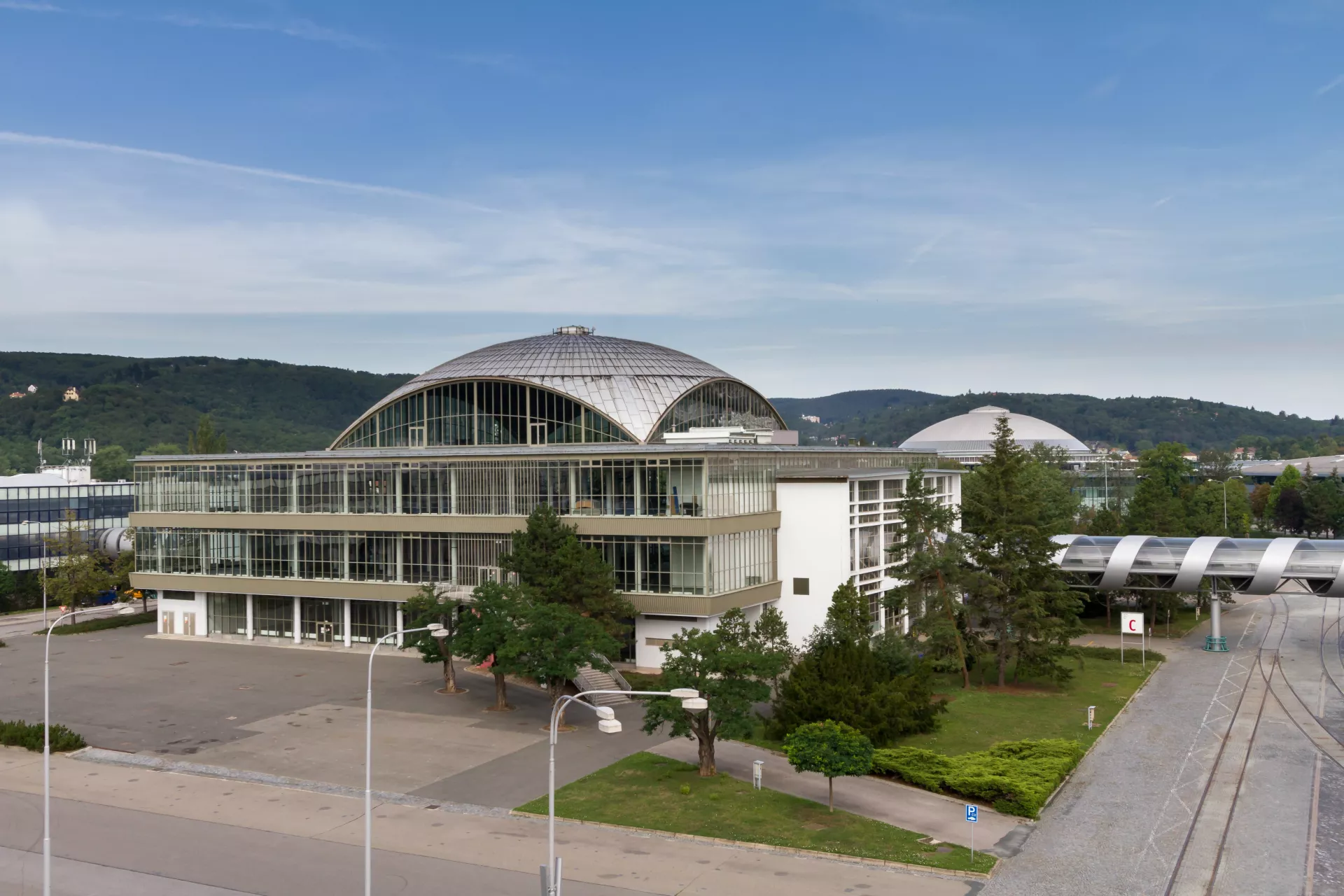 Pavilion C is another one whose origin is associated with the first international engineering fair in the late 1950s. It was planned for consumer goods and is built on a square plan covering 11,000 m2. It is one of the most interesting constructions in the Brno exhibition centre. The perimeter of the building is almost completely made of glass. The pavilion has a central elevated atrium with galleries and staircases, which is roofed by a cupola with lunettes in the shape of baroque vaulting. The austere exterior is embellished with expressive lines of bent roofs above the entrances and forward-placed staircases. The building is supported by a reinforced-concrete frame with round columns, the staircases are supported by tubular girders. The ceilings of the individual floors are covered with cassette sections. The cupola is identical with those of pavilions Z and Y, a spherical dome designed by Ferdinand Lederer. The pavilion was reconstructed after 1998 when the perimeter cladding was replaced, hot-air heating was installed and the internal staircases were replaced with escalators. The cupola was repaired. Further changes concerned the layout; the ground floor was expanded. The pavilion still serves exhibition purposes and is connected with pavilions A and E by roofed passages. PH