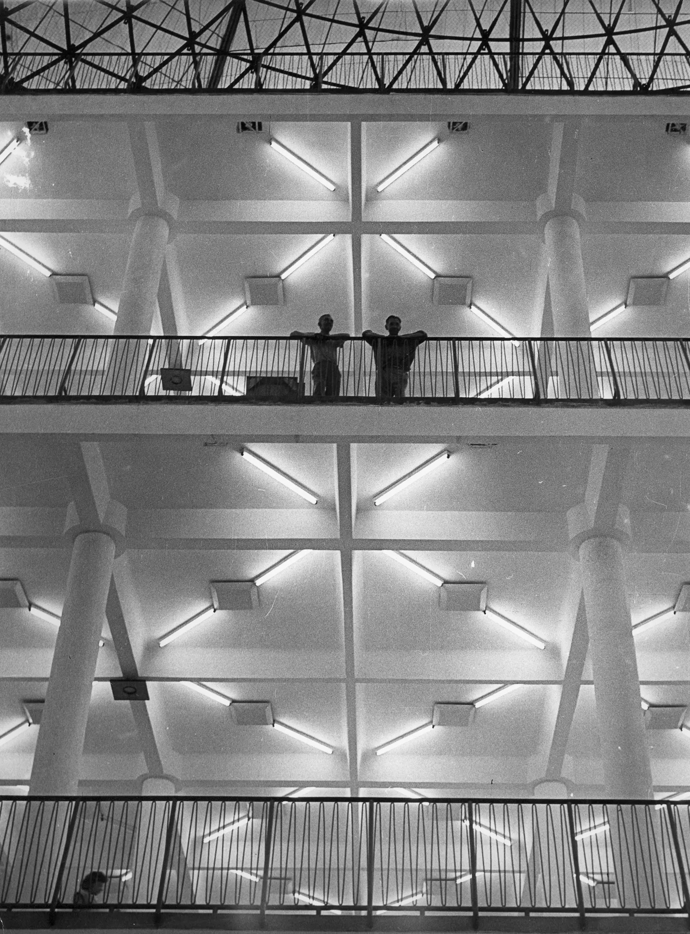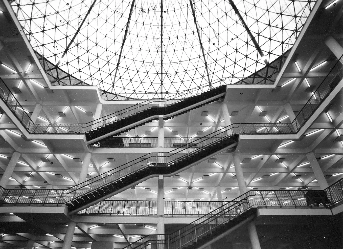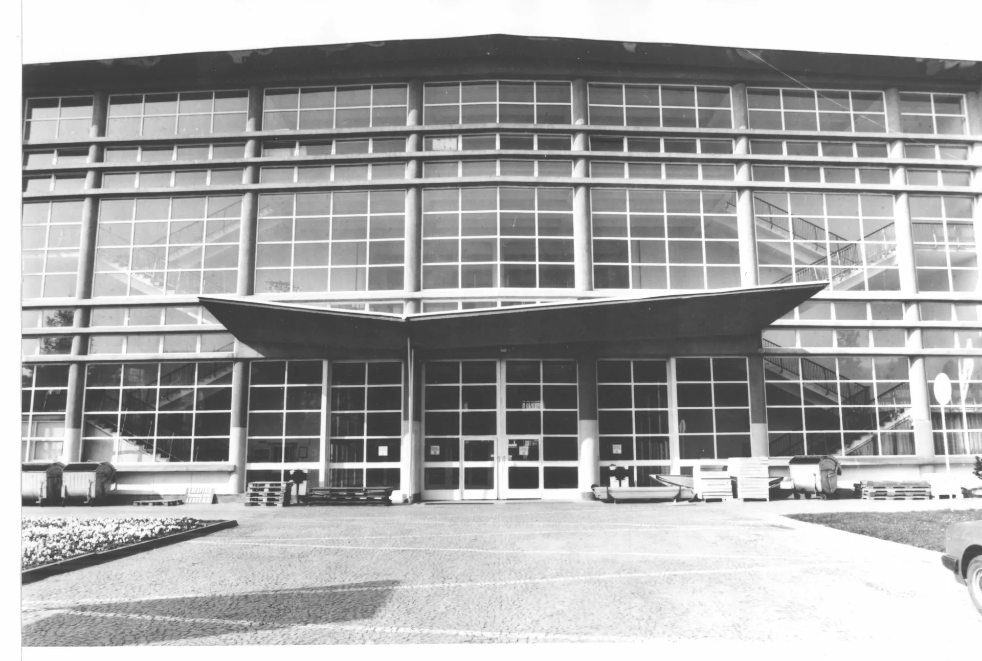Pavilion C is another one whose origin is associated with the first international engineering fair in the late 1950s. It was planned for consumer goods and is built on a square plan covering 11,000 m2. It is one of the most interesting constructions in the Brno exhibition centre. The perimeter of the building is almost completely made of glass. The pavilion has a central elevated atrium with galleries and staircases, which is roofed by a cupola with lunettes in the shape of baroque vaulting. The austere exterior is embellished with expressive lines of bent roofs above the entrances and forward-placed staircases. The building is supported by a reinforced-concrete frame with round columns, the staircases are supported by tubular girders. The ceilings of the individual floors are covered with cassette sections. The cupola is identical with those of pavilions Z and Y, a spherical dome designed by Ferdinand Lederer. The pavilion was reconstructed after 1998 when the perimeter cladding was replaced, hot-air heating was installed and the internal staircases were replaced with escalators. The cupola was repaired. Further changes concerned the layout; the ground floor was expanded. The pavilion still serves exhibition purposes and is connected with pavilions A and E by roofed passages. PH