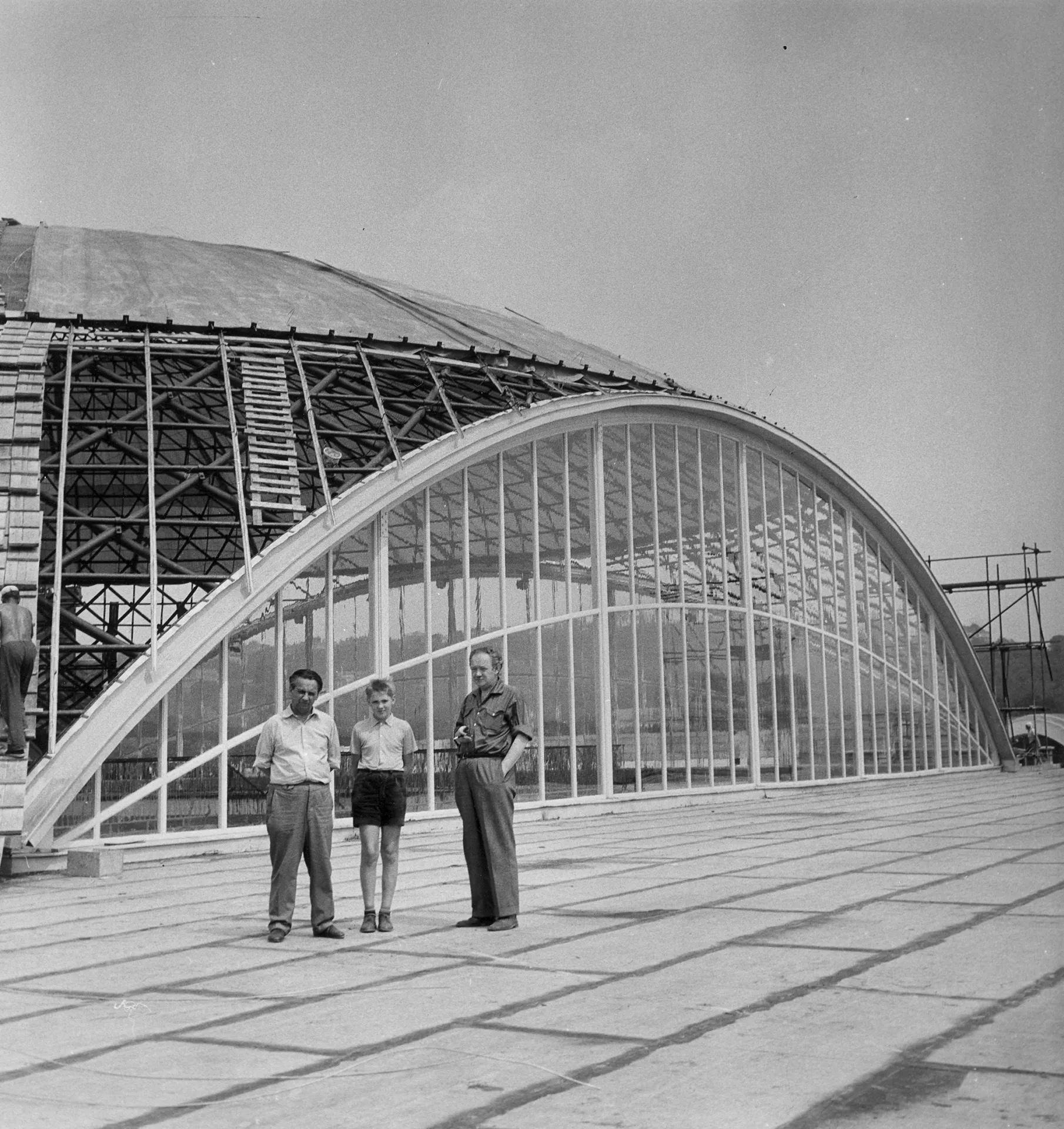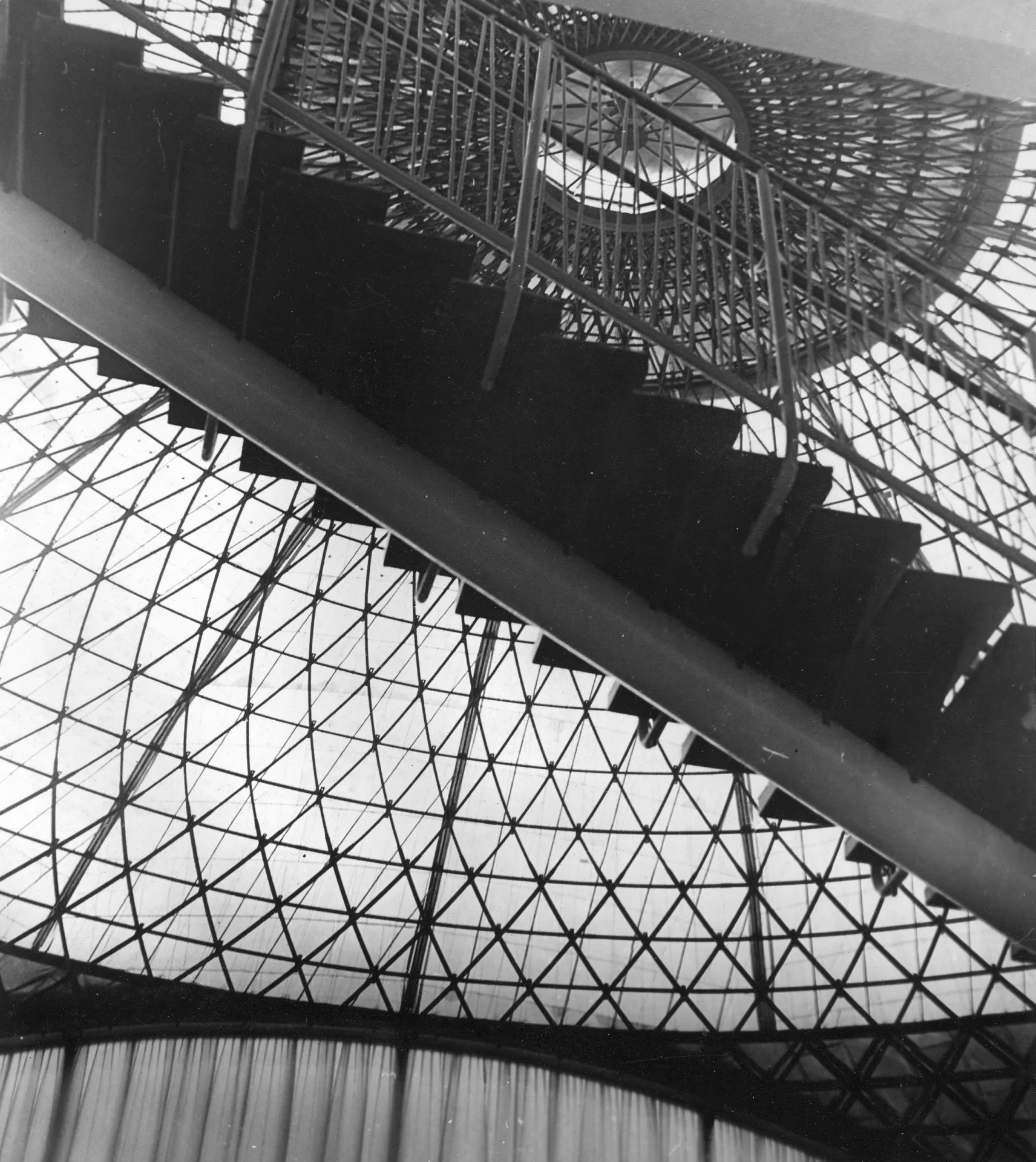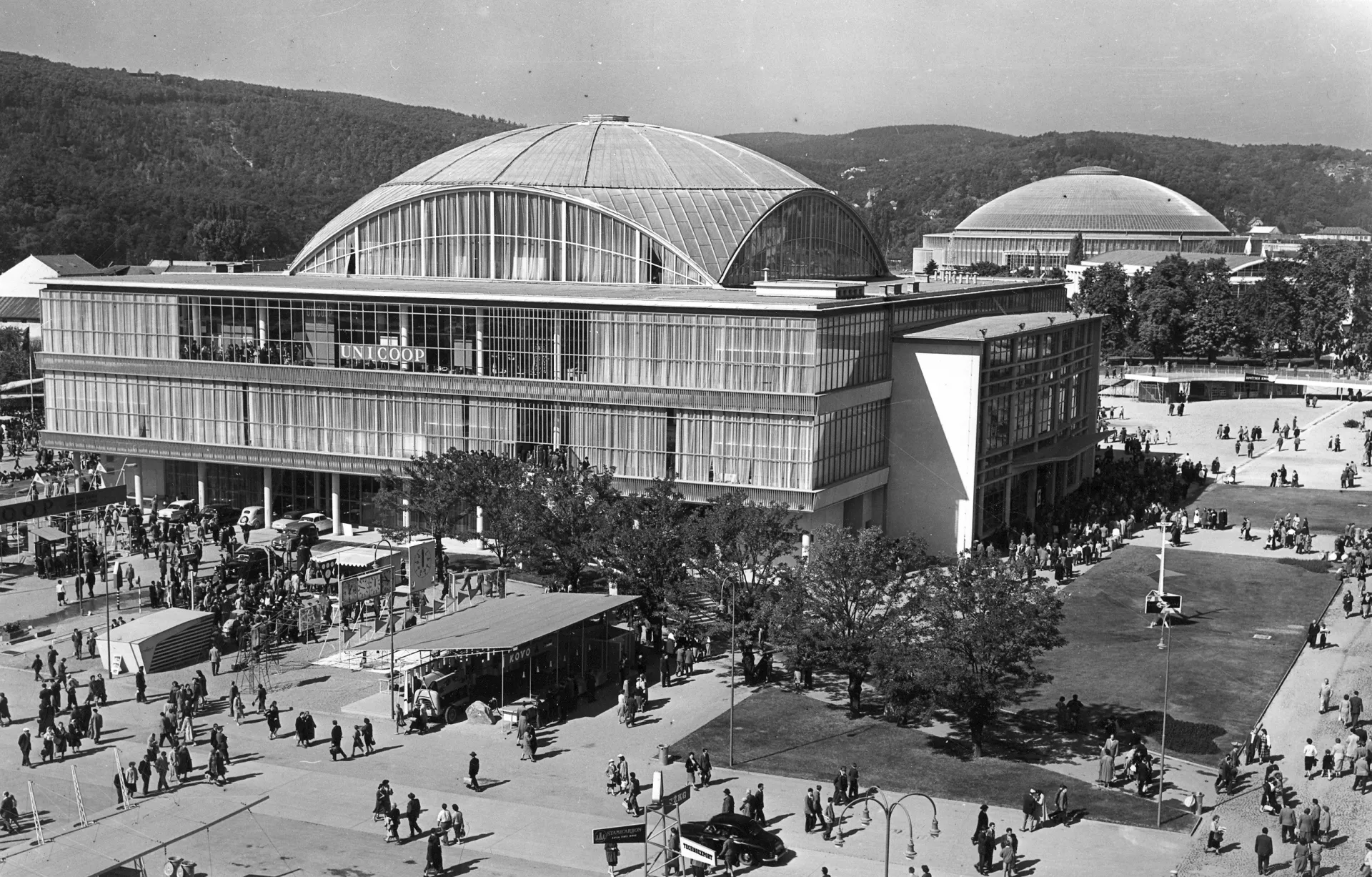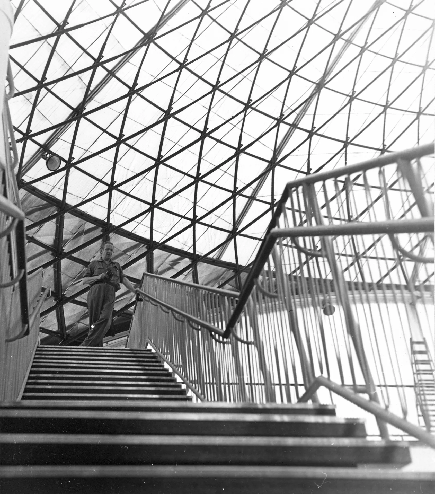 Pavilion C is another one whose origin is associated with the first international engineering fair in the late 1950s. It was planned for consumer goods and is built on a square plan covering 11,000 m2. It is one of the most interesting constructions in the Brno exhibition centre. The perimeter of the building is almost completely made of glass. The pavilion has a central elevated atrium with galleries and staircases, which is roofed by a cupola with lunettes in the shape of baroque vaulting. The austere exterior is embellished with expressive lines of bent roofs above the entrances and forward-placed staircases. The building is supported by a reinforced-concrete frame with round columns, the staircases are supported by tubular girders. The ceilings of the individual floors are covered with cassette sections. The cupola is identical with those of pavilions Z and Y, a spherical dome designed by Ferdinand Lederer. The pavilion was reconstructed after 1998 when the perimeter cladding was replaced, hot-air heating was installed and the internal staircases were replaced with escalators. The cupola was repaired. Further changes concerned the layout; the ground floor was expanded. The pavilion still serves exhibition purposes and is connected with pavilions A and E by roofed passages. PH