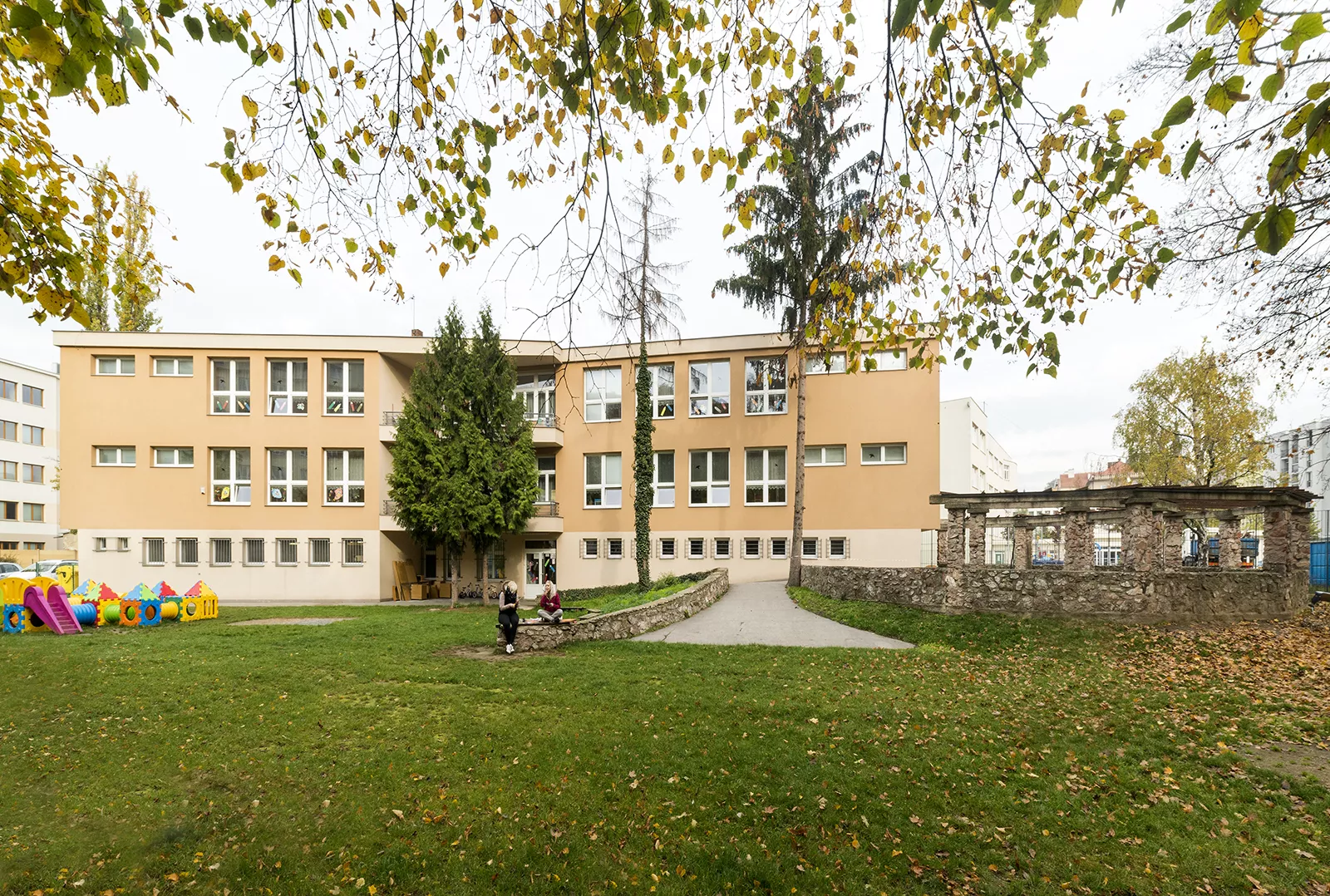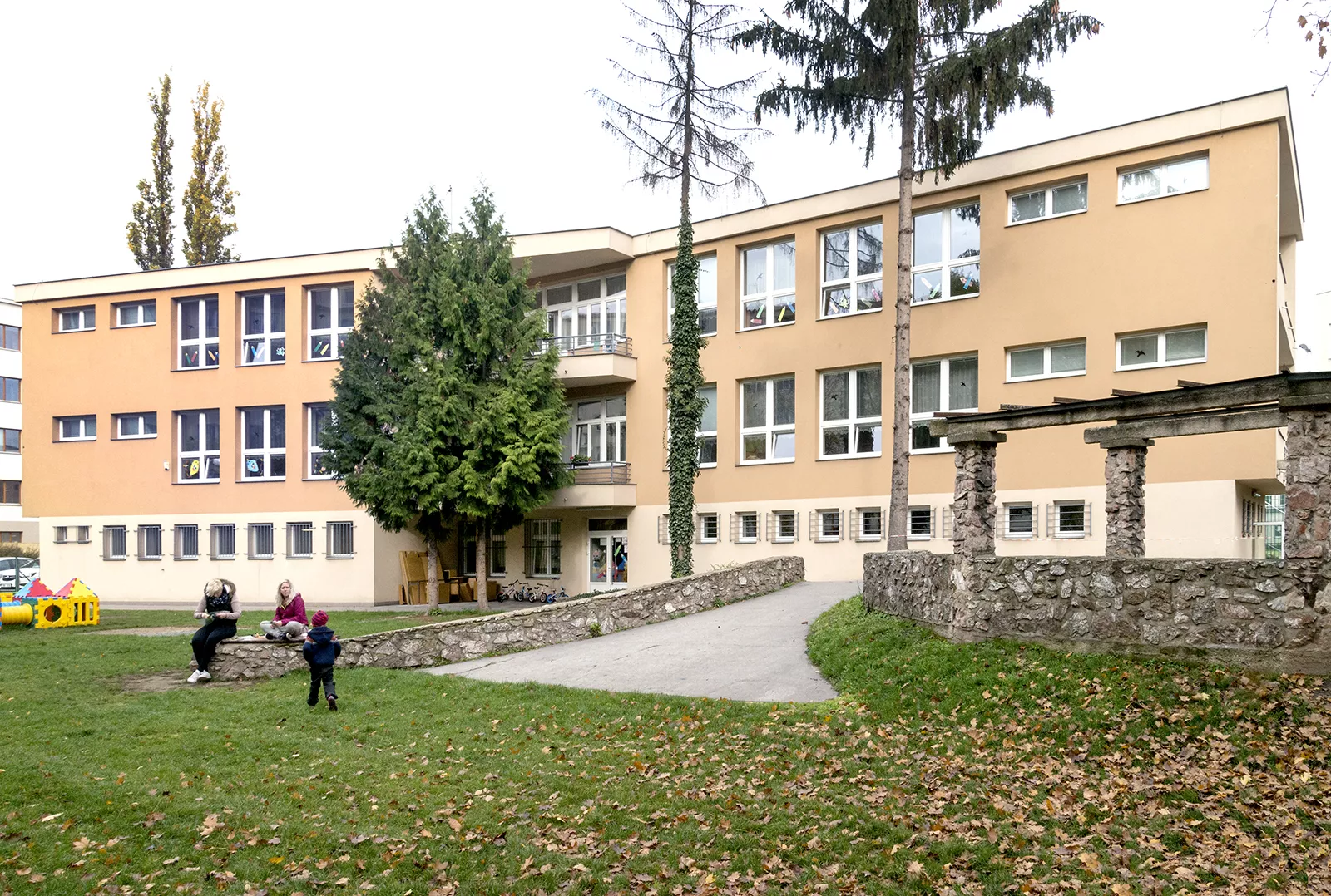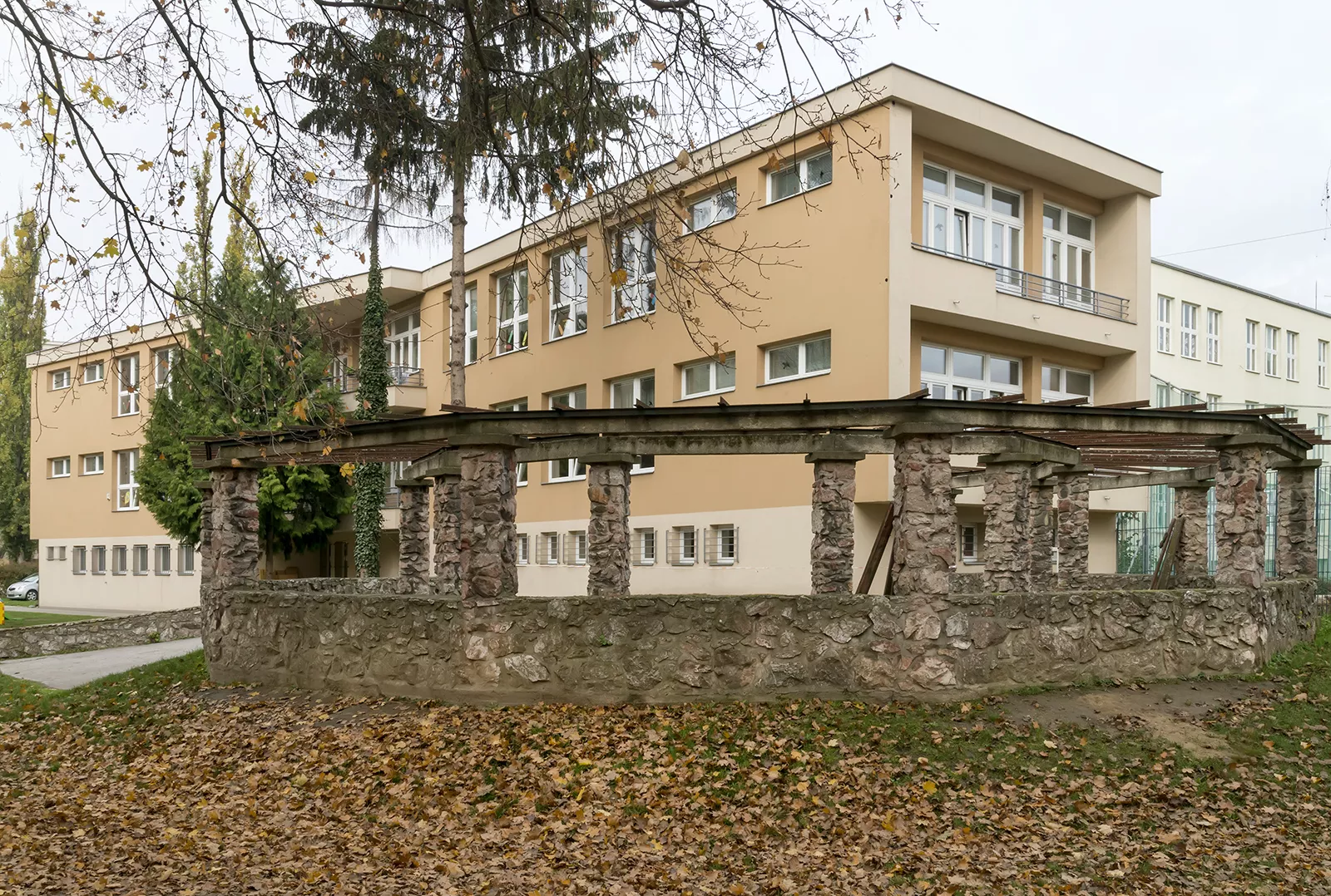 In the post-war period, Brno experienced a boom in the construction of school facilities, and this was closely associated with the city’s functionalist tradition and the theoretical ideas on which it was based. The building of new nursery and primary schools was largely driven by the construction of new housing estate complexes. Although there was a certain form of standardisation with regard to these buildings, many quality examples can be found among the designs of the 1960s. One of them is the Líza Čajkinová nursery school, which was designed by the architect Miroslav Dufek, who was a student of Bohuslav Fuchs and Bedřich Rozehnal. The two-storey building of the nursery school on Nádvorní street, designed to resemble a free-standing villa in a garden, was intended for 120 children and was divided into 4 four separate sections. The school was named in honour of the reknowned Soviet partisan and heroine Líza Čajkinová (Liza Chaikina). The entrance area includes a hall with changing rooms and administrative offices and overlooks the neighbouring Bohuslav Fuchs primary school building. In the central area, on both floors, there are common play areas which extend out onto covered terraces. These lie at the intersection of the two wings of the building, which meet and form an obtuse angle. The loggias on the side facades of the building illuminate the interior spaces of the children’s sleeping rooms in each section and create a pleasant mediating element between the interior and the exterior. The nursery school was able to offer pupils above-average facilities, which included a sauna and a puppet-theatre playroom. During outdoor activities, pupils were able to make use of the spacious garden and a paddling pool. Although the exterior of the building was recently clad with thermal insulation and its wooden windows exchanged for plastic replacements, the building still retains its original distinctive expression. LH