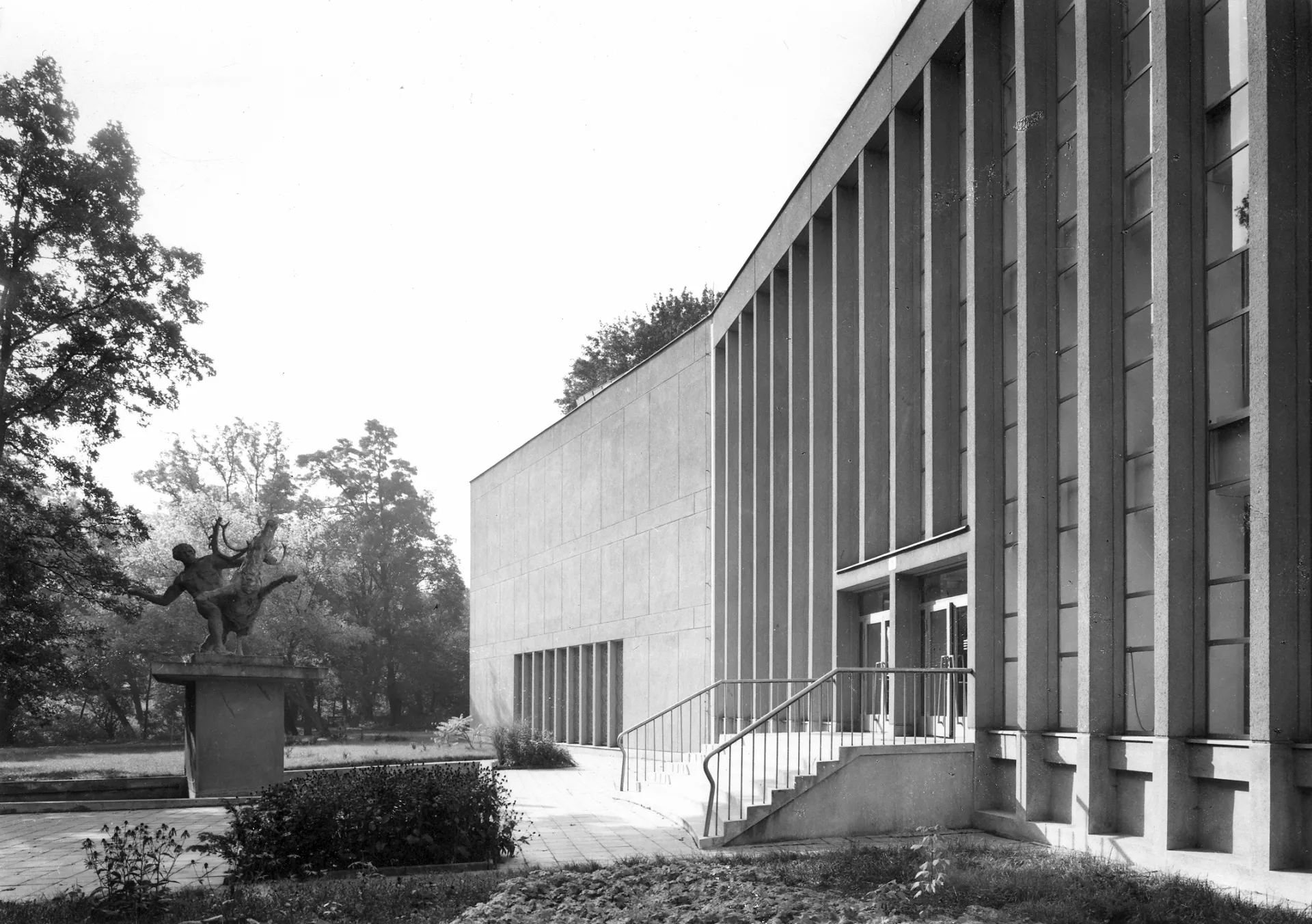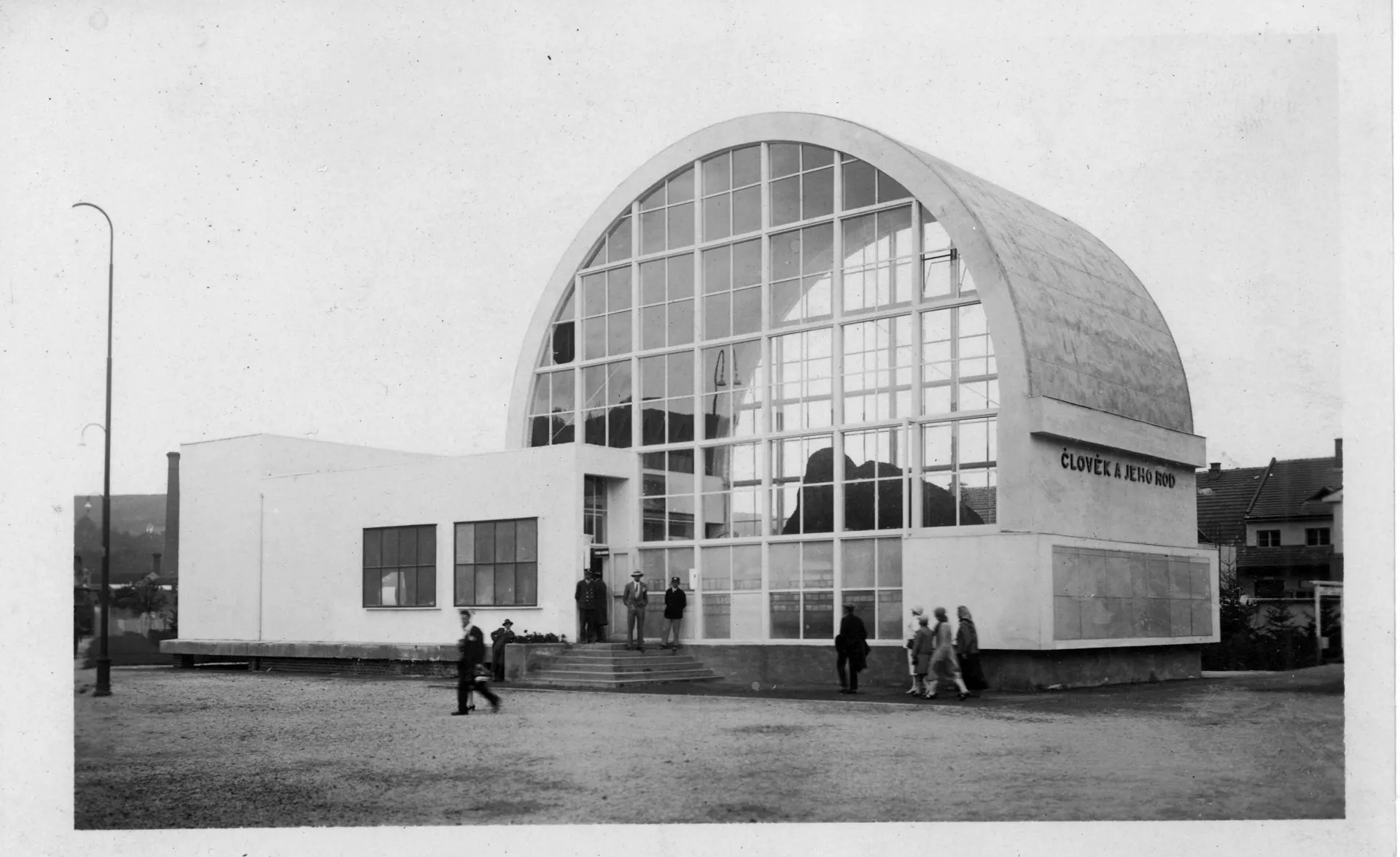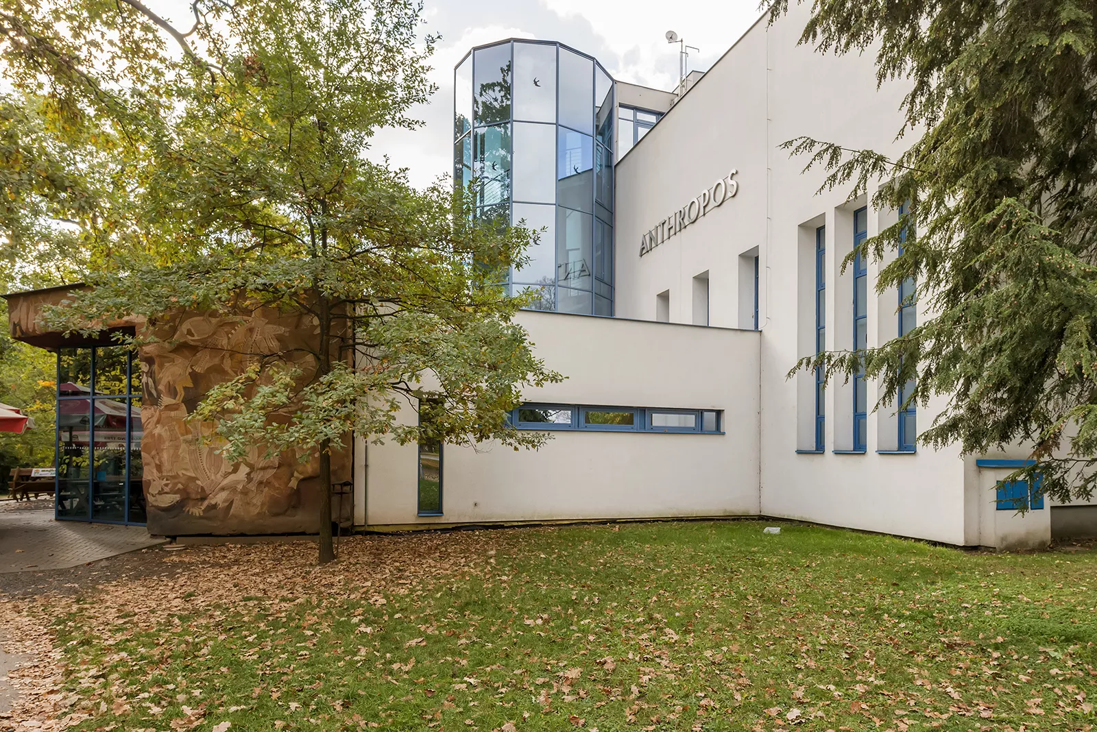 The main impetus behind the construction of the new Anthropos museum building was the prominent Czech anthropologist and museologist Jan Jelínek. At that time, he was director of the Moravian Museum and wanted to continue the First Republic research and collection of Karel Absolon and his Man and his Ancestry Pavilion, which was destroyed during the Second World War. The earlier pavilion opened in 1928 as part the Exhibition of Contemporary Culture at Brno Exhibition Centre and there it continued as the first Palaeolithic museum in Czechoslovakia up until 1945. Karel Absolon had managed to acquire an extraordinarily wide ranging and precious collection of artefacts and anthropological replicas, most probably the largest of its kind in Central Europe. The neo-functionalist Anthropos Pavilion in Pisárky Park was built between 1956 and 1958 to a design by the Brno architect Evžen Šteflíček (a pupil of Jiří Kroha, who along with Absolon designed the original pavilion at the exhibition centre). The pavilion was constructed as part of ‘Initiative Z’ and it was not fully completed until 1962. However, the first exhibition entitled The Rock Painting Art of Primitive Society opened to the public in 1961. It was followed by a series of exhibitions presenting the earliest history of settlement in Moravia and Europe. The basic structure of the pavilion was a reinforced concrete skeleton, consisting of thirty-eight pillars and sixty-eight iron columns within the building. The floor plan was sharp-angled with a round double-flight staircase in the middle. The original, almost fully glazed front and rear facades were divided by a regular vertical pattern of subtle pillars. The individual floors intertwined with the galleries, which made it possible to place the main exhibit, a life-size mammoth that was the work of Jan Jelínek and Brno sculptor Zdeněk Macháček, in the central glazed hall of the building. The mammoth was based on an older version from 1928, which was presented by Karel Absolon at the original pavilion in Brno Exhibition Centre and was destroyed by the Red Army at the end of the Second World War. In addition to exhibition spaces, the new Anthropos Pavilion had other museum facilities, such as storerooms, a depository, an archive and offices. Initially, Anthropos had limited year-round functionality because of its technical shortcomings, such as problems associated with heating the glazed building, and therefore had to undergo a series of repairs in the 1990s. In the years 2003–2006, it underwent a complete reconstruction based on a design elaborated by the architect Dagmar Kubeláčková. Her design, inspired by postmodernism, significantly changed the original character of the building, especially the front facade and the rear glazed facade. As a result of the reconstruction, the sculpture Lovec sobů [Reindeer Hunter] by Antonín Širůček from 1961, which had originally stood at the entrance to the pavilion, was moved further into Pisárky Park. This modernization led to the creation of new exhibition spaces with appropriate climatic conditions for the exhibits, a lecture hall in a 3rd floor extension, and a café and amenities for visitors. This modern institution with its collection and exhibition is part of the Moravian Museum and focuses not only on presenting archaeological finds from the Paleolithic period, but also on interdisciplinary projects in the field of cultural anthropology and ethnology.