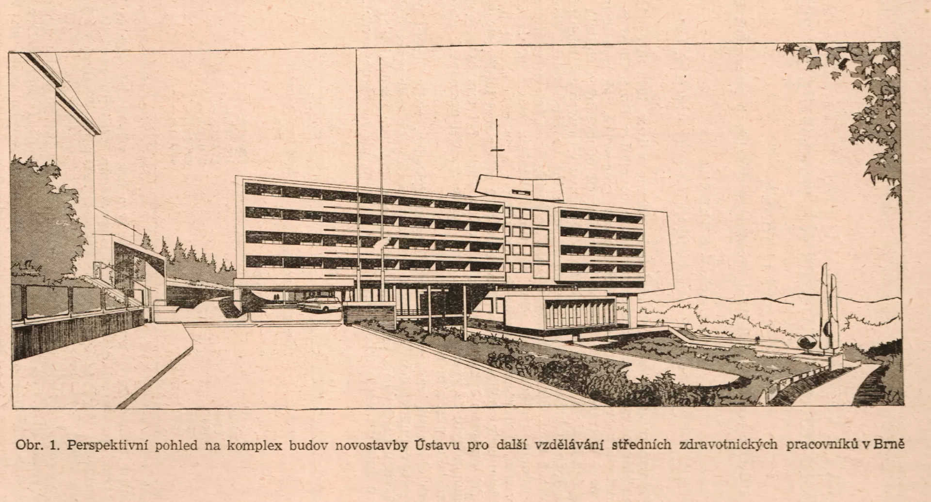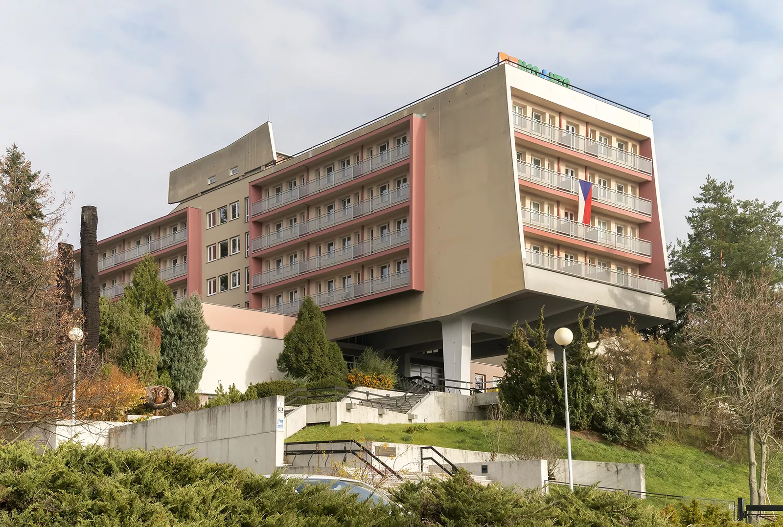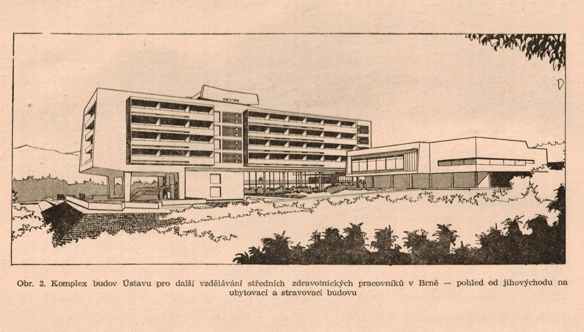 ‘The International [hotel] will be jealous!’ This was a 1967 newspaper headline on the architecture of the Brno building of the institute for the further education of nurses and allied health workers, known as the ÚDVSZP. The designer of the building was the architect Vladimír Selzer working in the framework of the project Zdravoprojekt [Healthcare Project]. He recruited two designers, Miloš Holeček and Vladimír Holič, who elaborated an unusual design for the structure and foundations of the six-storey accommodation facility. As with the Hotel International, the National Centre building is an example of Czech brutalism in the context of Czechoslovak architecture and is inspired by the post-war designs of Le Corbusier and Marcel Breuer. Vladimír Selzer came up with an extraordinary solution for the sloping site on Vinařská street: he moved the 100-metre-long main body of the accommodation wing out from the steep terrain of the Jiráskova čtvrť district (today’s Masarykova čtvrť) towards the Brno Exhibition Centre. This created a 12-metre height difference between the northern and southern parts, and, at the same time, gave its users breathtaking views from Žlutý Kopec hill out onto the valley below. The requirements of the Department the Chief Municipal Architect and the city plan gave rise to a piece of architecture that is significant not only for its appearance but for the structural design by Holeček. However, at the outset, the construction company Pozemní stavby [Land constructions] wanted to build a rather unimaginative prefabricated construction because of the speed and ease of assembly. In the end, a cast-in-situ reinforced concrete monolith was decided upon, in the forming of which Selzer and Holeček demonstrated the quality of individualized architecture of the 1960s. Their work was preceded by a detailed land survey of the southern slope of the Pisárky valley, as the construction site was in a very highly valued recreational and residential part of the city with views over the grounds of Brno Exhibition Centre. The original concept consisted of three parts: the main accommodation building and two lateral administrative and educational wings. This solution would prove very practical, especially in the gradual nature of the construction of the project, which was carried out between 1965 and 1969. It was originally scheduled for completion in 1968, but the arrival of Soviet occupying forces delayed construction work. In the first phase, work began on the main accommodation wing for 250 beds. Thanks to the demanding and highly specialized engineering geology survey by R. Svoboda, J. Křivinka and L. Hojsák, it was possible to complete the building in a very short time, even though the 2-hectare site had unstable and diverse subsoil. The open skeleton of the building, a four-storey reinforced concrete grid facing the exhibition grounds, was set on two massive supports. The front of the building is formed by a seven-metre cantilever, which is the structurally most complicated element of the entire construction. This feature was quite rare in the architecture of the Eastern Bloc and its use was a contemporary refinement that both determined and enhanced the architectural expression of the building. The double-pile central passage building consisted of four above-ground floors with an axial network of 6–3–6 metres, each containing 29 double rooms. A unit was made up of a hall, sanitary facilities and a loggia. The furnishings were made to order. In addition to the rooms for accommodation, there were also study rooms, a 90-metre-square common room, a kitchen and a laundry and drying room. On the second floor, besides the above-mentioned configuration, there was also a language laboratory and a soundproofed study room with modern audio-visual equipment. The central area of the main building was the entrance hall located on the first floor, from which it was possible to access the classrooms and corridors leading to areas for study and dining on the same floor. The vertical thoroughfares were the two lifts and staircases running through the building all the way down to the basement, where the library, snack bar, telephone room and other service facilities were originally located. In their free time, visitors and users of the building also had the use of a large terrace adjoining the entrance hall. The original design included the utilization of the 400-square-metre area on theroof of the building for sunbathing and taking in the views. Another recreational feature in the design was a 6 x 12-metre swimming pool with artificial sandy shore set on the slope beneath the accommodation building towering above it. The final stage in the construction of the complex was the merging of dining and teaching wings into one and subordinating it to the main building. The two-storey building can seat up to 160 people. It has its own kitchen with appropriate facilities and storage space for its operations, and can deliver up to 400 meals per day. The building consists of a reinforced concrete skeleton filled with masonry. On its southern side, there is an above-ground floor that projects out by three metres resting on a series of columns. This shaped section of the south wall of the dining room is the dominant feature with its 24-metre long by three-metre high windows. The building is connected to the monolith by a covered passageway, which also leads to the entrance hall, car park and access road. Because the site covered two hectares, it needed landscaping and gardening work. The design was done by Otto Eisler, who harmonized the surrounding environment with the architecture of the building by planting new trees and making use of the existing shrubs. From the outset, it was envisaged that art works would be designed for both the exterior and interior of the building. These were created by Zdeněk Macháček (wooden sculptures), Pavel Navrátil, Fr