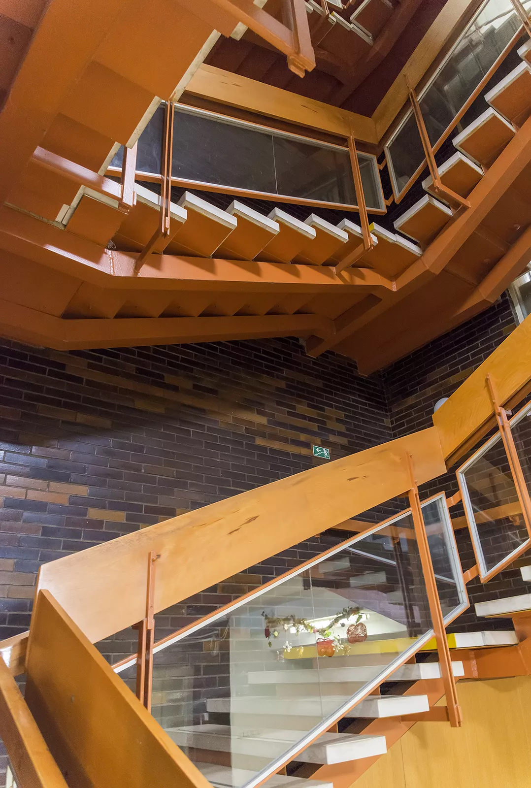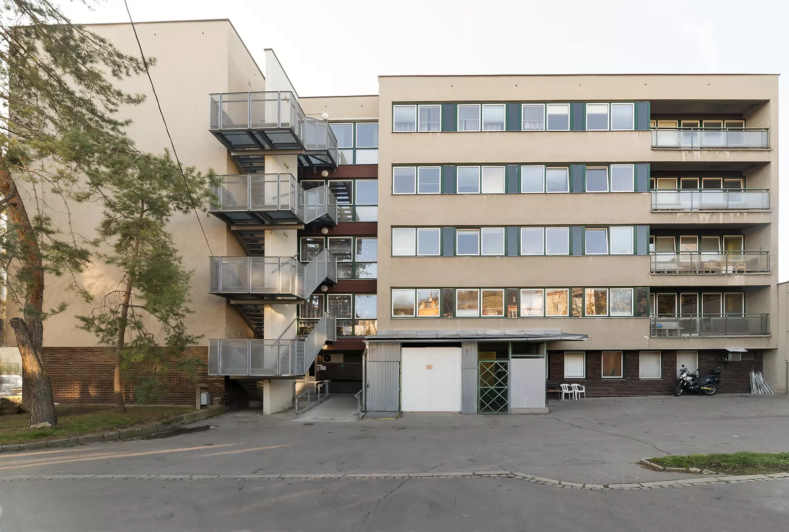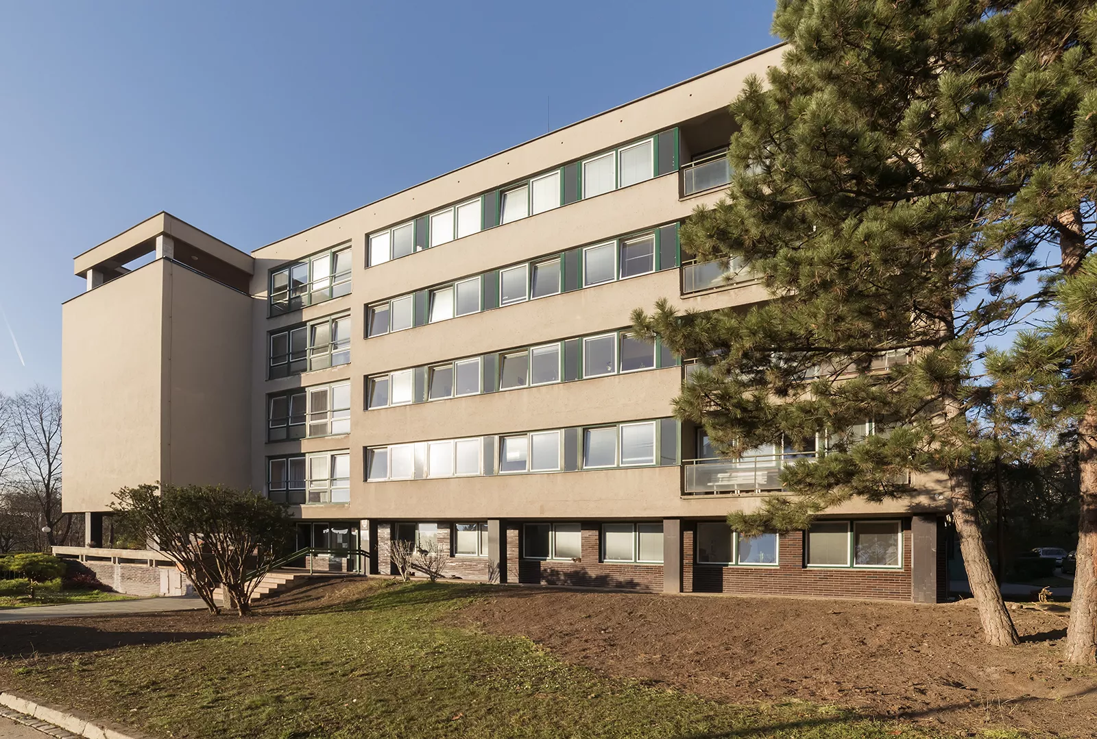 The retirement home on Nopova street was based on a design by Zdeněk Tihelka and František Kopřivík. It is located in a quiet part of Židenice, between the park Tyršuv sad and the Church of St. Cyril and Methodius. The complex of buildings, which was completed in 1978, is situated on the edge of a garden intended for relaxation and communal activities. The whole site is naturally screened off from the surroundings on its north-eastern side by gently sloping terrain, at the top of which lies Viniční Street. Nopova Retirement Home was built on the initiative of the South Moravia Region National Committee in Brno using a prefabricated reinforced concrete construction (MSOB construction system). On the eastern side of the main building, there are two small ground-floor technical buildings. The complex layout of the retirement home, which is also reflected in its exterior, is based on the connection of two buildings by means of a spacious corridor with staircases and lifts. Building A has five floors and a large bed capacity. Part of main façade is formed by a monolithic protruding corner with roof terrace and covered porch on steel pillars. There are French windows on the floors above the main entrance and horizontal strips of windows that end in loggias. The window frames are green and the ground floor entrance to the building has a light beige roughcast plaster façade and ceramic brick-effect cladding. The halls provide access to quadruple rooms on each floor, encircling a rectangular shaft with staircases and lifts that connect the communal areas and dining room. On the top floor, the hall opens up into an uncovered roof terrace above the front corner entrance. |Building B has three floors and a simple longitudinal configuration oriented towards the garden. In terms of its internal structure, it has a lower bed capacity and is much less complex when compared to building A. Two-room cells with en-suite bathrooms are situated along straight corridors leading communal and connecting spaces. In the interior, which has largely been preserved in its original state from the late 1970s, there is extensive use of ceramic brick-effect cladding and wood panelling, with sliding doors fitted in the dormitory part. However, this interior of the retirement home has been designated for reconstruction in the near future, arising from the needs of its current clientele who cannot be properly catered for with the original design. The wood panelling of some areas seems particularly problematical from the perspective of contemporary fire prevention. In addition, the corridors are not wide enough for manoeuvring immobile residents, and both the layout of rooms and poorly illuminated communal and connecting areas are unsuitable for the care of seniors with Alzheimer’s disease. ŠB
