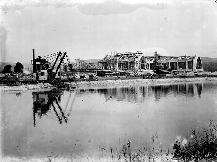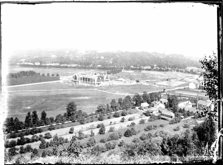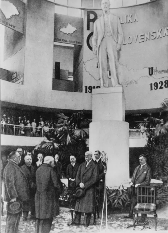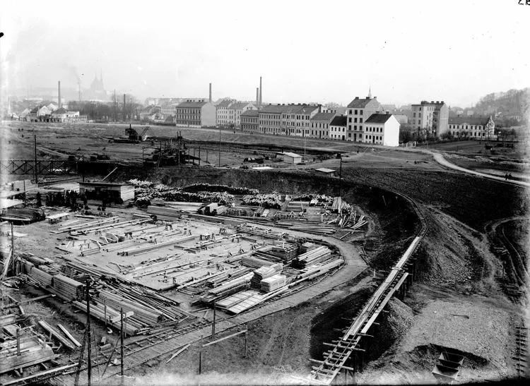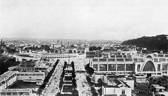 The building of individual exhibition halls was preceded by the exploitation of gravel and its processing on the building site, which helped decrease costs and accelerated the construction, as it was not necessary to transport the material for the ferro-concrete structures. Kalous's urban conception was developed by Emil Králík; the exhibition halls were laid out along two basic axes, forming a V shape dominated by the glassed-in tower of the Pavilion of Commerce and Trade by Bohumír Čermák. Unlike the progressive architectural designs of some structures the urban conception stemmed from Classicist and centralising tendencies. No sooner had visitors got off the tram onto the elevated platform of the electric tramway line designed by Bohuslav Fuchs, than they were greeted by a view of the impressive layout of the exhibition halls. After they passed through the segmented entrance gate, their attention was drawn to the pivotal point of the entire centre - the Palace of Industry and Trade, with its distinctive parabolic vaults. The design of the grounds also involved planting mature trees and installing ceremonial lighting on the occasion of the Exhibition of Contemporary Culture in Czechoslovakia. It was held there from May to September in 1928 with the aim to present the cultural and technical upswing of the young country in the first decade of its existence.