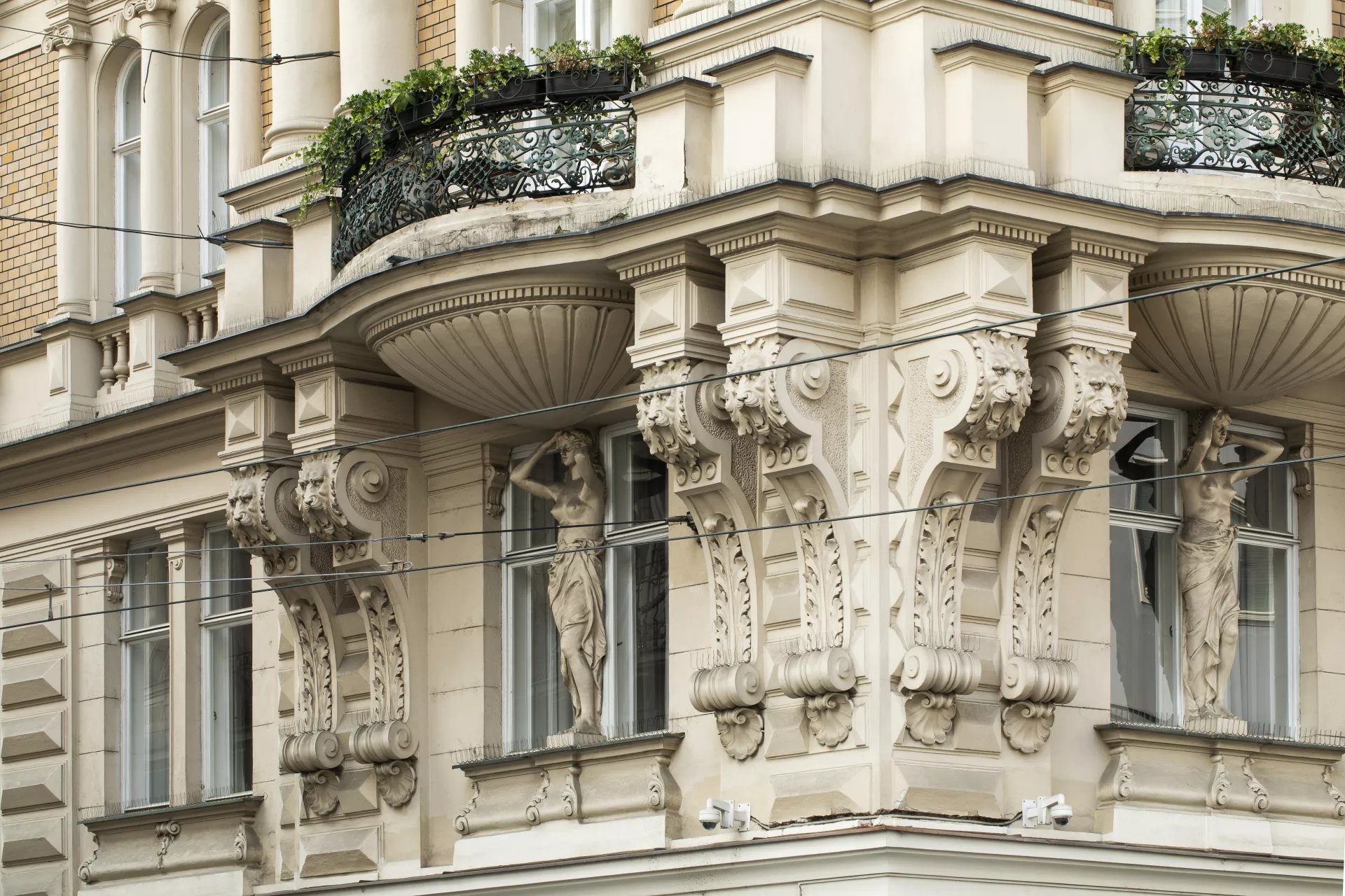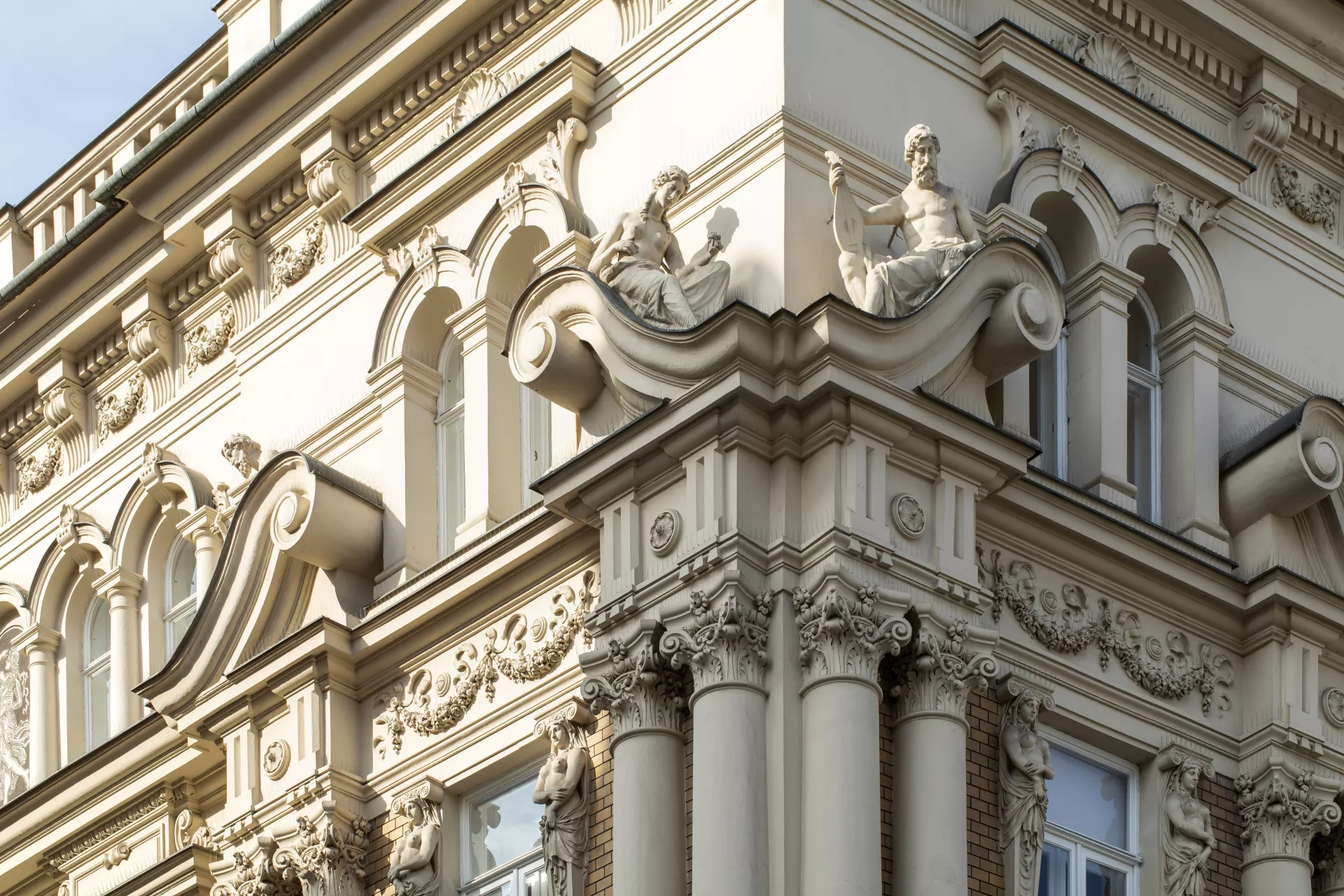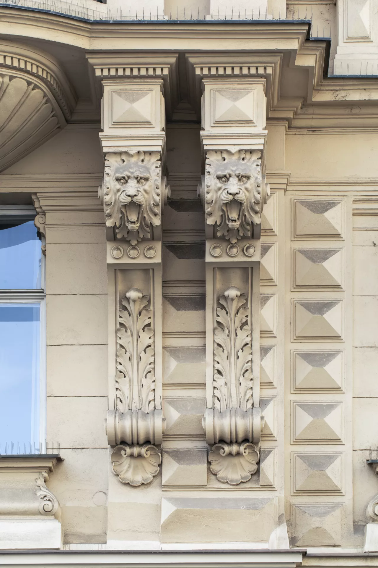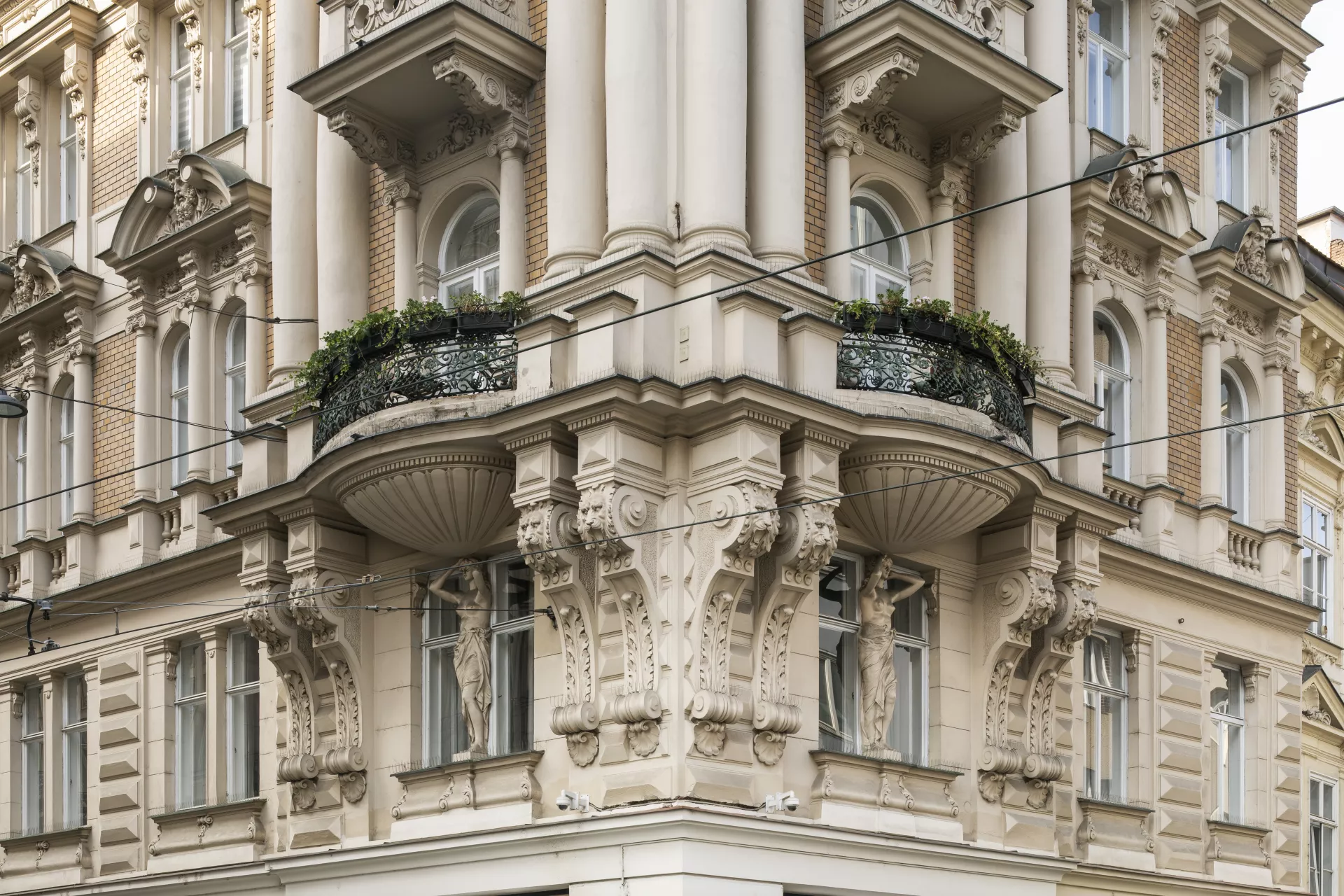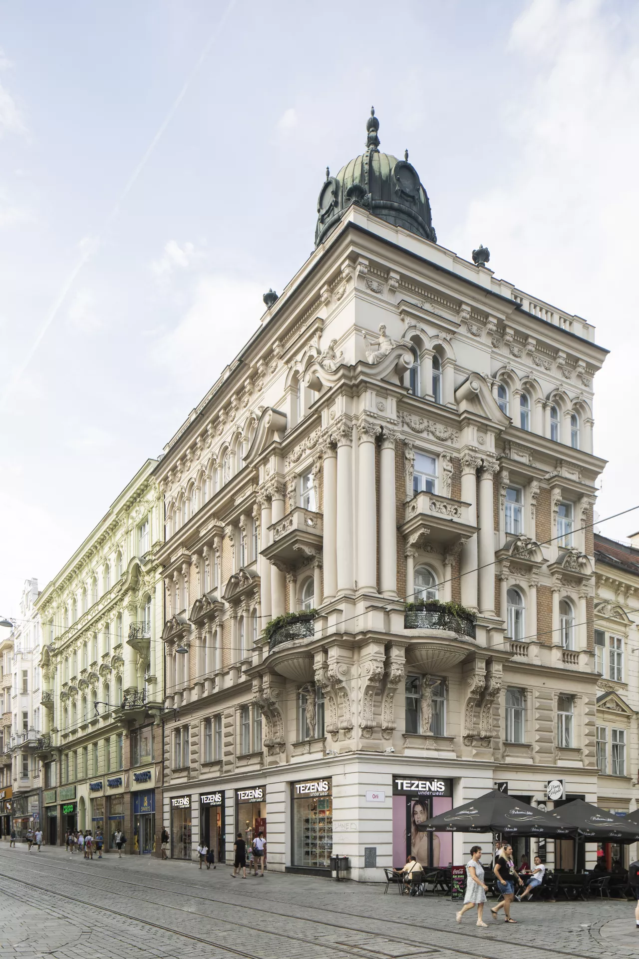 Třípatrový nájemní a obchodní dům Adolfa Stracha a jeho bratra Moritze patří k prvním stavbám v rámci brněnské asanace zahájené roku 1896. Ze všech brněnských ulic byla asanací nejvíce pozměněna právě Masarykova (tehdejší Ferdinandsgasse). Mezi oběti brněnské asanace nepatřily jen historické stavby, ale dokonce i stavitel domu bratří Strachů Josef Kuhn, který zemřel při demolici domu na náměstí Svobody. Projektantem budovy s bohatě zdobenou fasádou velkoměstského typu, situované na nároží ulic Masarykovy a Orlí, byl vídeňský architekt Wilhelm Stiassny. Její význam dokládá skutečnost, že v roce dokončení o ní vyšel podrobný článek v časopise Der Bautechniker. Podle něj Stiassny stavbu nejen navrhl, ale ve všech částech ji také vedl – což znamená, že při její realizaci prováděl autorský dohled. Článek dokládá původní funkční rozvržení domu, včetně půdorysů. Sklepní patro s nízkými cihlovými klenbami bylo určeno pro sklepy, zatímco nyní slouží pro vinárnu. Suterén s klenbičkami do traverz nyní hostí restauraci, ale zpočátku v něm byly skladovací prostory obchodů v přízemí, s nimiž byly propojeny kovovými točitými schody. Obchodů bylo v přízemí celkem pět a tři z nich měly vzadu sklady, nyní je tu jediný velký obchod se zázemím v mezaninu. Původně však byl v mezaninu umístěn byt, stejně jako ve všech třech patrech domu. Jediný velký byt v každém podlaží sestával ze salonu, čtyř pokojů, velké předsíně, koupelny, spíže, kuchyně, pokoje pro služku a záchodu. Přístup k bytům je veden domovním vstupem z Orlí ulice po schodišti podkovovitého tvaru. Půdorysně zalomený malý dvůr má funkci osvětlovací šachty, když v úrovni přízemí je zčásti zastavěn, a to kuchyní bytu domovníka (s jediným pokojem). Opulentní eklekticistní stavba upoutává pozornost svými fasádami. Právě jim je v uvedeném článku v odborném časopisu Der Bautechniker věnována značná pozornost, což stojí za citaci (v překladu a s mírnými úpravami): „Mezipatro přečnívající nad přízemím je zvýrazněno bosáží. Na ně navazují obě architektonicky propojená hlavní patra. Roh domu je na obou stranách zvýrazněn rizalitem, rámovaným sestavou sloupů, procházející oběma zmíněnými hlavními patry. Každý pár sloupů stojí na společném podstavci, jenž spočívá zase na dvou mohutných konzolách dosahujících téměř celé výšky mezipatra. Mezi dvojicemi sloupů je v každém poschodí umístěn balkón. Poslední patro se vyznačuje obloukovým členěním a úseky stěn mezi okny jsou zdobeny sgrafity. Rizalit je završen vysoko strmící kupolí. Ta je zhotovena z kovu, má bohatě zdobená okna, mohutně profilované žebrové členění a je korunována figurou stojící na ozdobném podstavci (nedochována). Ostatní úseky fasád tohoto domu jsou završeny balustrádami. Celá fasáda je bohatě dekorována architektonickými, ornamentálními a figurálními ozdobami a skýtá harmonický dojem.“ Pozornost upoutává zvláště sochařská výzdoba, autorsky dosud neurčená: maskarony, karyatidy, figury na volutových křídlech atd. Dle citovaného článku je fasáda provedena ve stylu „moderní francouzské renesance“, což lze chápat spíše jako příklon k pařížskému velkoměstskému stylu než skutečně k renesanci, neboť mnohé prvky mají barokní původ (tehdy ovšem ještě mnozí vnímali baroko jako „zdivočelou renesanci“). Vídeňská historička umění Inge Scheidl považuje za specifikum architektonického rukopisu Wilhelma Stiassného zálibu pro mohutné detaily, zčásti manýristicky expresivní, zčásti působící až disproporčně hrubě. Uplatňoval ji u budov pro náročné stavebníky v exkluzivní poloze, což platí právě pro dům bratří Strachů s jeho výraznými volutami, mohutnými sloupy a silně plastickým dekorem, jenž je dodnes s výjimkou obchodního parteru v přízemí, dochován v původních tvarech.