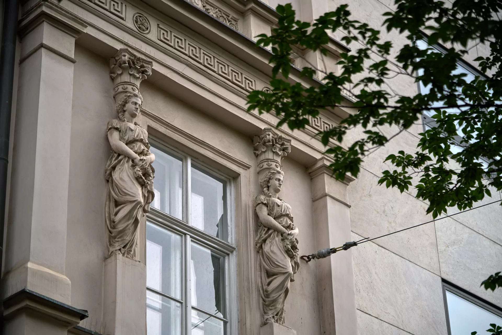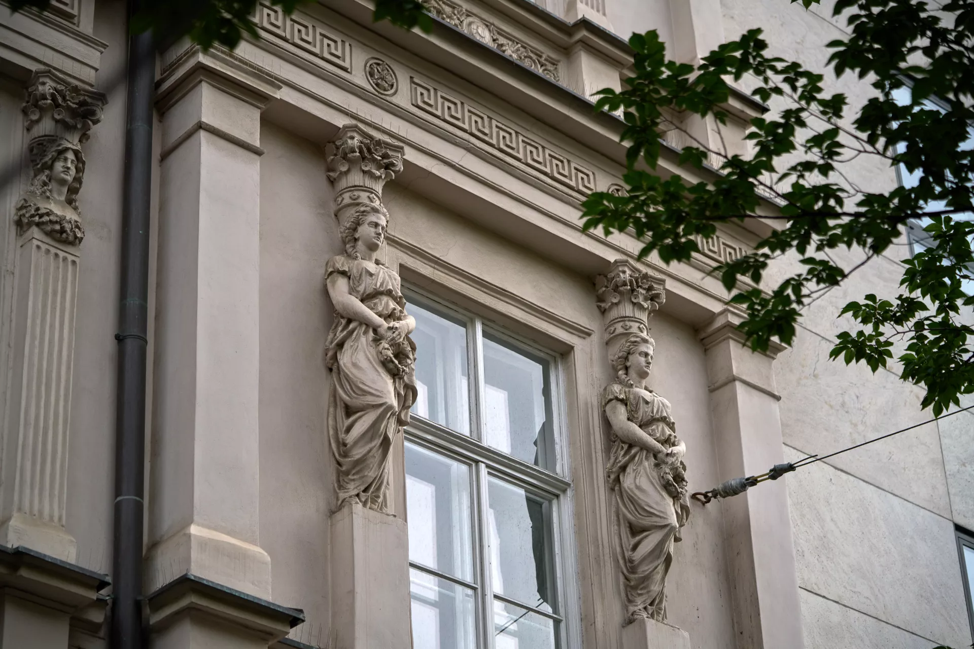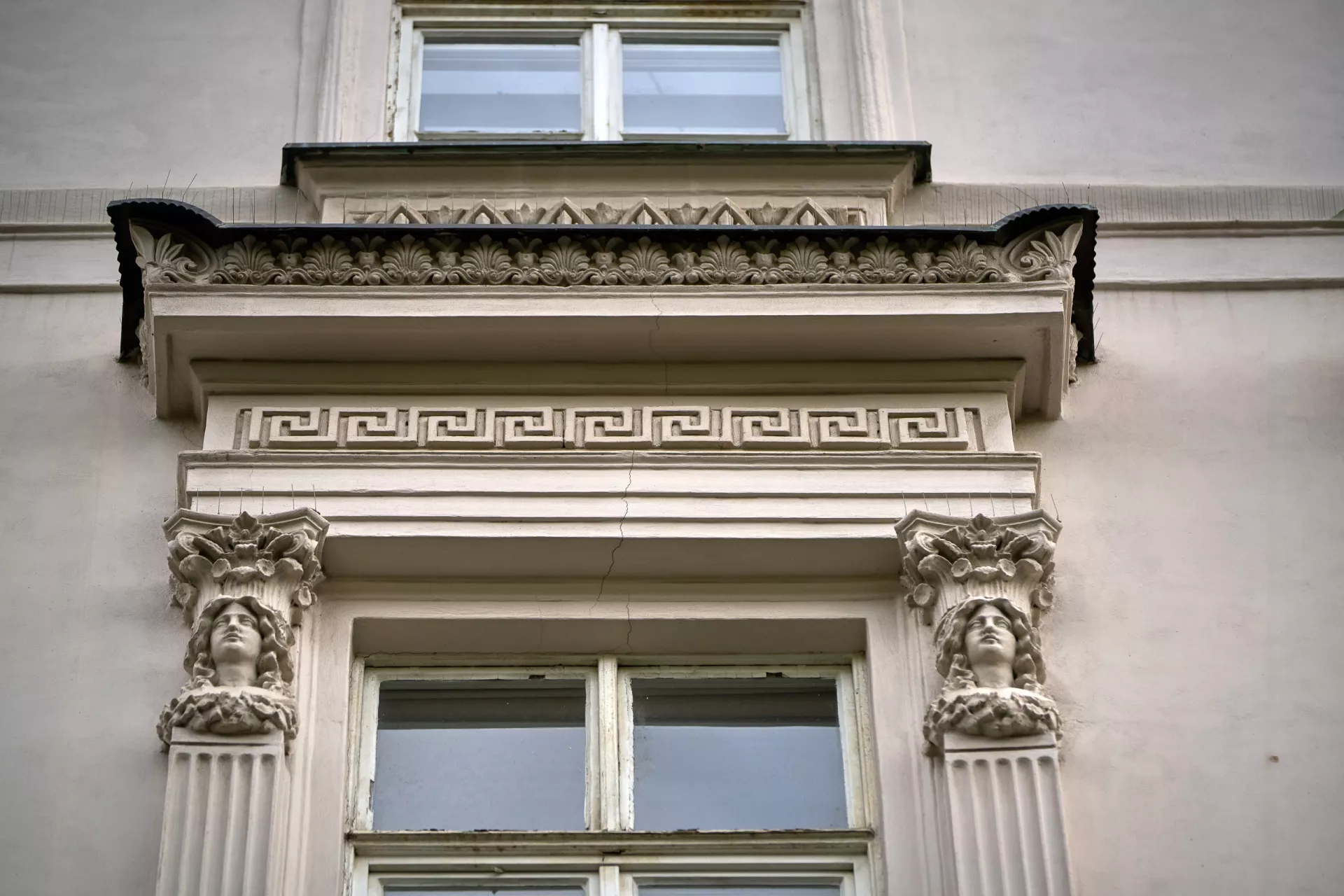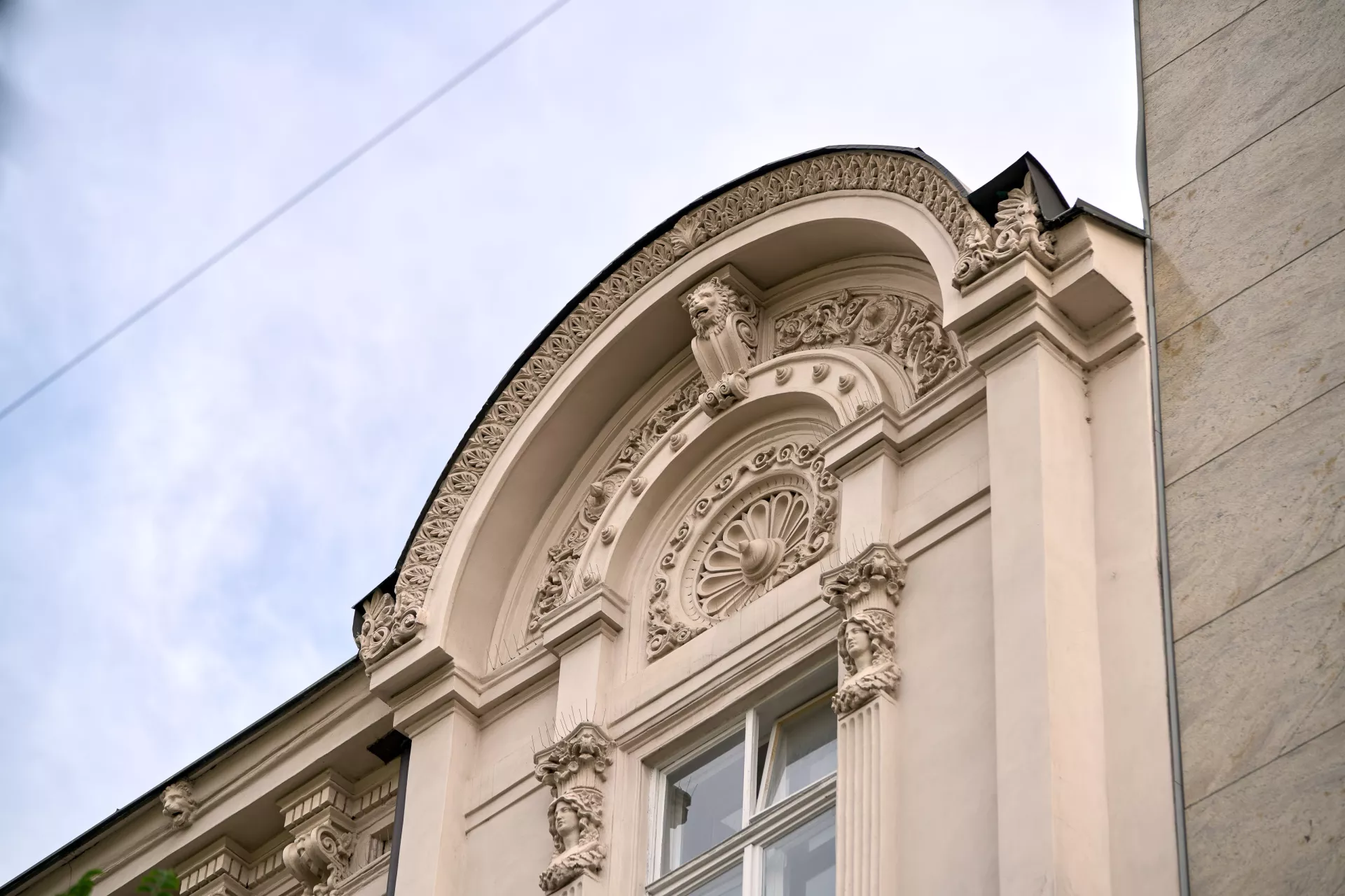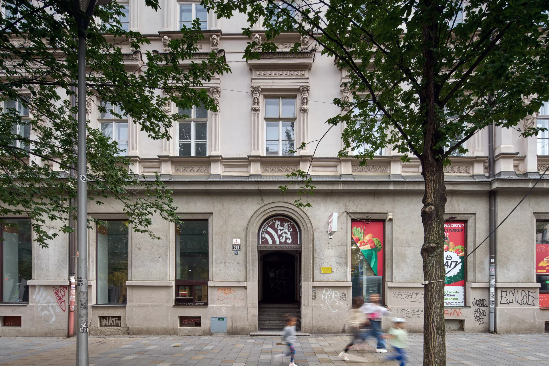 Vysoké nároky nájemníků dům splňoval nejen svou polohou na moderní třídě, ale i architekturou. Fasáda čtyřpodlažního domu je koncipována přísně osově v novorenesančním stylu. Krajní osy zvýrazňují mírně vystupující rizality zakončené půlkruhovými atikovými štíty, okna prvního a druhého patra mají výrazné suprafenestry podpírané pilastry s ženskými bustami nesoucími korintské hlavice, na nichž leží dvojitý překlad zdobený meandrem a palmetovým vlysem. Na antiku odkazující ornamentální detaily nalezneme rovněž v rámování štítů, kde se vyskytují vyjma palmet i akroterie, okna prvního patra krajních os doplňují kariatidy s vavřínovými věnci. Suverénně provedené výzdobné motivy jsou patrně zčásti z terakoty zčásti štukové a svou stylovou podobou zapadají do Exnerovy práce na začátku 80. let 19. století, kdy začínal svou kariéru stavitele využívajícího vlastní návrhy. Za první republiky proběhla úprava fasády přízemí, které bylo zjednodušeno osekáním členění a jeho nahrazením hrubou šedě probarvenou tvrdou omítkou evokující kámen.