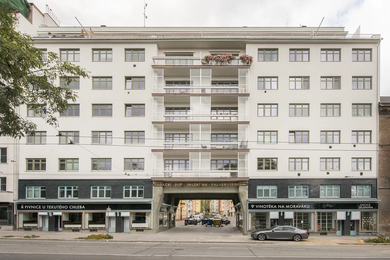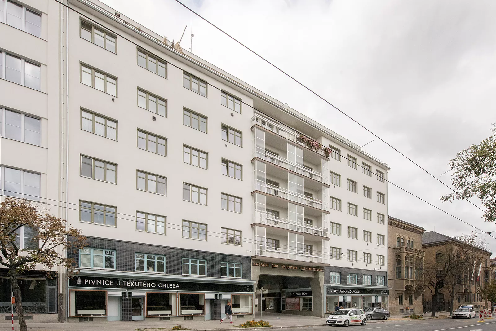 Valentin Falkensteiner byl významný brněnský podnikatel a mecenáš, který se celý život aktivně zabýval péčí o sociálně slabé a podílel se také jako člen zastupitelstva na správě města. Po jeho smrti v roce 1884 byla podle znění podnikatelovy závěti zřízena nadace, která měla spravovat jeho nemalé jmění a poskytovat prostředky na dobročinné účely. Nadace, jejíž správy se ujalo město Brno, se podílela na stavbě sociálních ústavů a podporovala handicapované a sociálně znevýhodněné. Zdrojem jejího financování byly cenné papíry a nájemné ze sedmi domů v centru města, které nadace vlastnila. V roce 1934 si podle návrhu architekta Oskara Pořísky nechala postavit nájemní dům na Moravském náměstí, který představoval bydlení pro střední vrstvy na okraji promenádní okružní třídy. Jeho centrální průchod nesený železobetonovými nosníky tvoří monumentální bránu do nově vytvořené ulice Mášovy. Hlavní průčelí sedmipatrové stavby je nad průchodem rozděleno vertikálním pásem prosklených lodžií, poslední ustupující patro je vybaveno terasou. Přízemí tohoto bytového komplexu se využívá pro komerční účely. PH Na konci roku 2017 byla dokončena zdařilá rekonstrukce celého objektu podle projektu architekta Josefa Javůrka.
