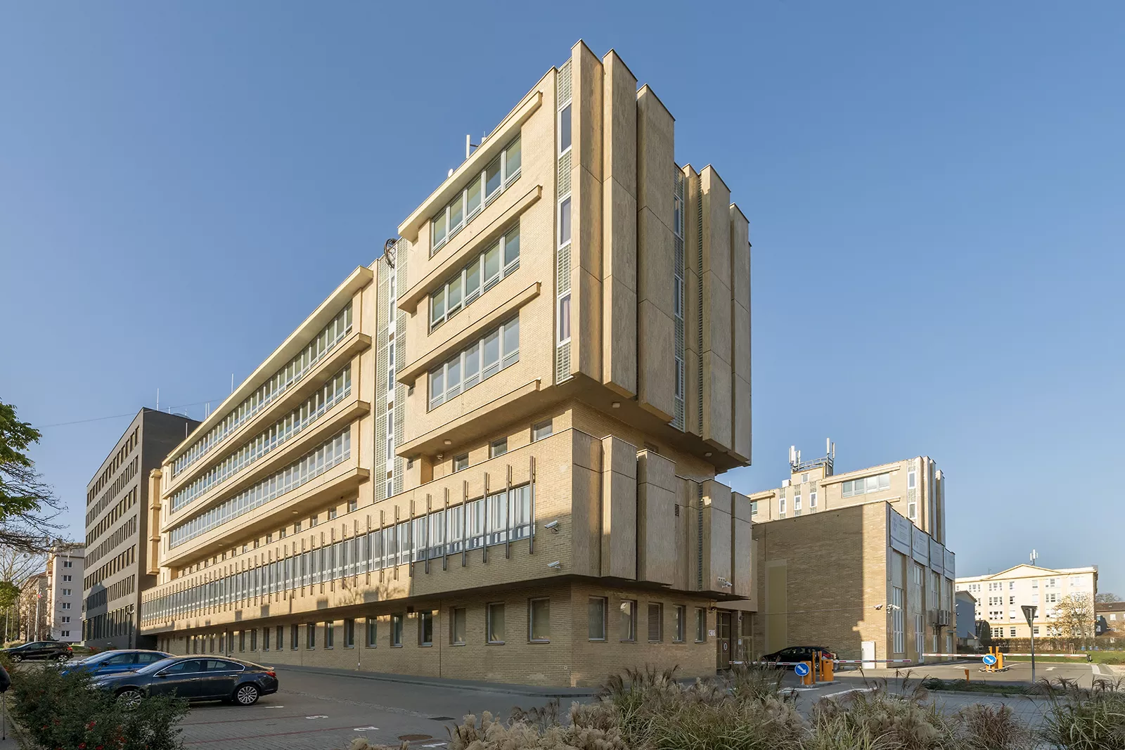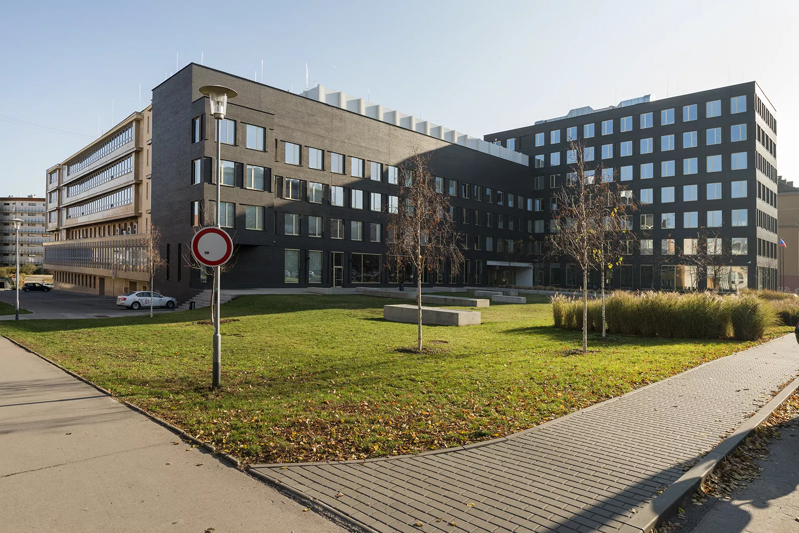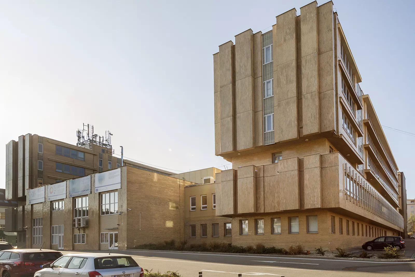 V místě bývalé továrny na smaltované zboží, částečně zničené během druhé světové války, byl po postupné asanaci nevyužívaného areálu navržen rozsáhlý objekt pro čtyři různá výzkumná pracoviště: Závod pro výzkum a projektování Pozemních staveb Brno, Ústav racionalizace řízení a práce Praha, Výzkumný ústav dopravní Žilina a Výzkumný ústav inženýrských staveb Bratislava. Těm již nevyhovovaly stávající budovy roztroušené ve městě a rozhodly se pod záštitou ministerstva stavebnictví ke sdílení jednoho areálu, kde by mohly společně využívat technologické zázemí. V architektonickém návrhu vytvořeném v Českém svazu výrobních družstev pracoval Jan Dvořák se dvěma totožnými šestipodlažními objekty, které propojoval nižší, pouze dvoupodlažní objekt, se vstupní halou s recepcí a kongresovým sálem. Vznikl tak areál na půdorysu písmene U, jejž v zadní části ještě doplnila zkušební hala. Zatímco boční křídla představovala zcela obvyklé dispoziční i hmotové řešení, běžné pro mnohé administrativní budovy té doby, architektonicky osobité bylo téměř výtvarně pojaté zpracování centrální části. Při pohledu zvenčí se nad proskleným parterem propisovala jako skutečná dominanta hmota jednacího sálu a vytvářela tak zajímavou a monumentální architektonickou figuru celého komplexu. Plasticitu tohoto řešení architekt Dvořák ještě podpořil vertikálním prolomením čelních fasád, což rytmicky rozehrálo celé hlavní průčelí. Působivost této koncepce umocnil šestimetrový kovový reliéf brněnské sochařky Sylvy Lacinové, který spolu se dvěma keramickými fontánami umělecky dotvářel kompozici hlavního vstupu do areálu. Řadou uměleckých děl byl dotvořen také interiér stavby. Ústředním dílem byl půlkruhový mobilní objekt se skleněným závěsem výtvarného umělce Jaroslava Svobody, který členil čekárnu pro hosty od ostatních částí vstupní haly. Schodiště doplňovaly kovové reliéfy Jiřího Fuska a Věry Krylové, systém orientačního značení navrhl brněnský grafik Jan Rajlich st. Výtvarná výzdoba byla uplatněna také v kongresovém sálu ve formě tapiserií manželů Ulmových, zrcadlového stropu autorů Vratislava Šotoly a Rudolfa Jurnikla a výtvarných děl Vladimíra Svobody v zasedací místnosti. Vědecké a odborné pracoviště tak bylo doplněno o funkci specifického kulturního centra, kde se počítalo s konáním výstavních akcí. Se změnou politického režimu získala areál Fakulta informatiky Masarykovy univerzity v Brně. Pro potřeby vysokoškolské instituce bylo nutné objekty částečně rekonstruovat a dispozičně upravit. Kromě modernizace poslucháren došlo k několika přístavbám zadního traktu, jimiž byl do té doby částečně otevřený dvůr uzavřen. Architekt Dvořák vedl kvůli stavebním úpravám se zástupci Masarykovy univerzity dlouhou dobu soudní spor. Po jeho smrti, kdy se výrazně snížila možnost uplatnit autorský zákon, přišly mnohem radikálnější stavební zásahy. Roku 2012 musel vstupní trakt areálu včetně zmíněných uměleckých artefaktů ustoupit novému architektonickému pojetí ateliéru Pelčák a partner architekti. Kdysi signifikantní vstupní křídlo nechali autoři nové architektonické koncepce odstranit a na jeho místě vystavěli nový vstupní objekt. Z původních výtvarných děl se dochovala pouze exteriérová plastika Sylvy Lacinové, jejíž budoucí osud je ovšem nejistý. Zachována zůstala i obě boční křídla budovy, pouze s úpravami schodišť a nezbytnými zásahy do dispozice. V detailech napojení ovšem postupovali architekti nanejvýš sebevědomě, kdy se nová stavba svým objemem do starších traktů doslova „nabourala“. ŠS