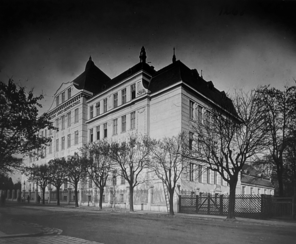 Trojkřídlá školní budova se suterénním polopatrem a čtyřmi podlažími byla vystavěna v letech 1910 (první výkop 15. června) a 1911 (závěrečný kámen vsazen 2. prosince) na Kounicově ulici 16 (tehdy Giskragasse 40, došlo k přečíslování) téměř ve stejné době jako Německá lidová a měšťanská škola na ulici Křenové 21 od téhož architekta. Franz Holik u těchto blokových staveb usiloval o soulad mezi konstrukcí a dekorem, monumentalitou a zdobností, přičemž největší důraz kladl na členitost střešních partií. V autorském komentáři ke stavbě reálky z roku 1912 chválil volbu stavebního místa „uprostřed školního okrsku“, v sousedství sadu na místě zrušeného městského hřbitova, což mu umožnilo realizovat volně stojící objekt mezi starými stromy. Napsal, že krajinnému okolí se přizpůsobuje malebná silueta budovy s členitým půdorysem a výškovým odstupněním při různém počtu podlaží, jakož i s nápaditou skladbou střech, střídavě sedlových a mansardových. Výtvarný efekt členitých střech je zvýrazněn tvarem (původních) střešních oken, na hřebenech čtyřmi špicemi a třemi věžičkami (ty slouží jako vývody ventilačního zařízení). Největší z nich korunuje mansardovou střechu středového rizalitu, v níž byl na straně do ulice umístěn hudební sál osvětlený třemi okny ve zvlněném štítu a na protější straně otevřená terasa. I tato, dvorní strana je výrazně pročleněna, zejména předsazeným tělesem trojramenného schodiště, k němuž jsou připojeny bloky toalet, završené trojúhelnými štíty, a ani zde nechybí dekor.