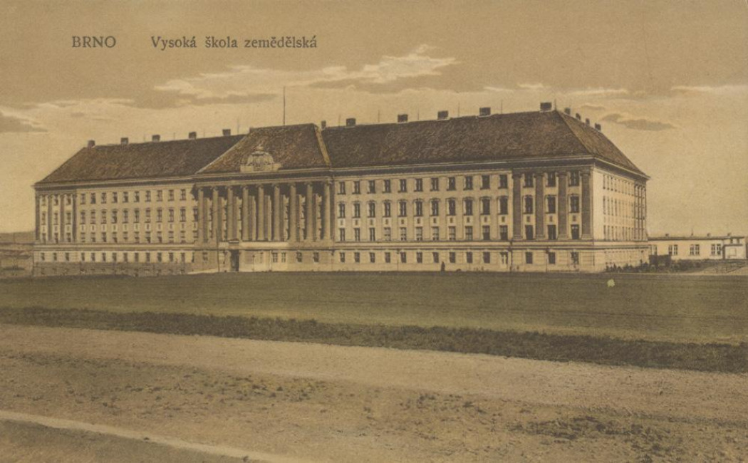 Na dispozičním řešení začalo pracovat technické oddělení Moravského zemského stavebního úřadu pod vedením Josefa Karáska. Na jeho základě byla budova v roce 1909 zadána stavitelům Robertu Krugovi a Leopoldu Kunischovi. V roce 1912 pak proběhla architektonická soutěž na fasádu hlavního průčelí, v níž zvítězil Theodor Macharáček, který získal první i druhou cenu. Třetí cenu získali architekti Jan Flora a Emil Králík a také jejich návrhy byl do konečného provedení průčelí integrovány. Definitivní prováděcí projekt ‒ jako syntézu vítězných soutěžních návrhů ‒ pak zpracovali opět zaměstnanci Moravského zemského stavebního úřadu, kteří původně navržený jednopatrový objekt zvýšili o dvě podlaží s podkrovím a zvýšeným přízemím. Monumentální budova pak byla postavena v letech 1913‒1915. Čtyřpodlažní velkoryse koncipovaná budova se stala výraznou urbanistickou dominantou kopce v Černých Polích. Neoklasicky pojaté fasády s bosáží v přízemí člení čtyři iónské pilastry na rozích stavby a výrazná střešní římsa. Průčelí dominuje monumentální portikus s devíti iónskými sloupy představenými ve výšce třech podlaží. Před něj je situován hlavní vchod, nad nímž je umístěn letopočet 1912–1915. Střecha nad portikem byla původně zdobena říšskou orlicí a císařskou korunou. Za první světové války sloužila škola především jako vojenský lazaret. V roce 1918 se sem nastěhoval ústav pro nevidomé, ale záhy v roce 1919 bylo levé křídlo objektu pronajato na dvacet let Vysoké škole zemědělské v Brně. V letech 1922–1923 byly rozšířeny prostory vysoké školy o dvě nová křídla Lesnické fakulty podle velmi konzervativního projektu zemského stavebního úřadu pod vedením Jana Utíkala (viz BAM C321), jenž svým pojetím navazoval na starší budovu. Po okupaci Československa byl v roce 1941 slepecký ústav i vysoká škola vystěhovány a objekt využívaly nacistické stranické a policejní složky. Po válce v roce 1945 byl ve správě československé branné moci a od září roku 1945 využíván výhradně pro potřeby Vysoké školy zemědělské (dnes rektorátu a ústavů Mendlovy univerzity v Brně).