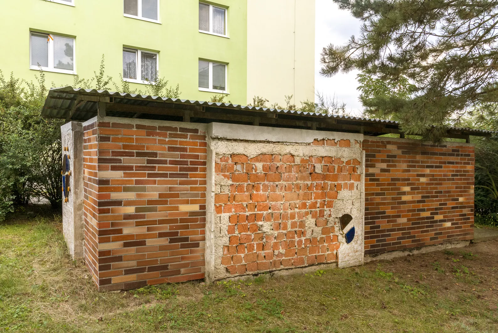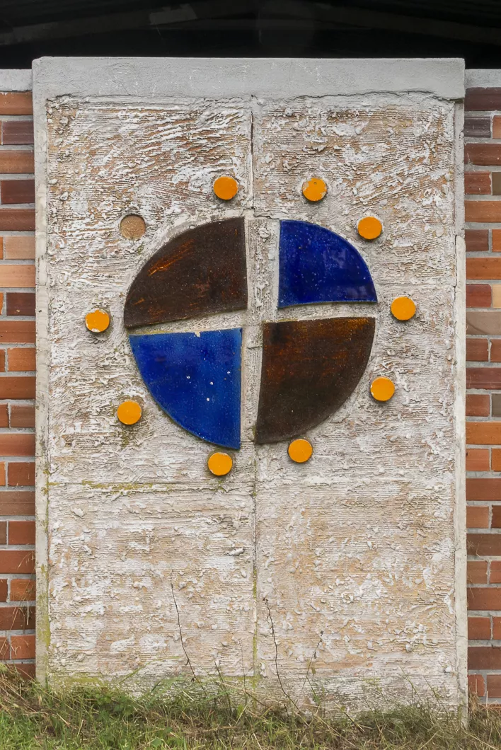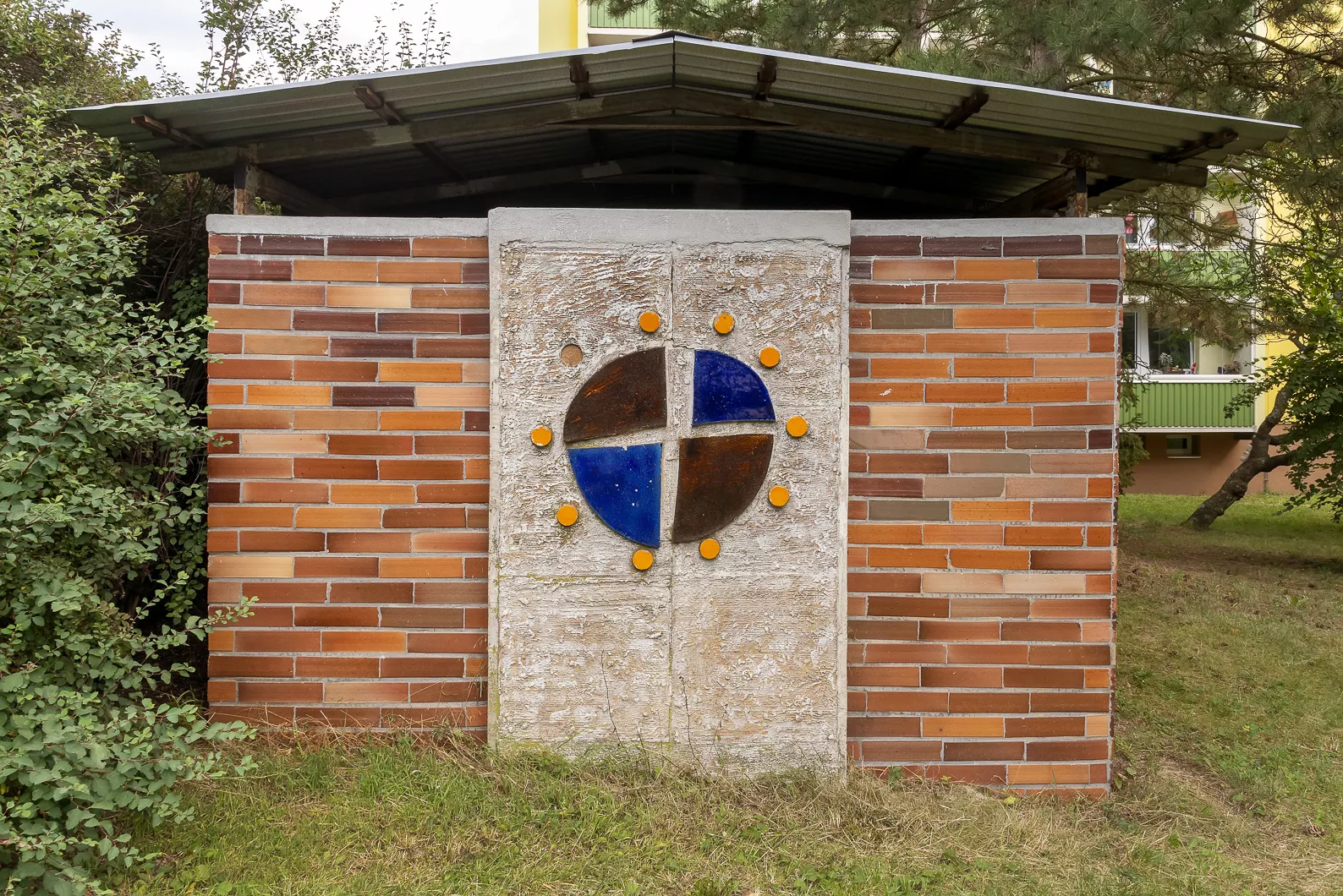 Stěna zděného přístřešku na popelnice, glazovaný keramický reliéf, polovina 70. let, 160 × 100 cm
